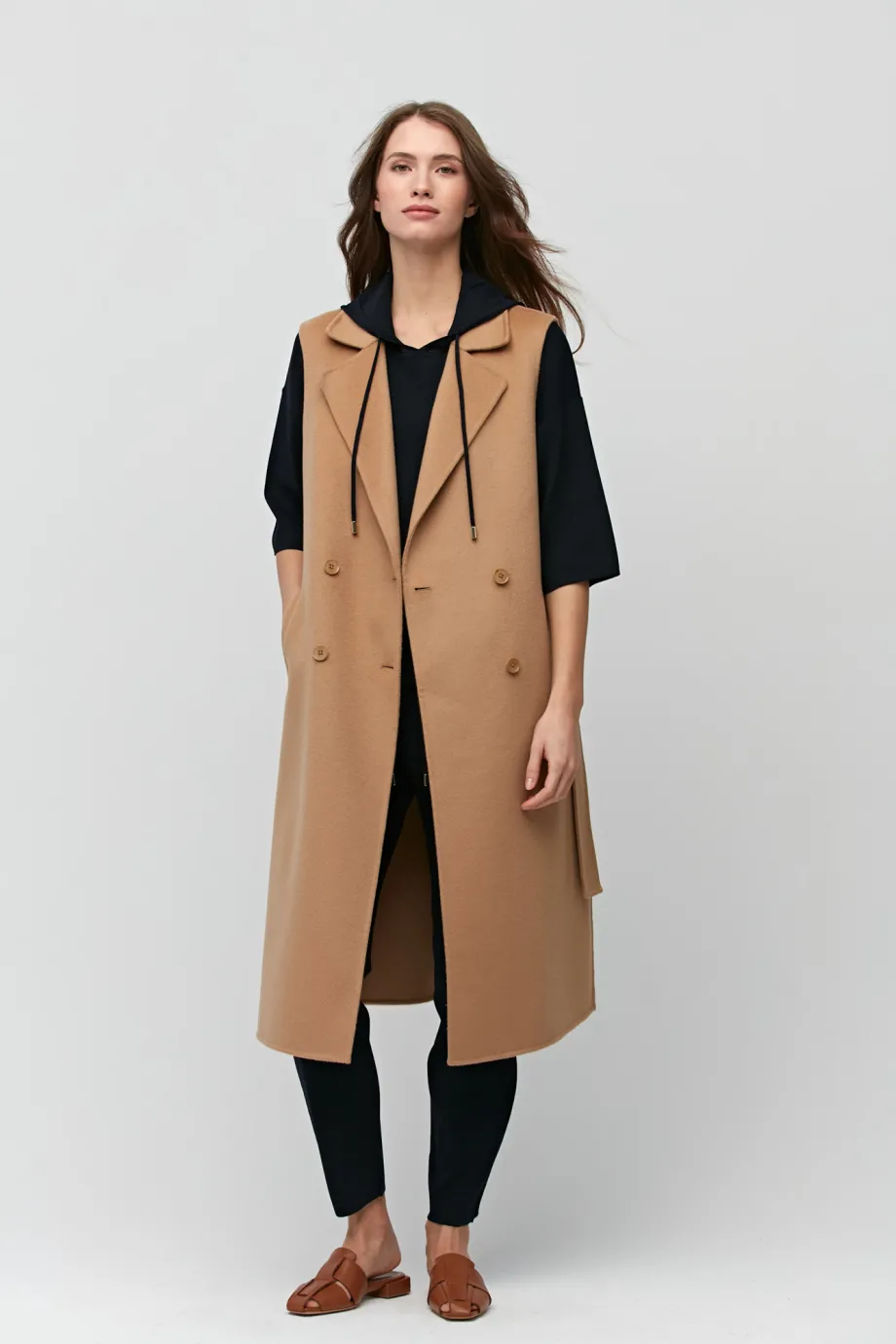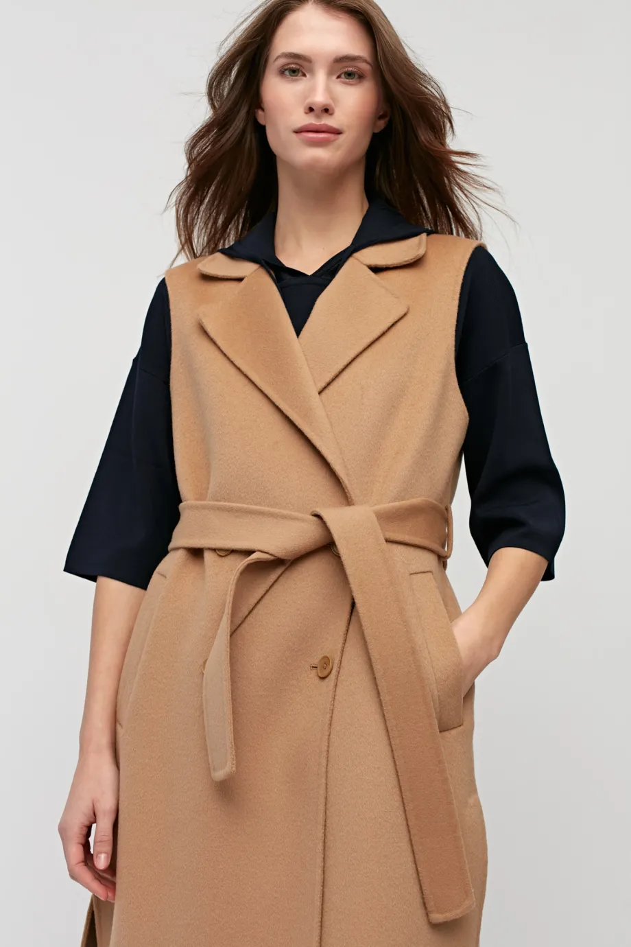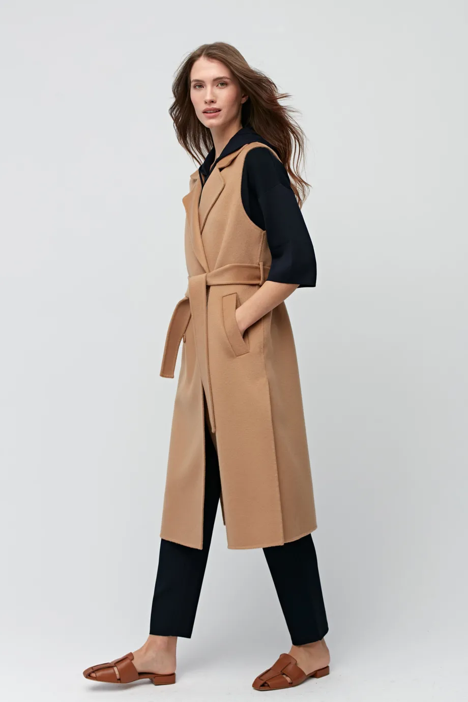 Camelul lung din lână este realizat în totalitate din lână doubleface de cea mai înaltă calitate. Modelul cu două rânduri de nasturi are o curea și buzunare laterale, oferind confort maxim. Poți să-l porți în diferite moduri - fie cu pantaloni eleganți, fie cu o bluză sport din colecția noastră. Kamizelka lungă îți va oferi confort și căldură, alege modelul nostru și convinge-te singură!
