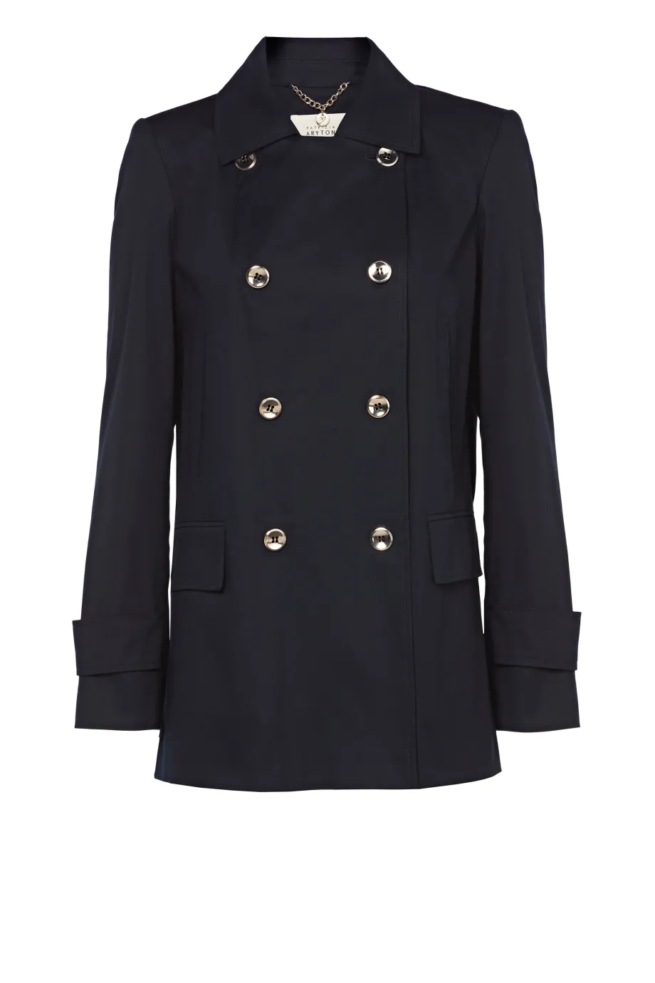 Epoleții, închiderea dublă și buzunarele îi oferă un aspect distinctiv.