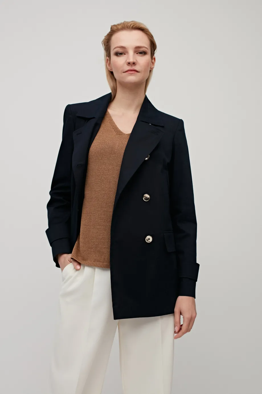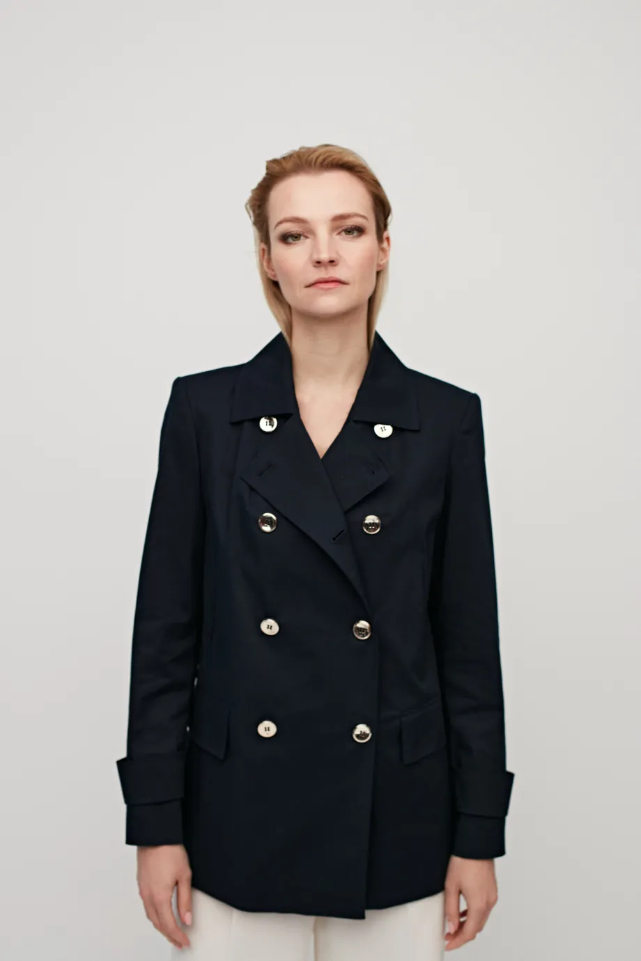 Jacheta de damă cu două rânduri de nasturi este potrivită atât pentru ținute elegante și formale, cât și pentru cele de zi cu zi.