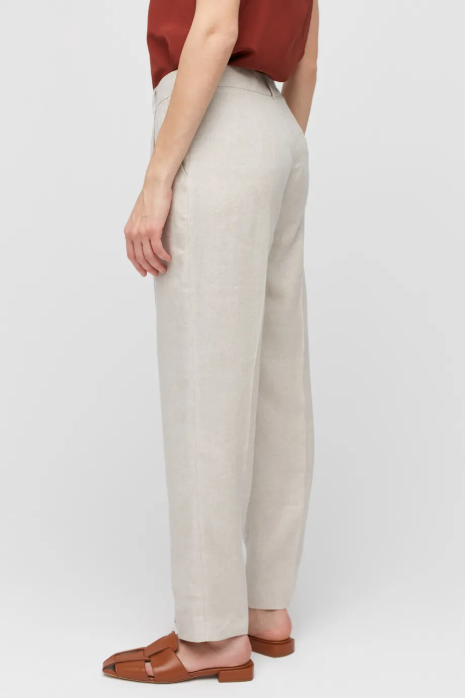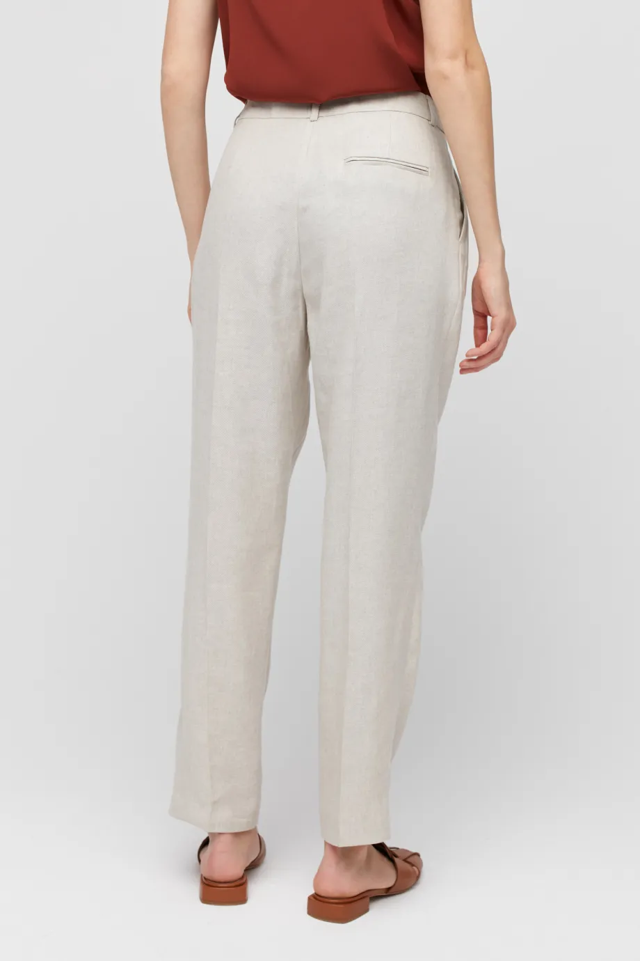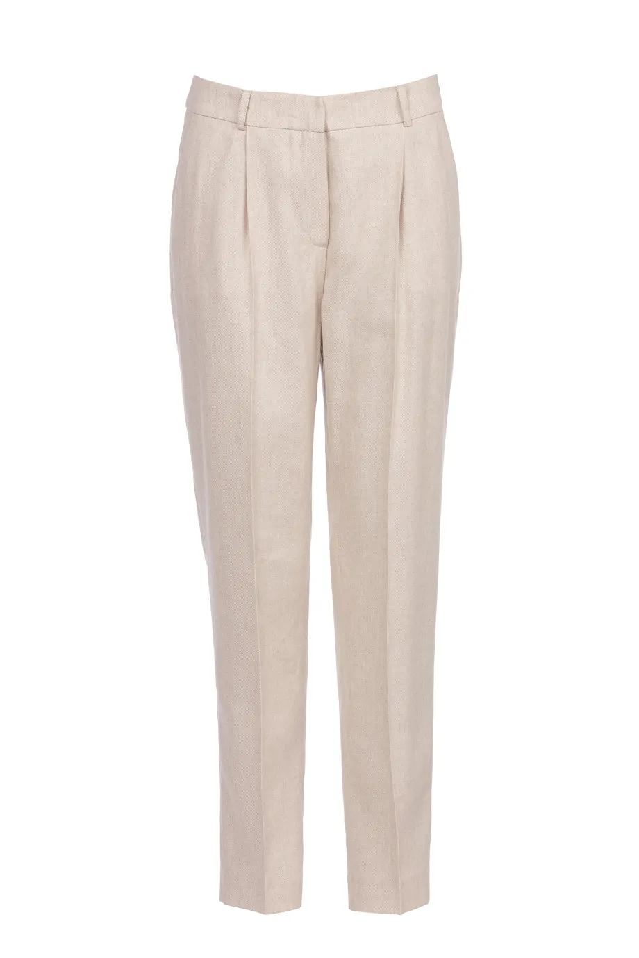 Pantaloni bej din in pentru costum, cu buzunare, găici pentru curea, fermoar ascuns şi pliuri în faţă.