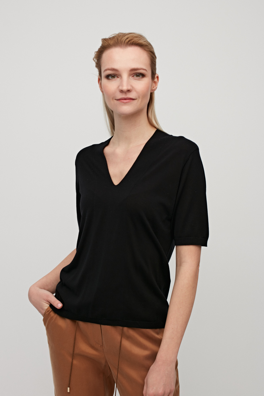 Bluza neagră cu mâneci scurte este unul dintre elementele obligatorii ale garderobei feminine capsule. Modelul de la Patrizia Aryton este un basic perfect pentru ținutele smart casual în perioada de tranziție sau chiar iarna. Totul datorită croiului universal și compoziției excelente a materialului, care oferă un aspect exclusivist, confort de neegalat și durabilitate a hainei pentru ani de zile.