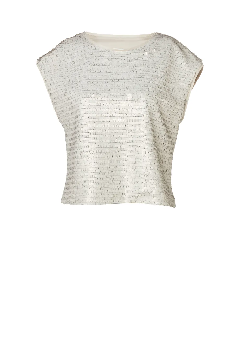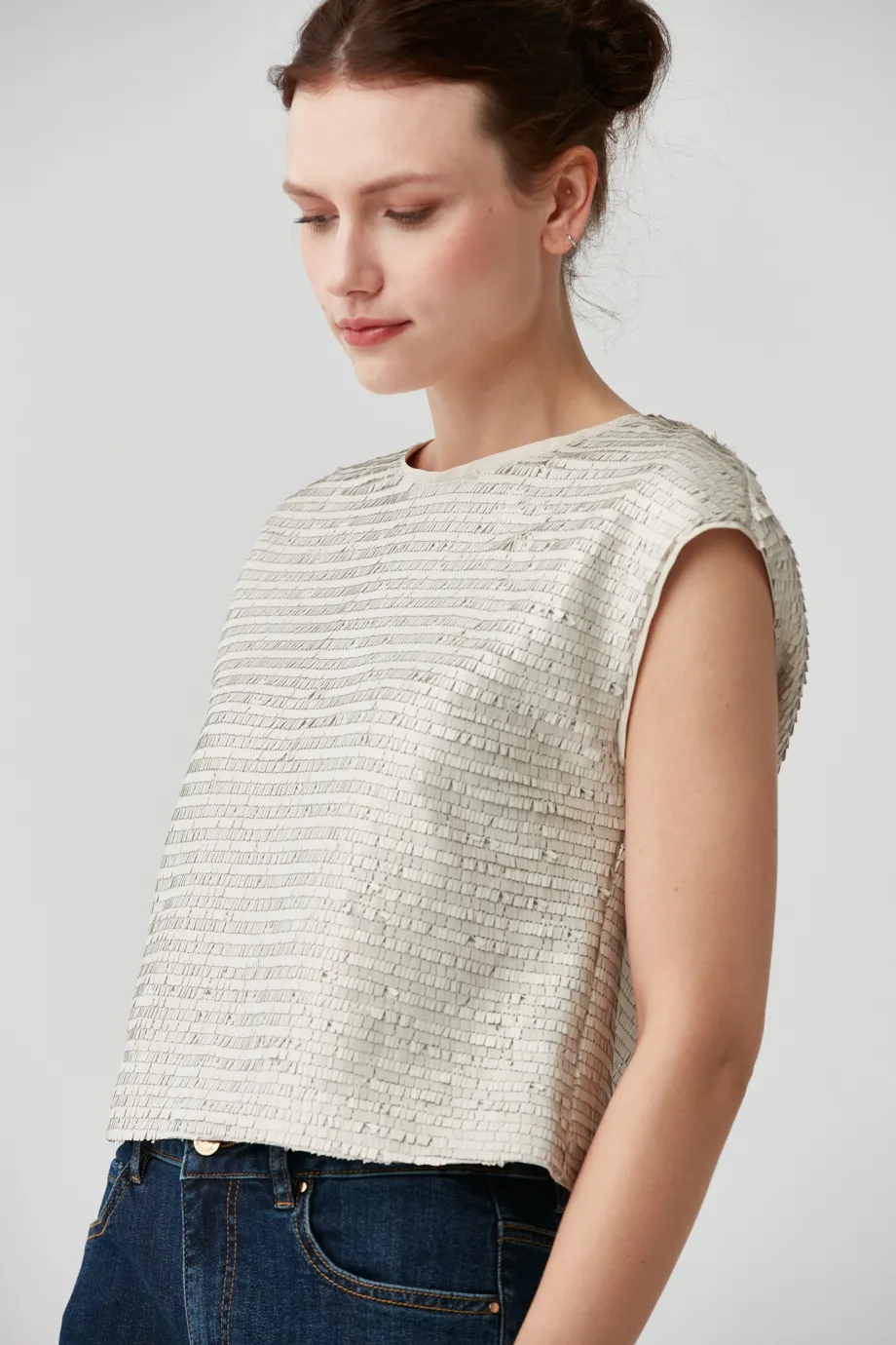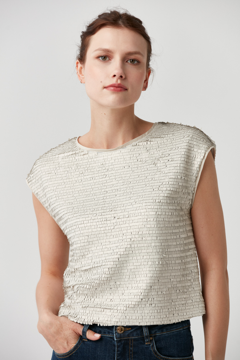 Topul nostru bej cu paiete arată că piesele spectaculoase pot fi integrate ușor în ținutele de zi cu zi.