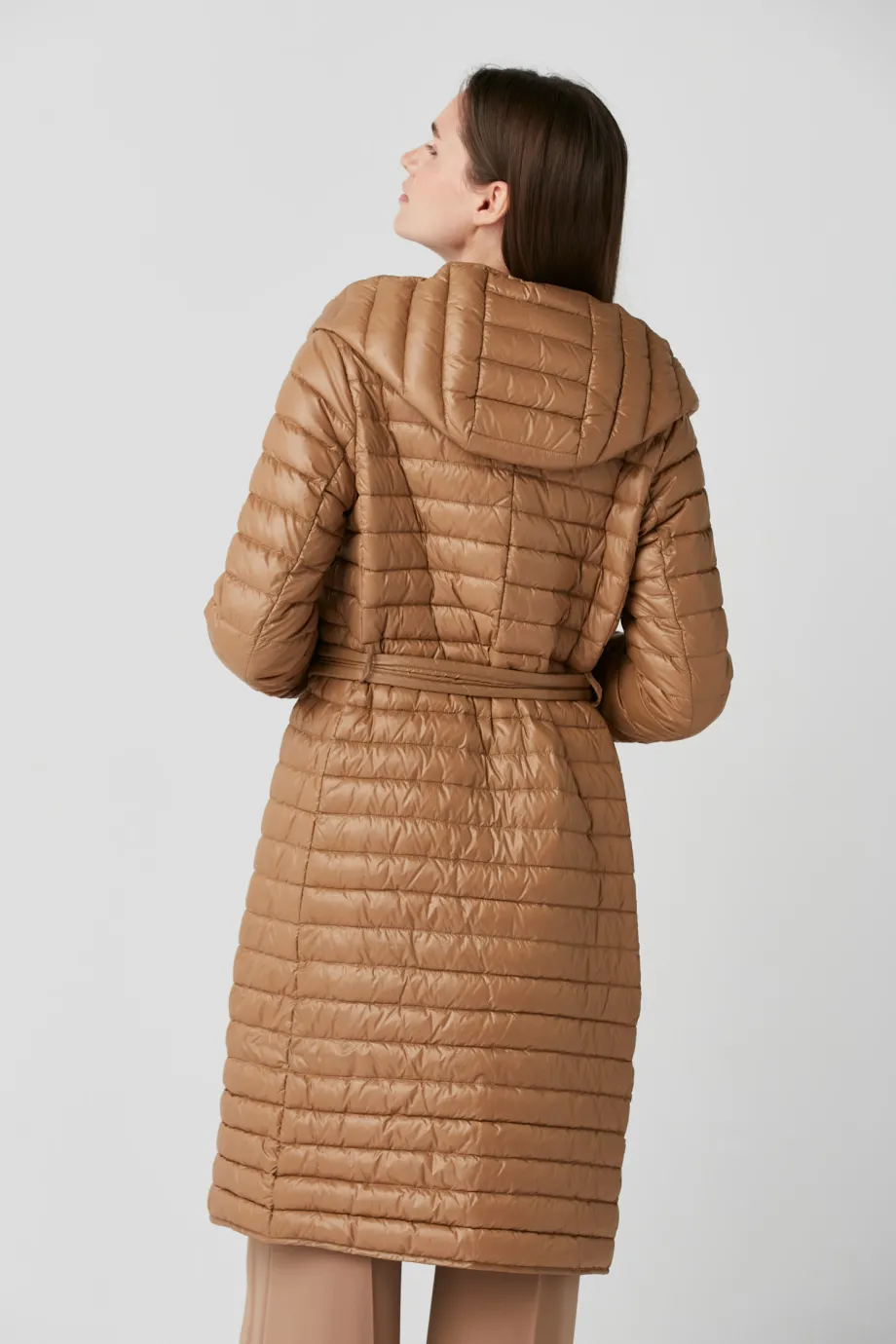 Jachetă Mila lejeră, din puf, cu glugă, culoarea camel