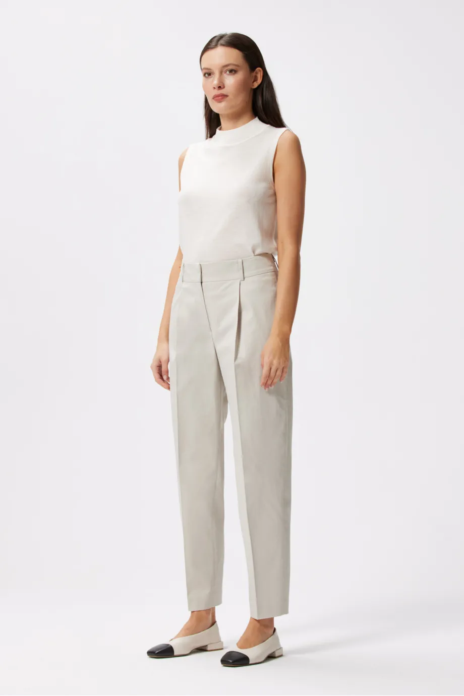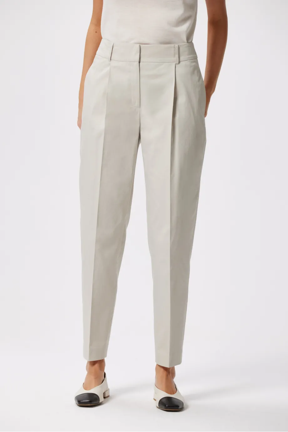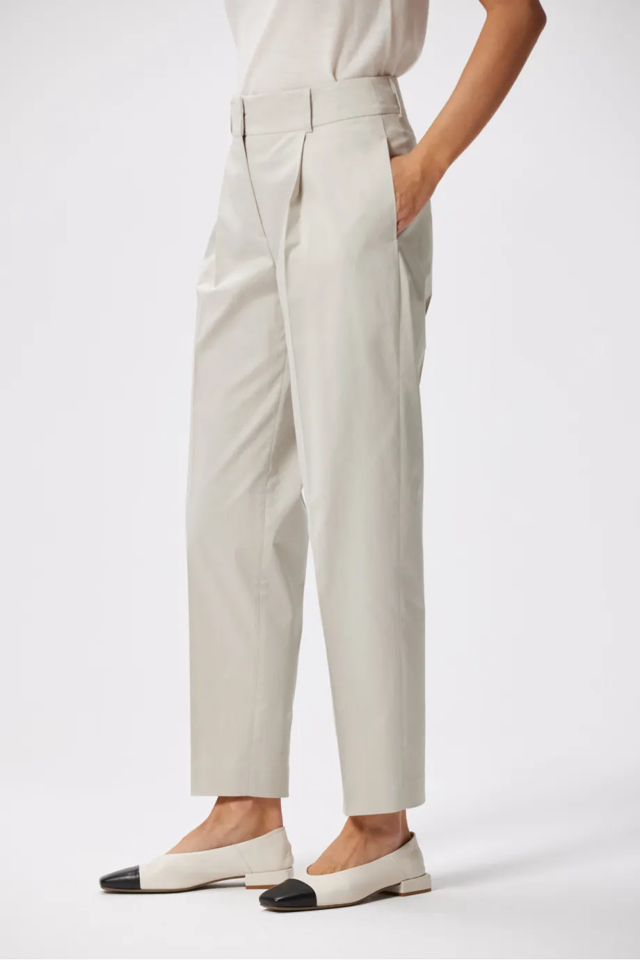 Clasic într-o interpretare modernă – aceștia sunt pantalonii noștri eleganți de damă bej. Realizați din bumbac delicat, fiecare detaliu este atent gândit: pliuri, fermoar ascuns, tiv interior și buzunare. Asortează-i cu sacoul pentru a crea ținute lejere și elegante pentru orice ocazie.