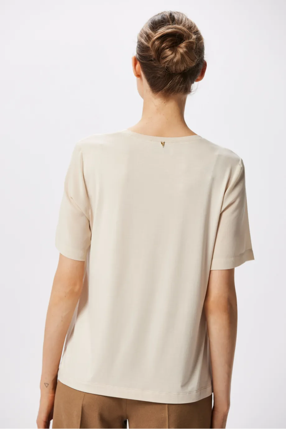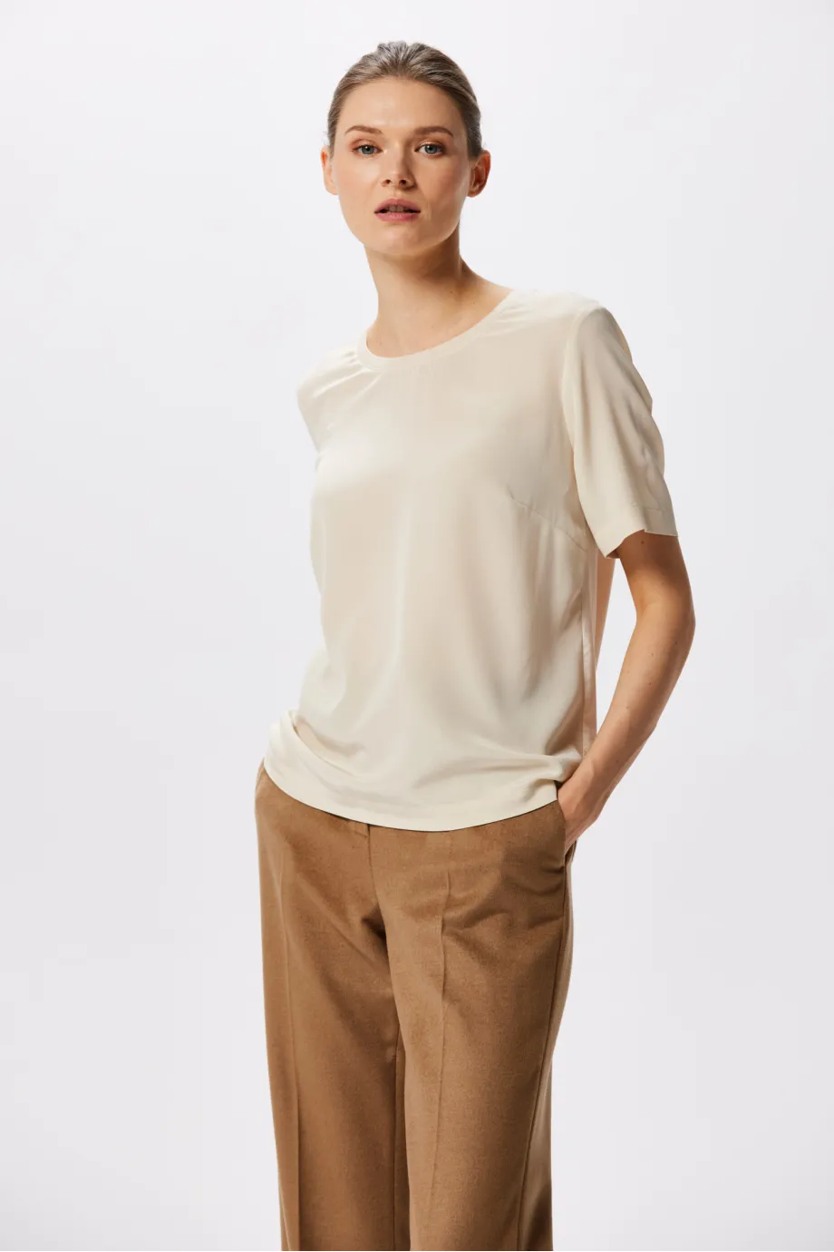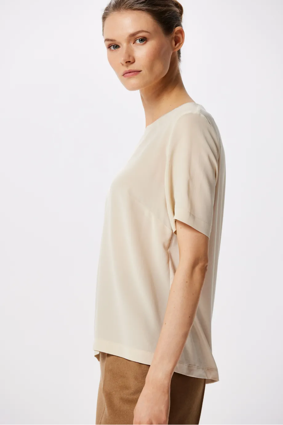 Bluza din mătase cu mânecă scurtă este un basic elegant, deja cunoscut, care apare în fiecare sezon în colecțiile noastre într-o nouă variantă de culoare. De această dată îți prezentăm varianta bej cald, o nuanță situată între camel și crem. Bejul Brigitte este o bluză elegantă purtată sub sacou, reprezentând linia Classic Line. Însă, dacă decizi să o porți cu jeans, vei fi cu adevărat surprinsă de efect! Introdu acest element exclusivist, deși simplu ca formă, în ținutele tale