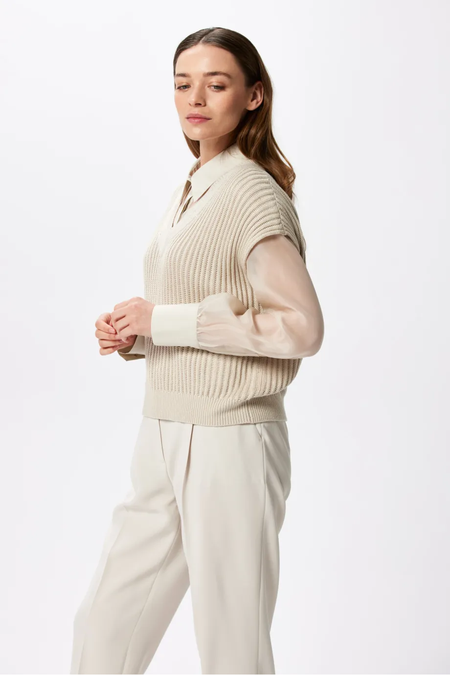 Pentru acest sezon de toamnă-iarnă am pregătit ceva special – capsula Atelier, în care domină nuanțele delicate cu contraste subtile. Colecția exprimă admirația pentru croitoria rafinată, noblețea materialelor și estetica desăvârșită a marilor designeri. Una dintre piesele emblematice este această bluză tricotată cu mânecă scurtă, care completează perfect garderoba zilnică printr-un accent expresiv, dar clasic, inspirat de împletituri artizanale.