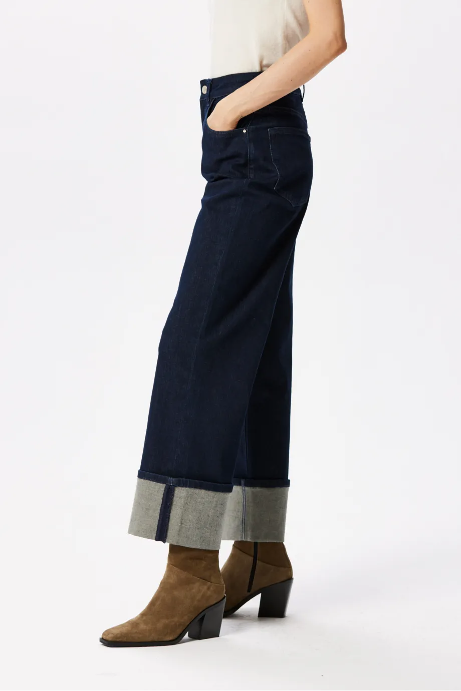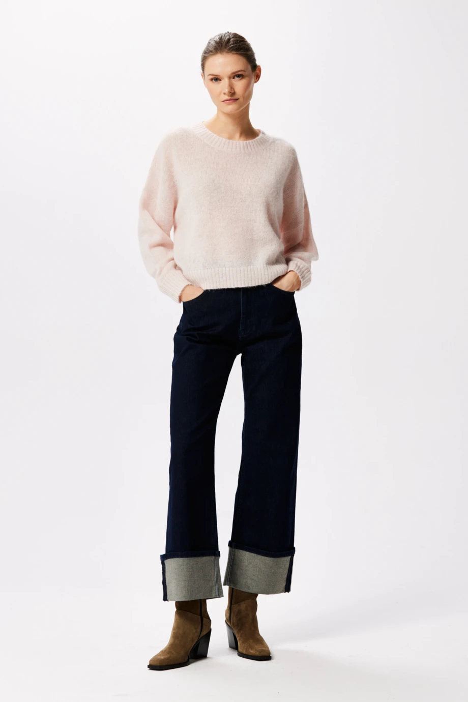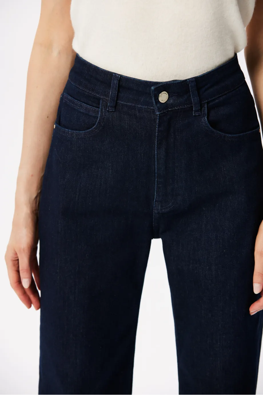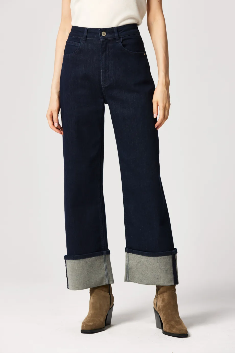 Jeansurile sunt un element esențial în orice garderobă capsulă. Acest model cu talie înaltă și manșetă lată evidențiază silueta și oferă un aspect modern și elegant. Este una dintre piesele-cheie ale sezonului, ideală pentru ținute casual sau smart-casual.