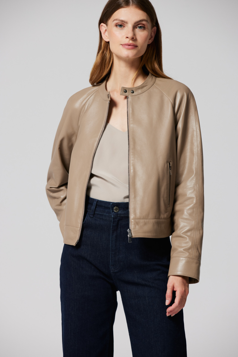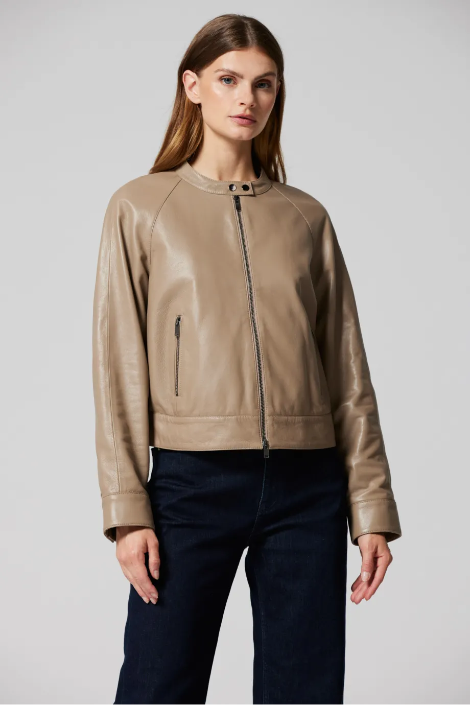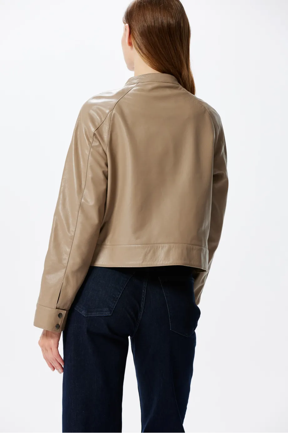 Jachetă cu guler din piele naturală, bej