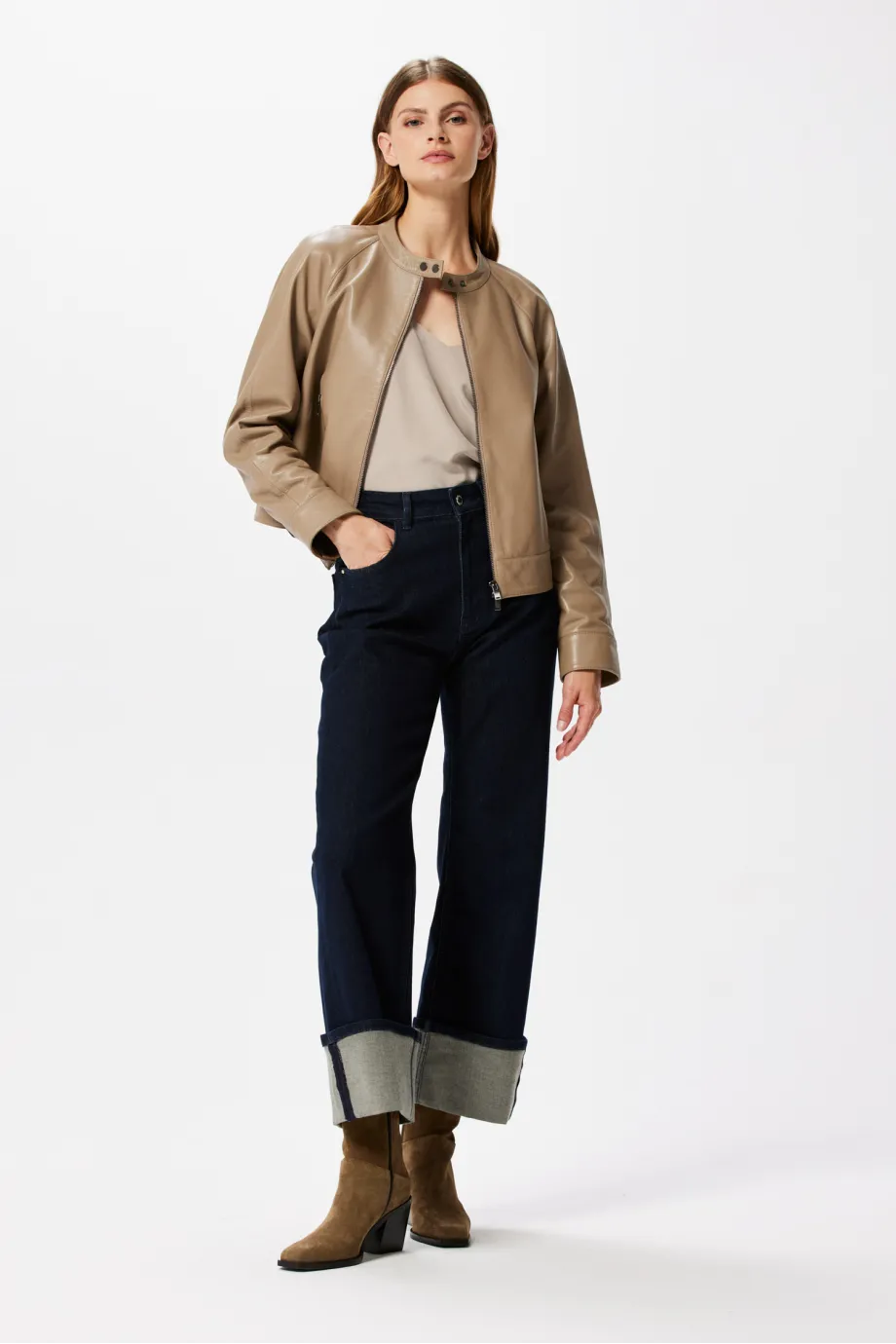 Poate fi purtată împreună cu pantaloni din aceeași piele