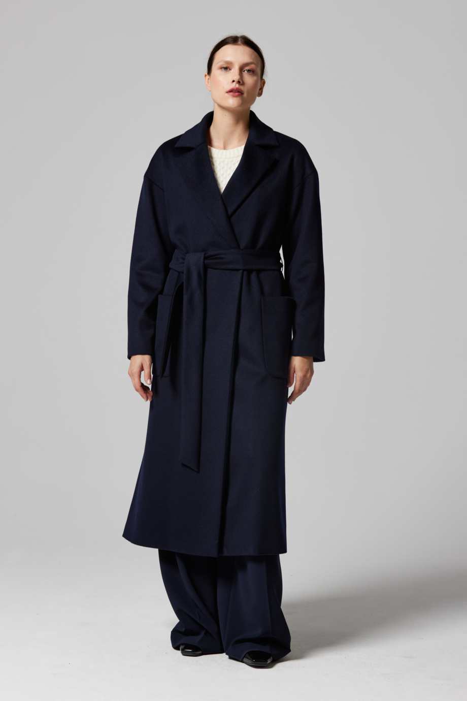 Palton bleumarin cu curea, din colecția actuală toamnă-iarnă Patrizia Aryton. Oferă protecție excelentă în zilele foarte reci, datorită proprietăților termice ale lânii și construcției bine gândite. Modelul se remarcă prin croiala sa versatilă, potrivită atât pentru ținute casual, cât și pentru apariții mai elegante.