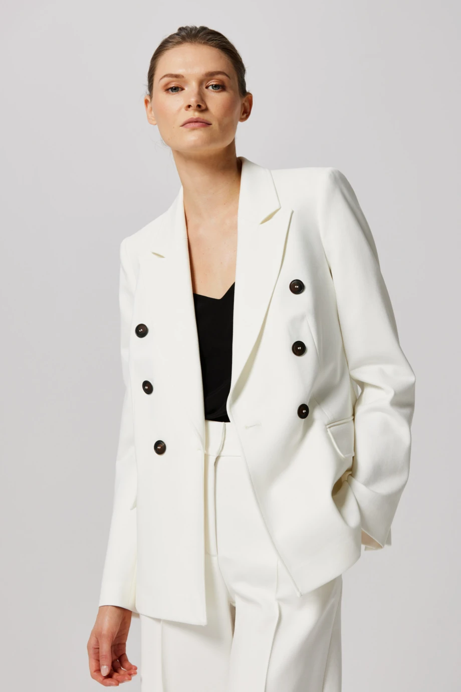 Sacoul alb double breasted Patrizia Aryton este potrivit atât pentru evenimente formale, cât și pentru apariții mai relaxate. Dacă albul pur nu este prima ta alegere sau vrei să adaugi în garderobă nuanțe deschise cu personalitate, acest model este o opțiune inspirată. Rafinamentul tonului cremos, accentuat discret de nasturii negri, precum și textura plăcută a materialului și croiala bine gândită îl transformă într-o piesă elegantă și ușor de integrat în diverse combinații.
