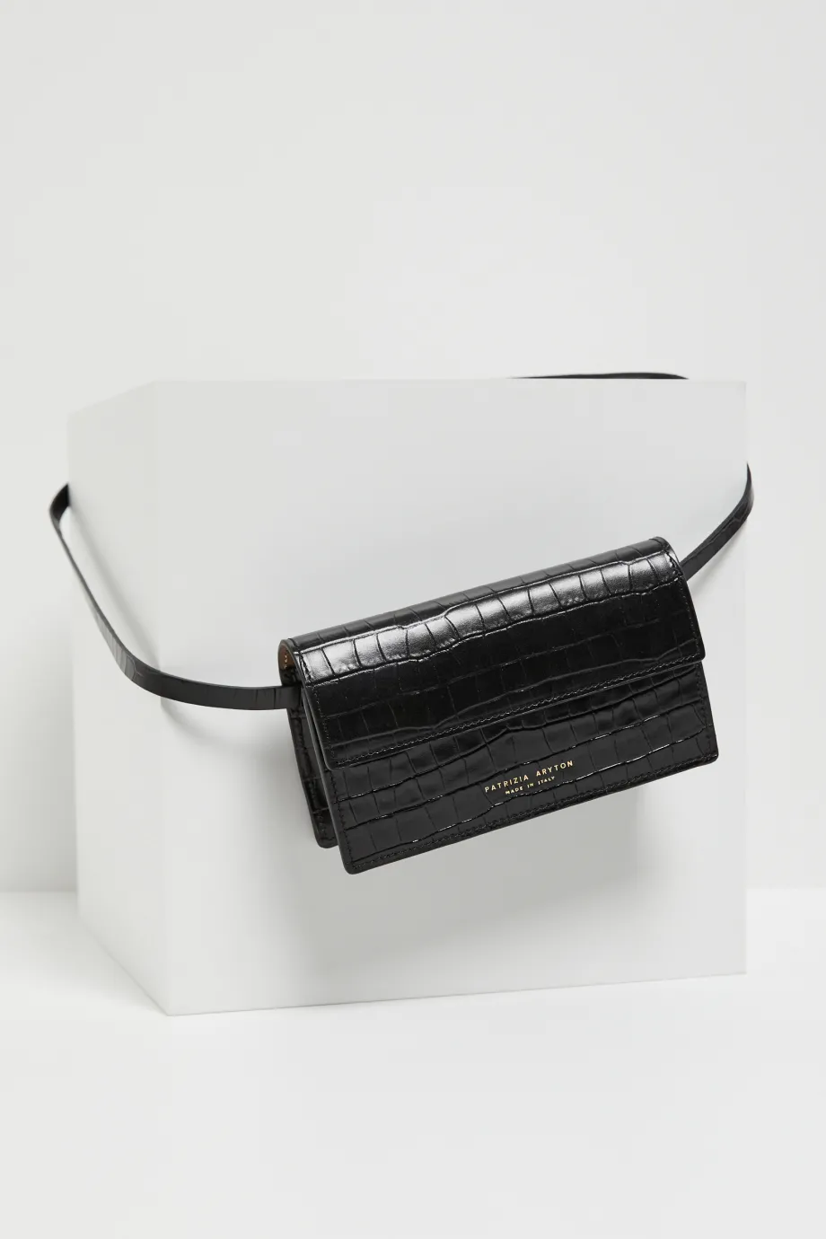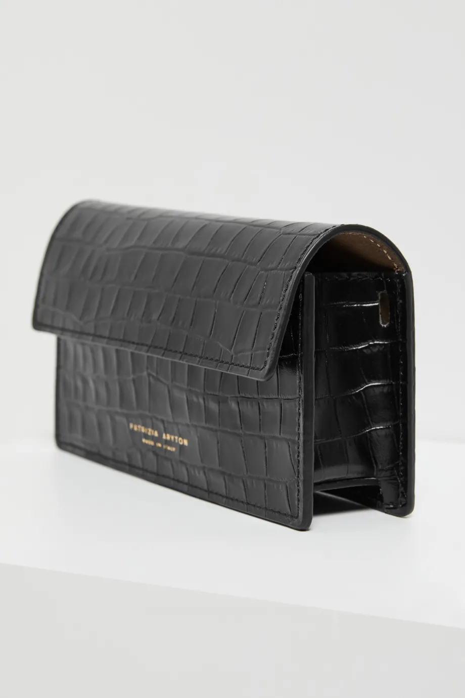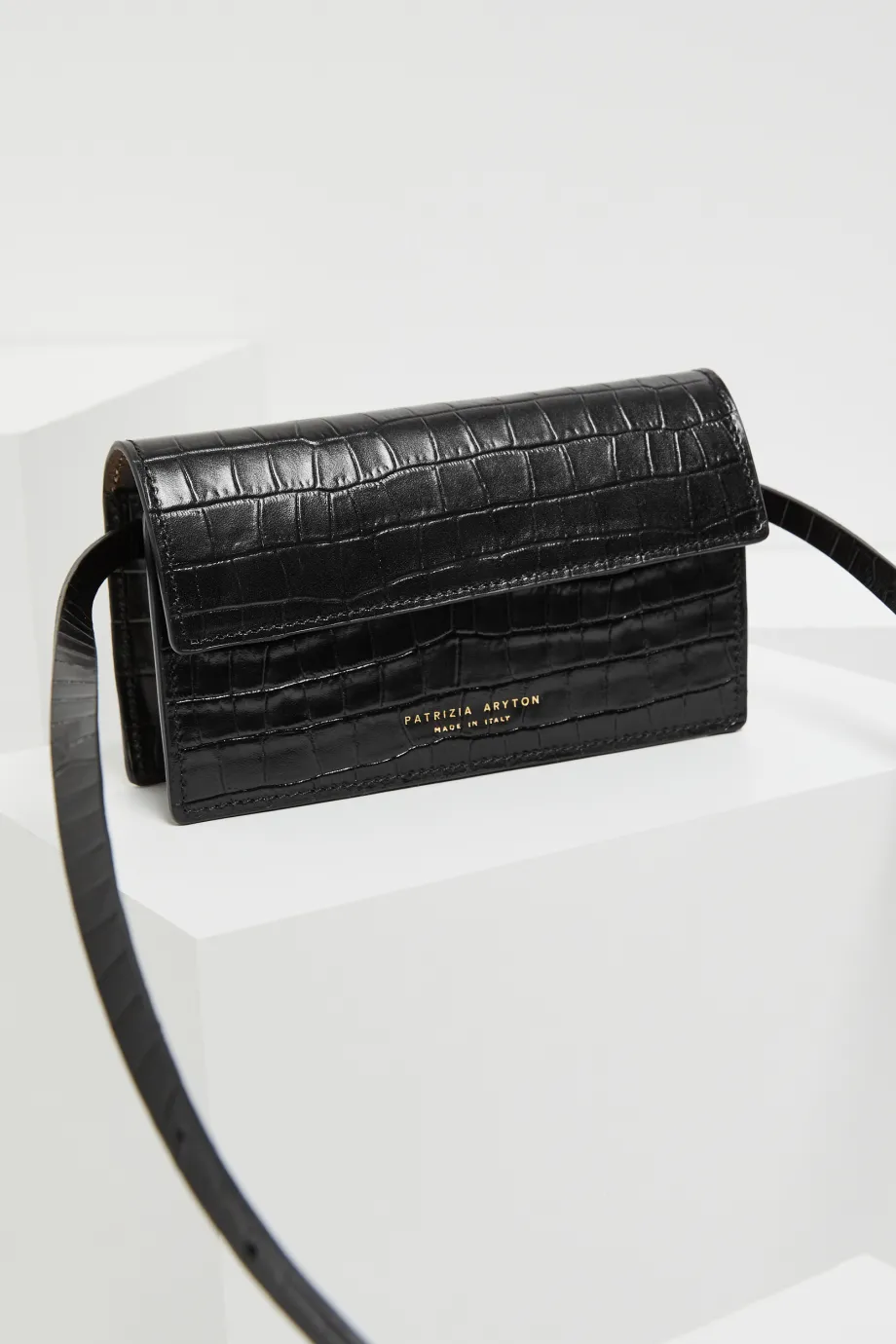 Confecționată din piele naturală neagră cu textură tip piele de crocodil, rezistentă la zgârieturi, cu elemente metalice aurii elegante.