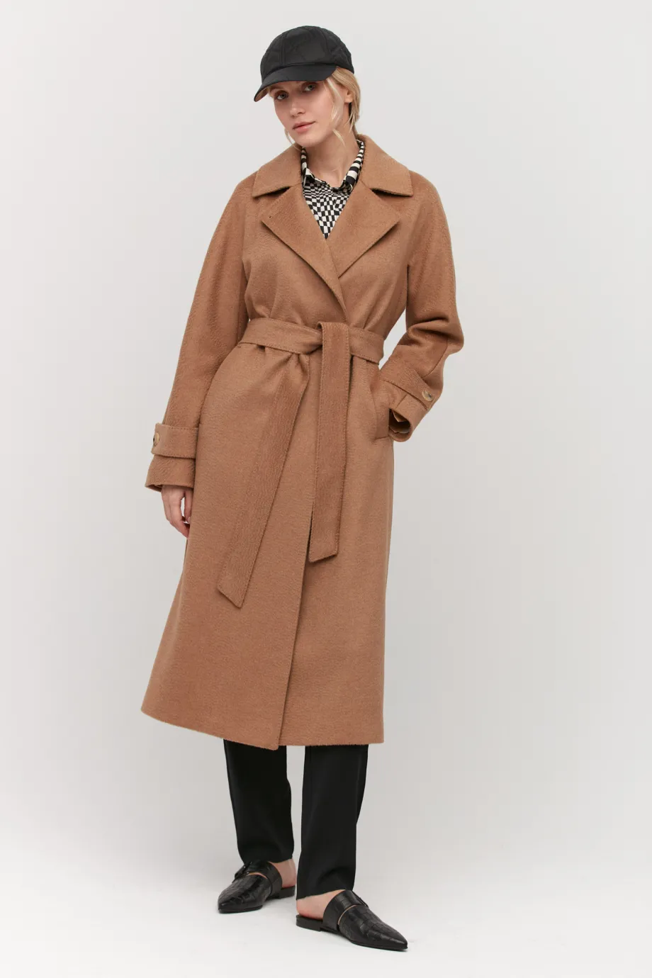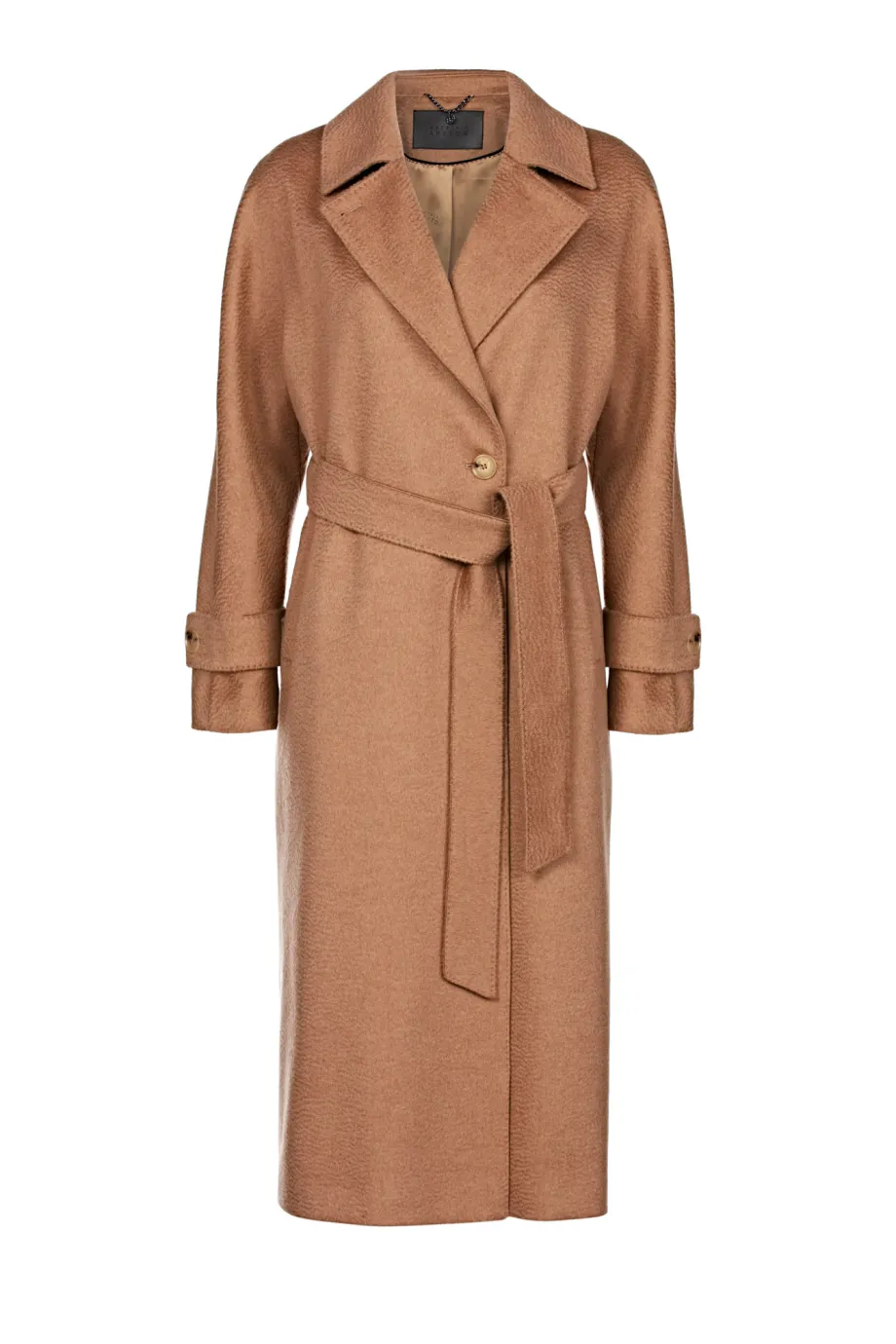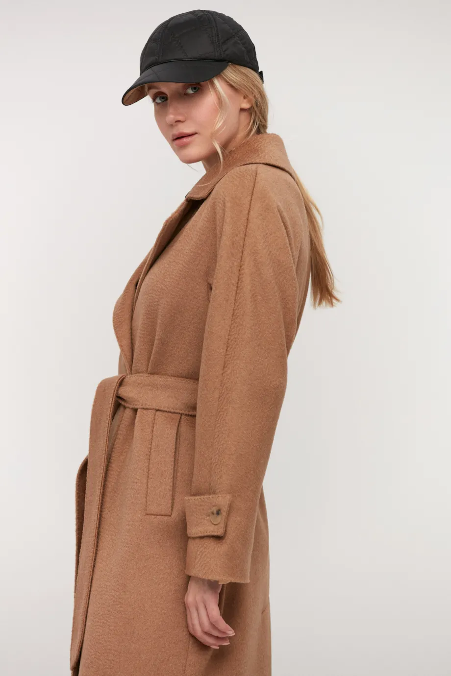 Palton midi camel din lână de cămilă, cu curea