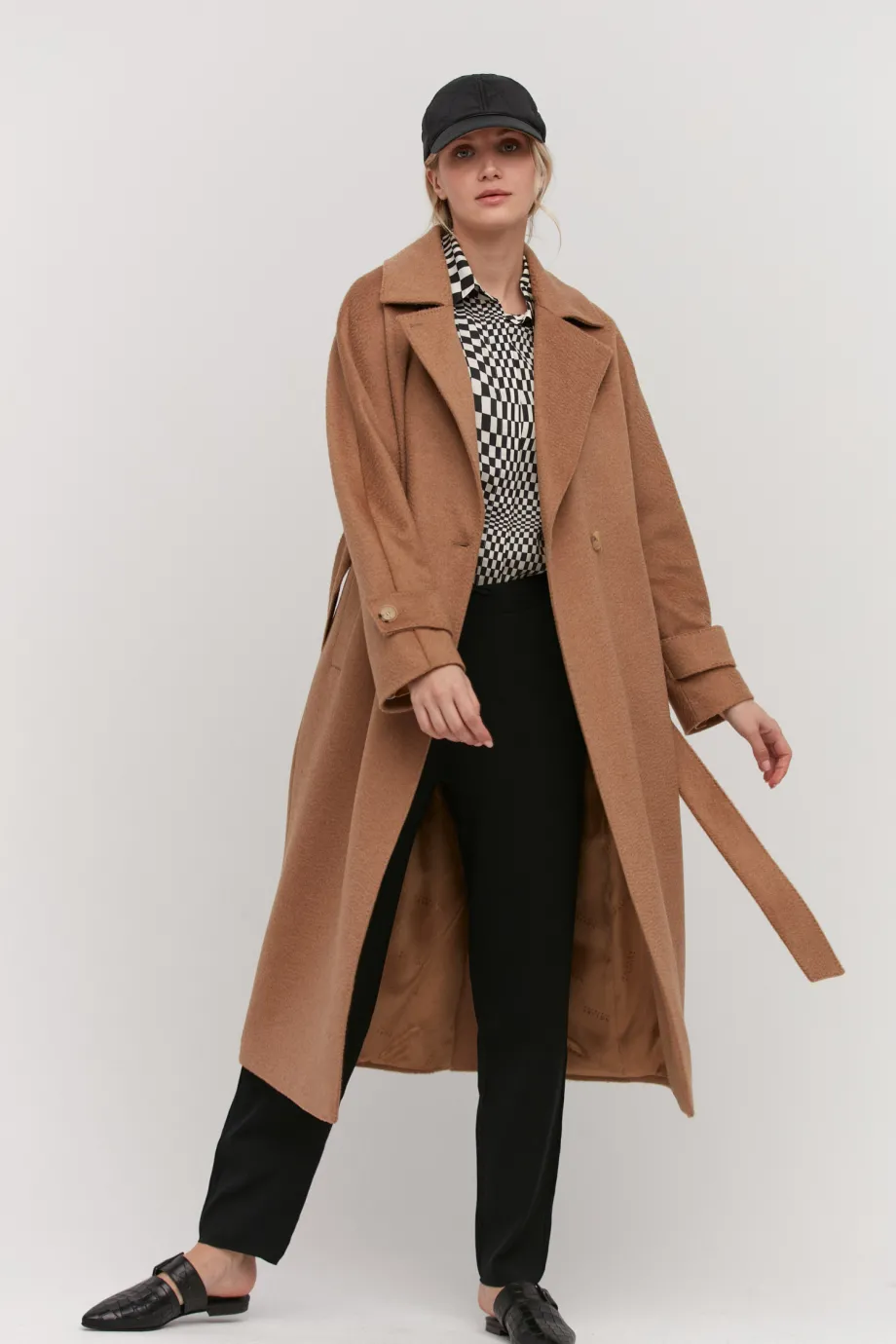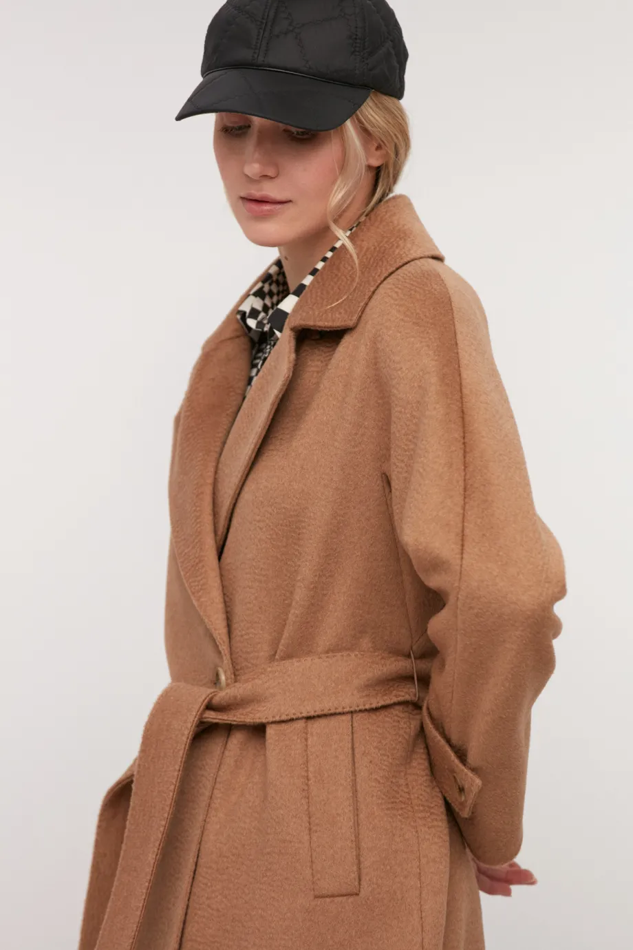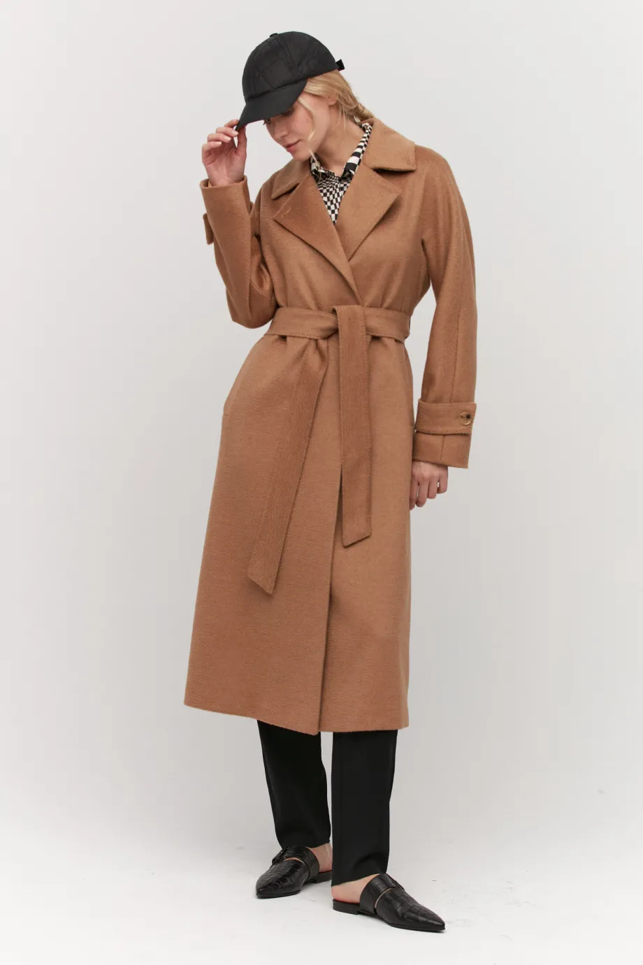 Palton midi camel din lână de cămilă, cu curea