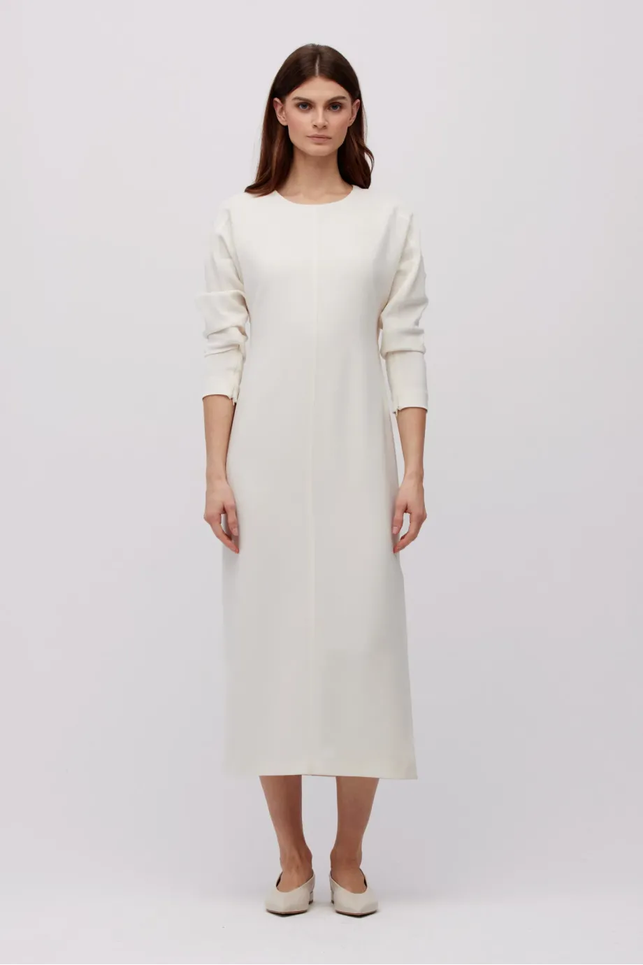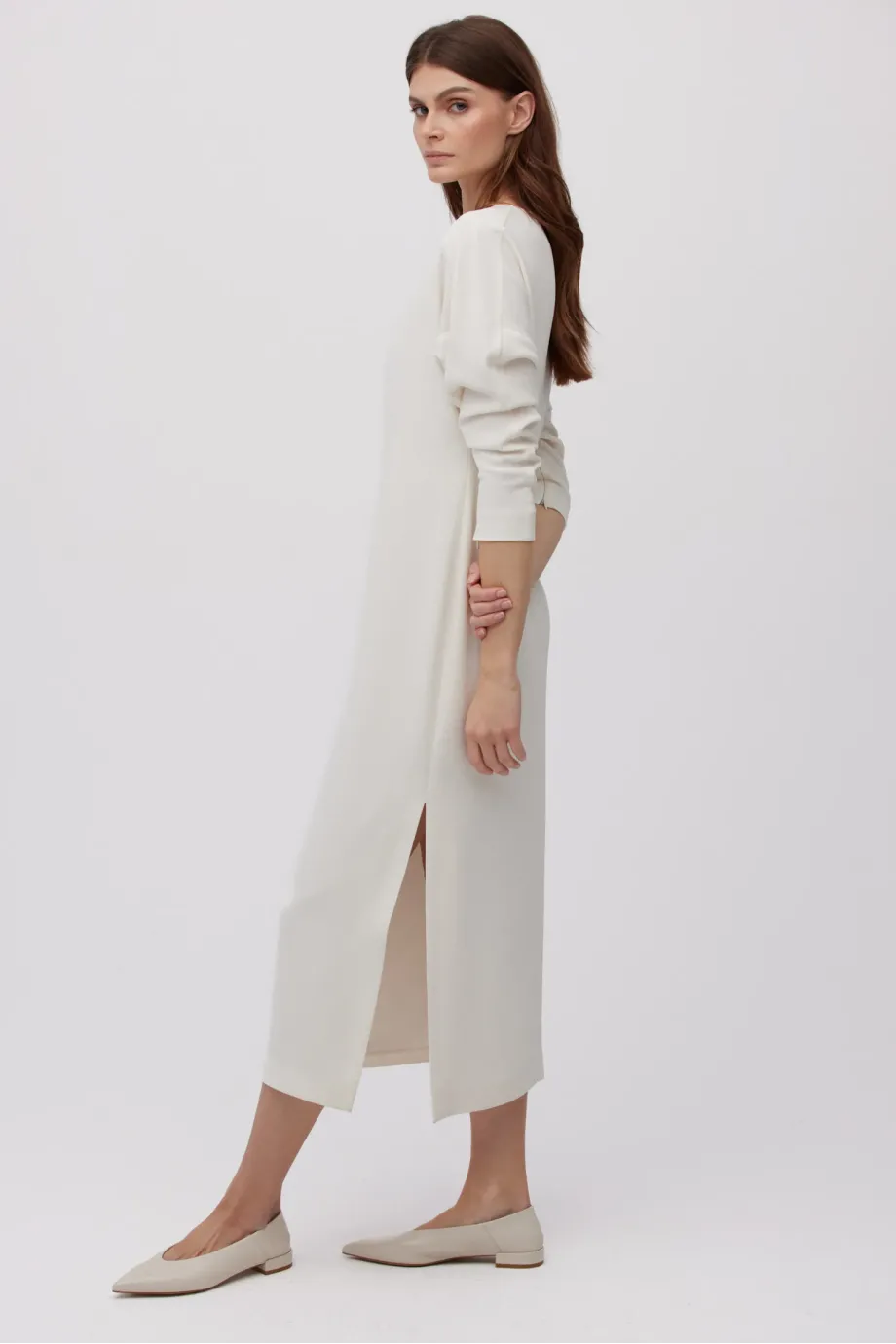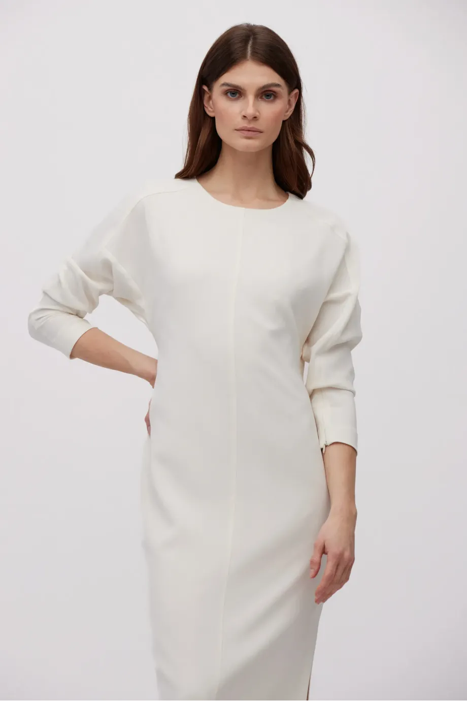 Decolteu rotund, închidere cu fermoar la spate, căptușeală și despicătură în partea stângă.