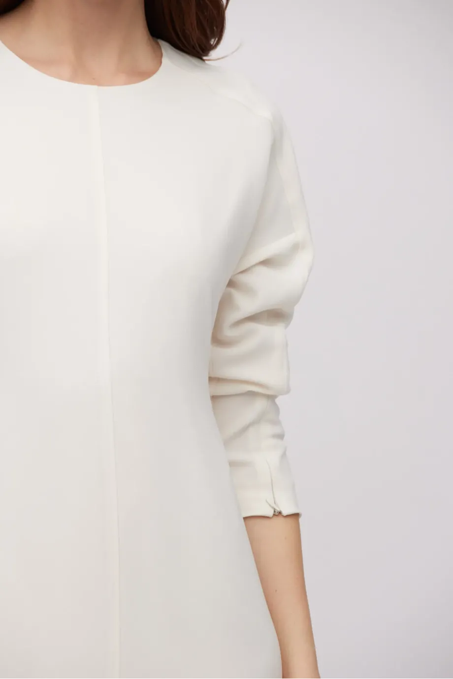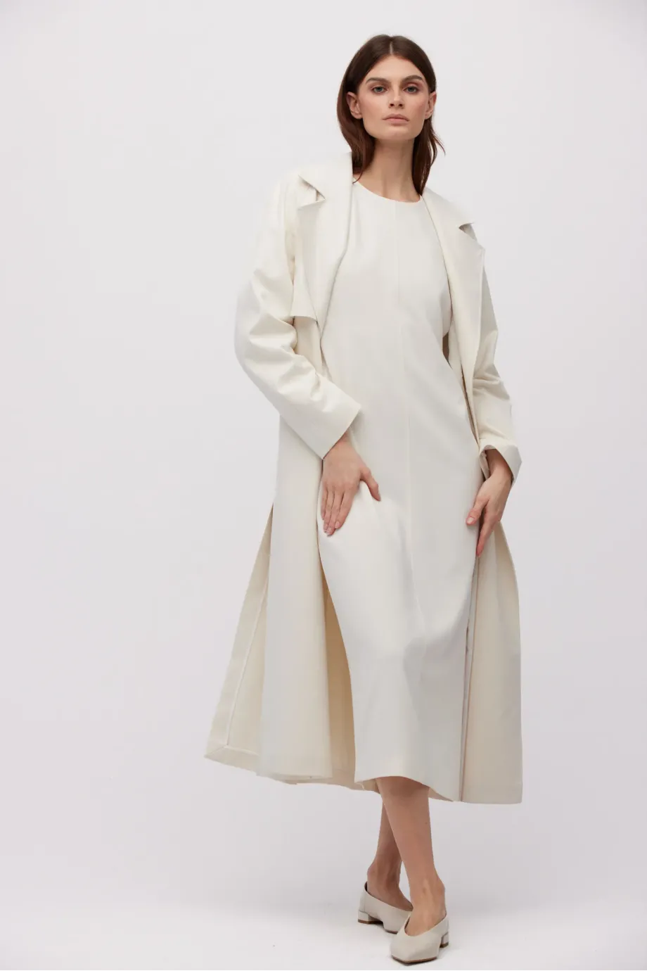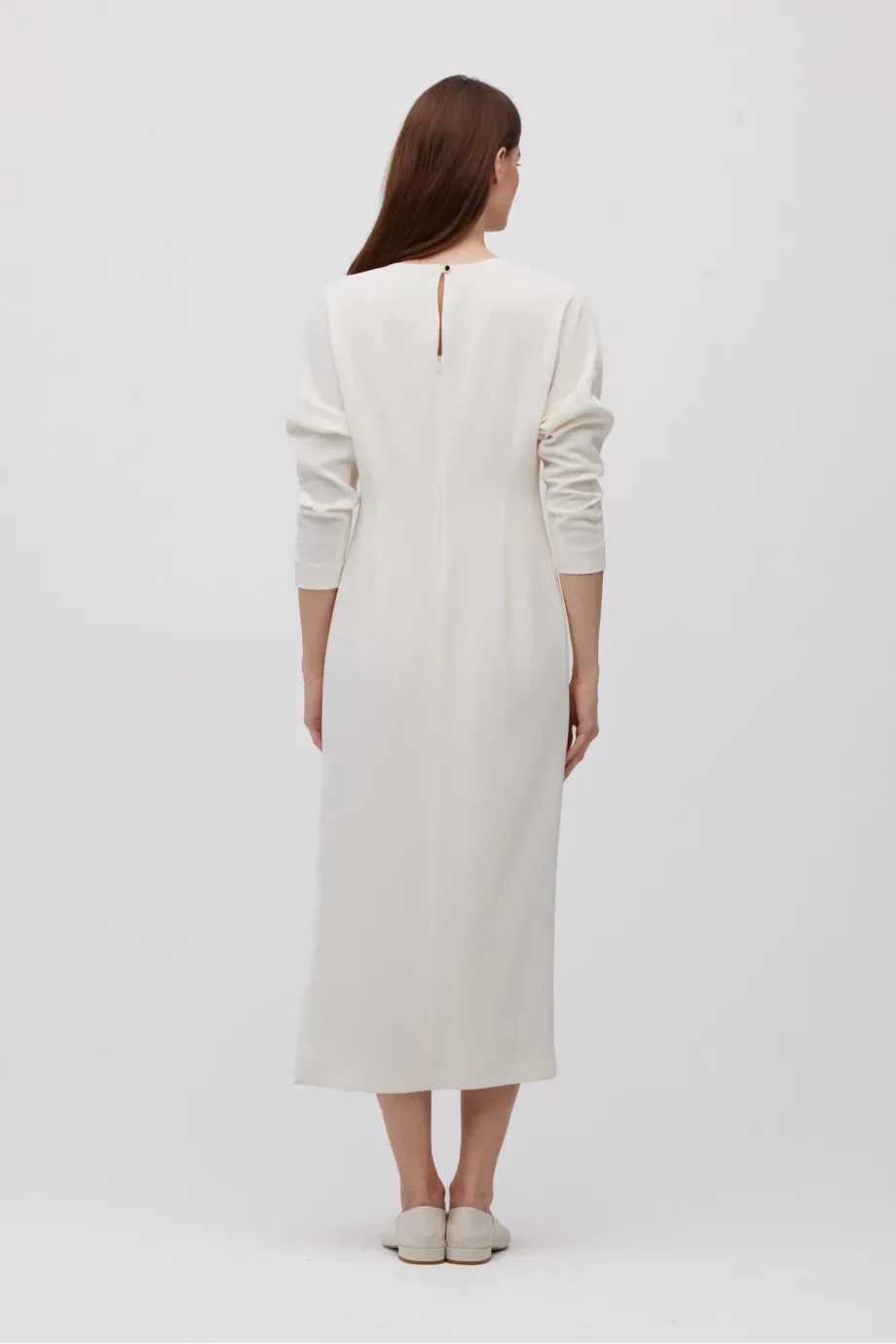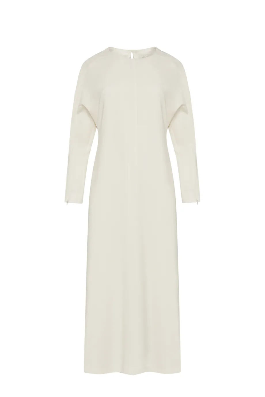 Decolteu rotund, închidere cu fermoar la spate, căptușeală și despicătură în partea stângă.