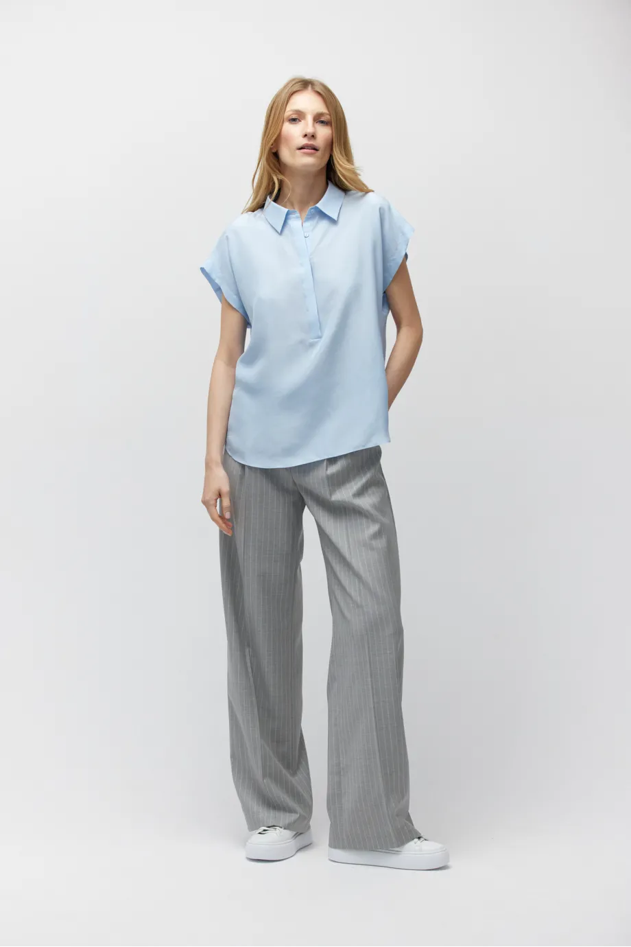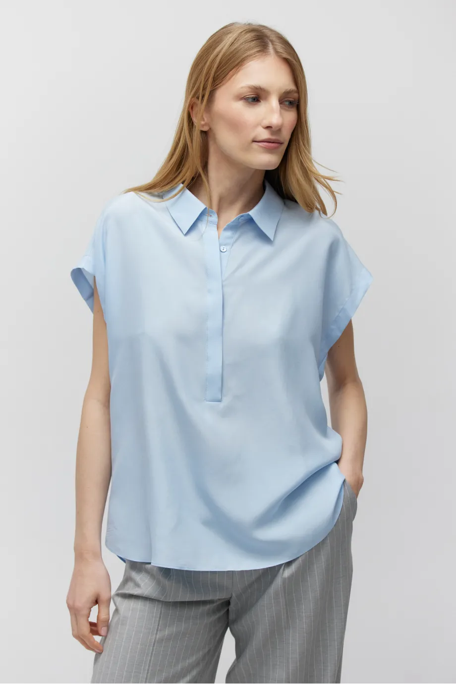 Închidere cu nasturi din sidef, guler și mânecă scurtă, ușor căzută