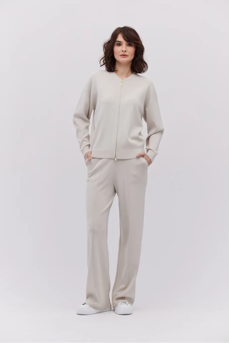 Model cu croiala pantalonului lungă, parte a unui compleu cu bomber.