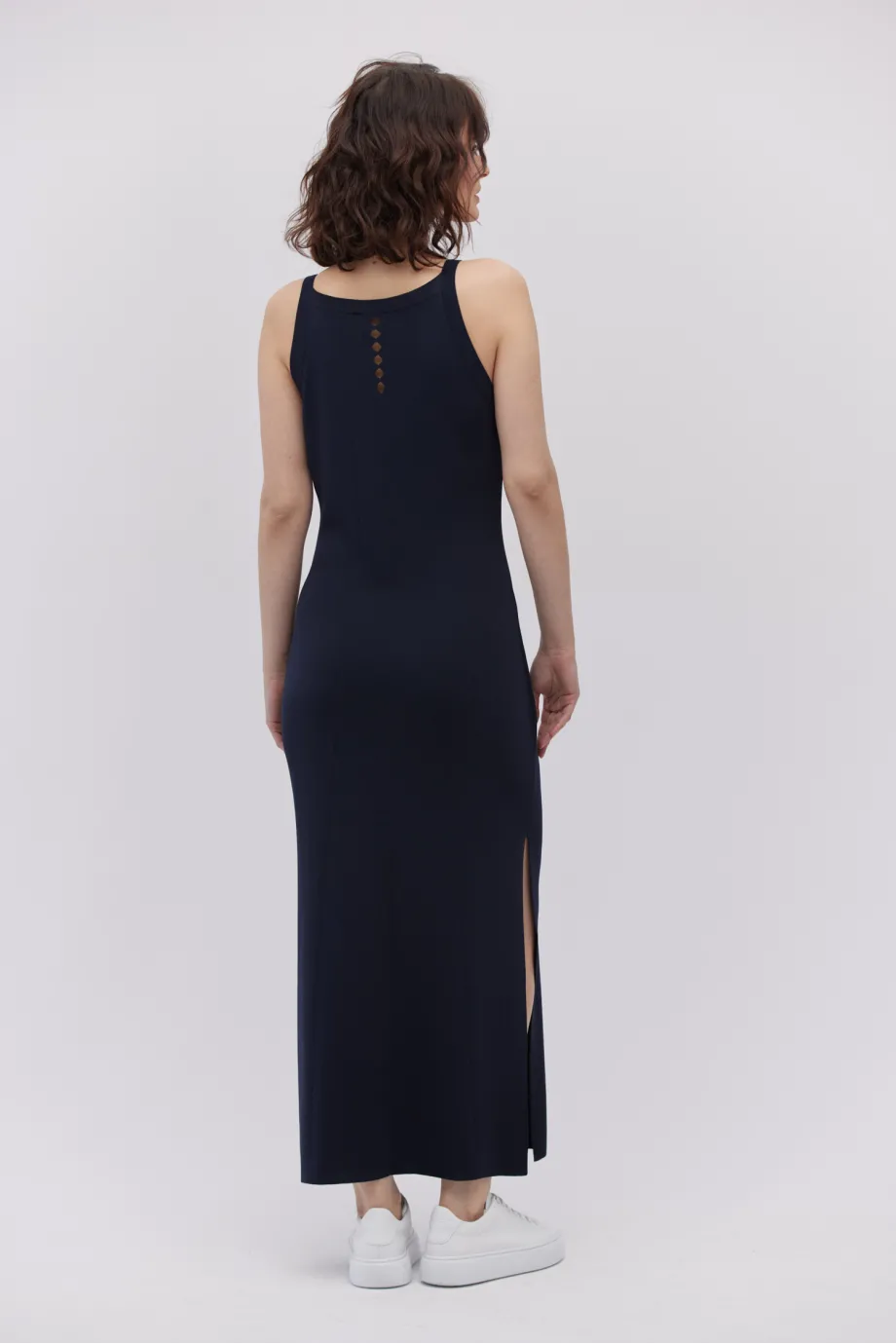 Decolteu halter, despicătură laterală la bază.