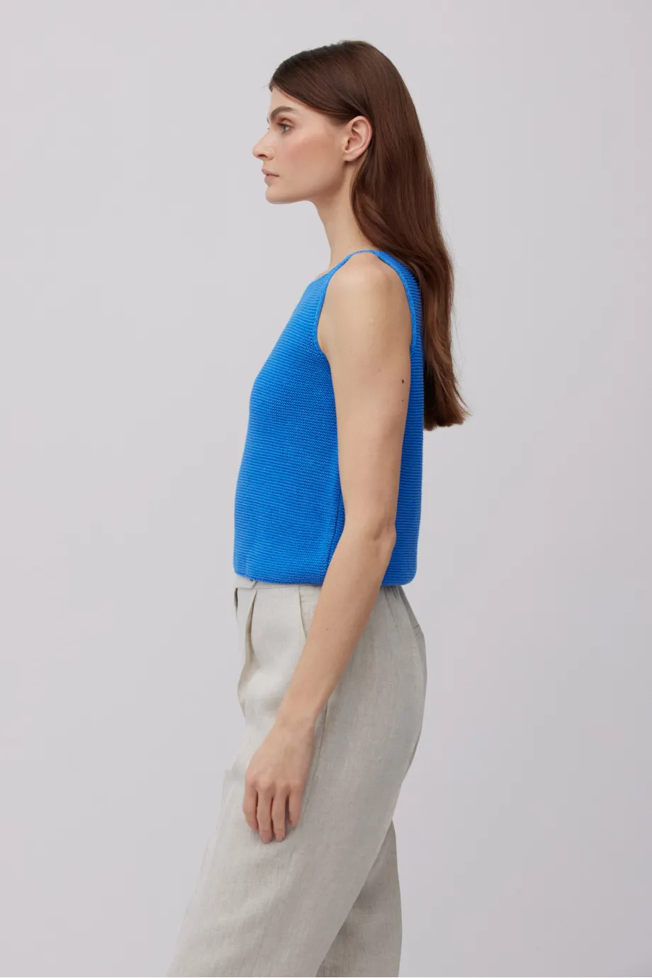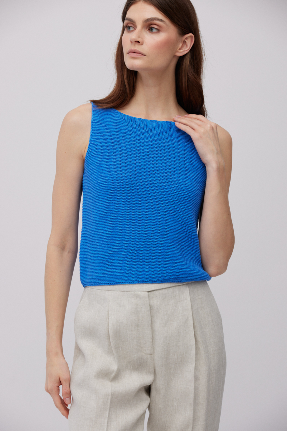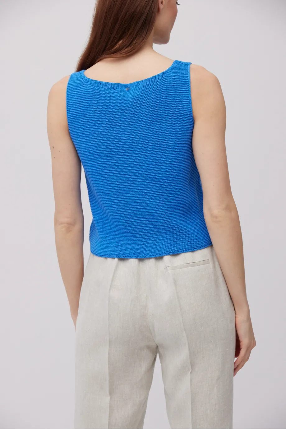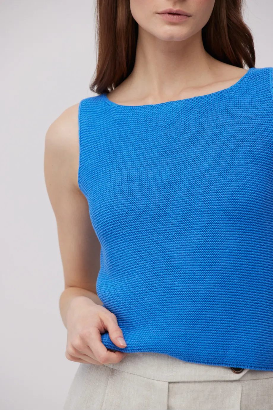 - Top din in și bumbac, cu bretele largi, decolteu tip bărcuță și croială mai scurtă