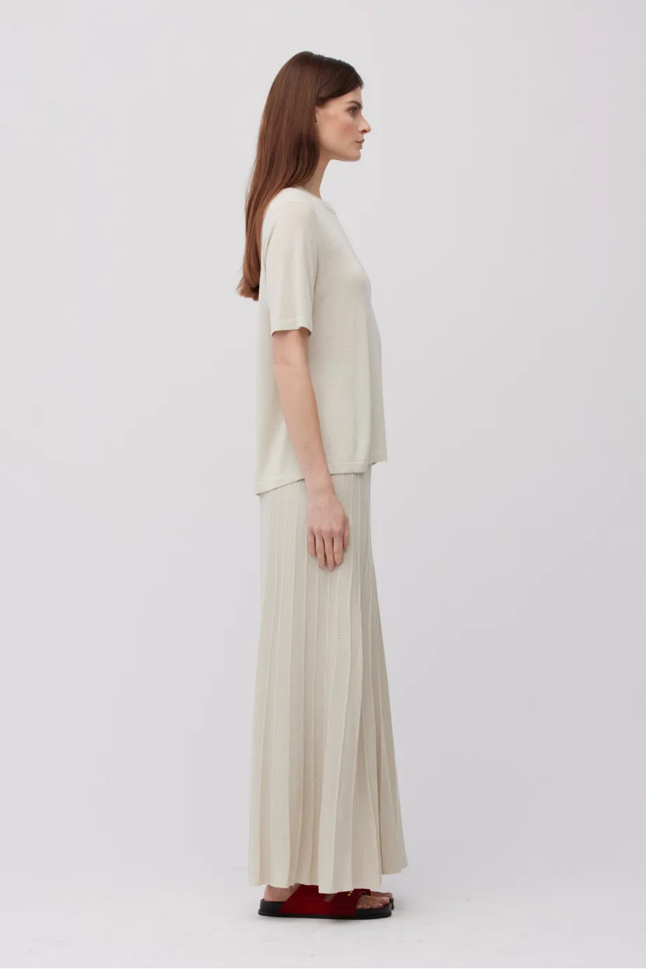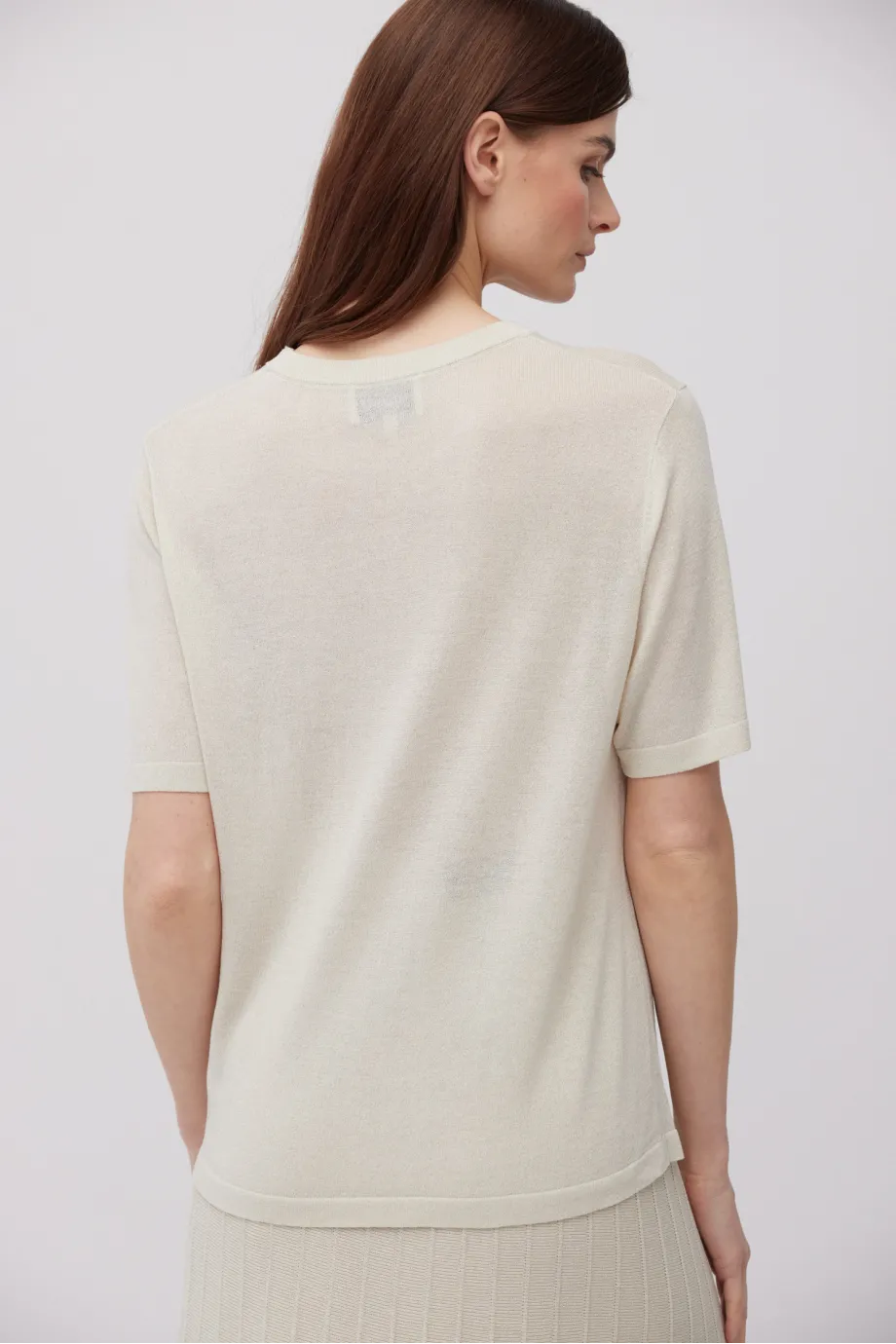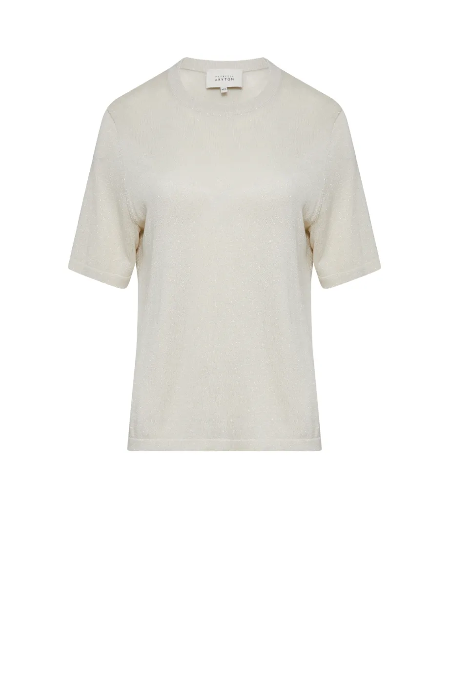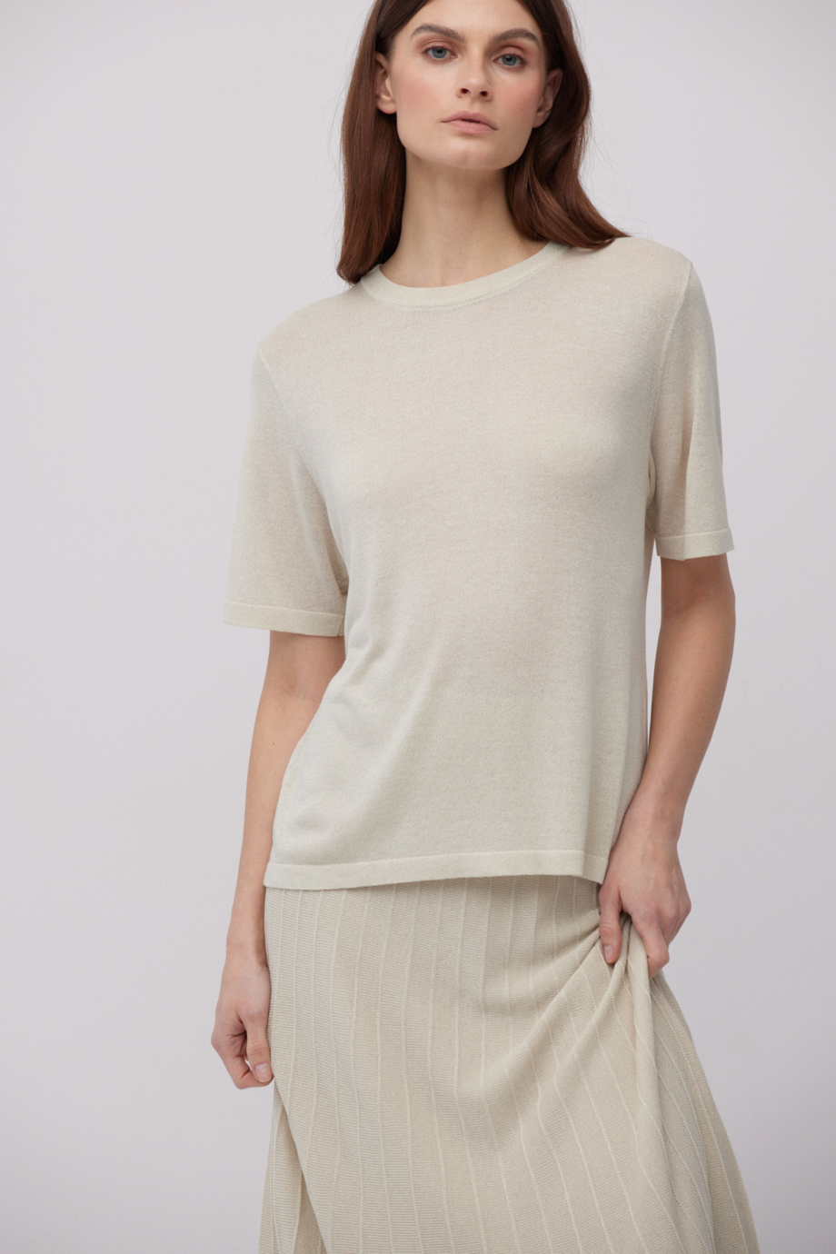 - Tricou bej cu fir argintiu, croială dreaptă și mâneci scurte