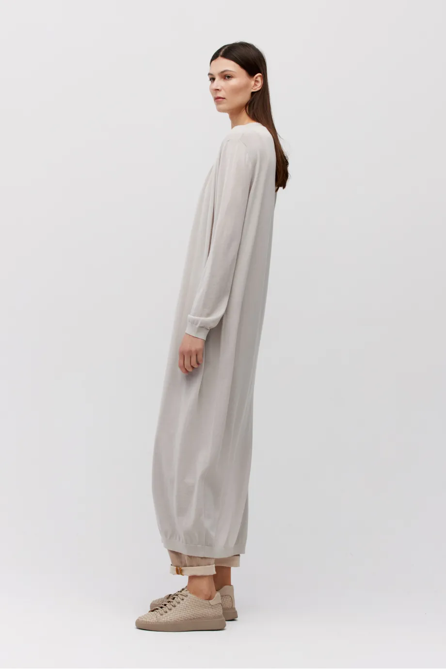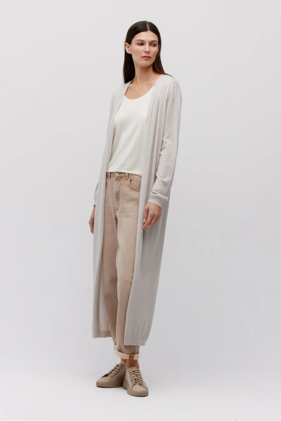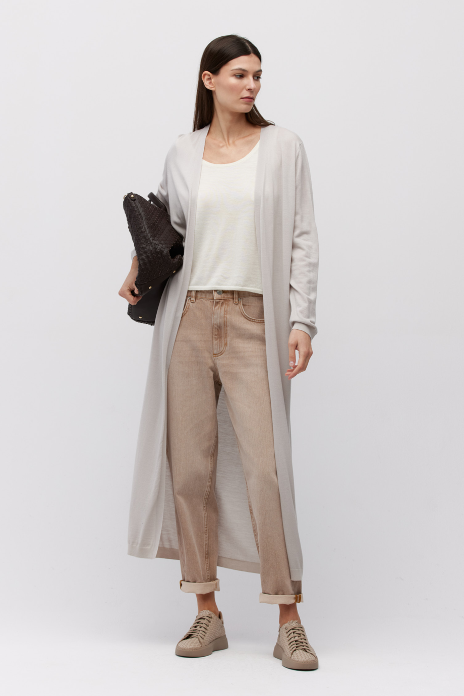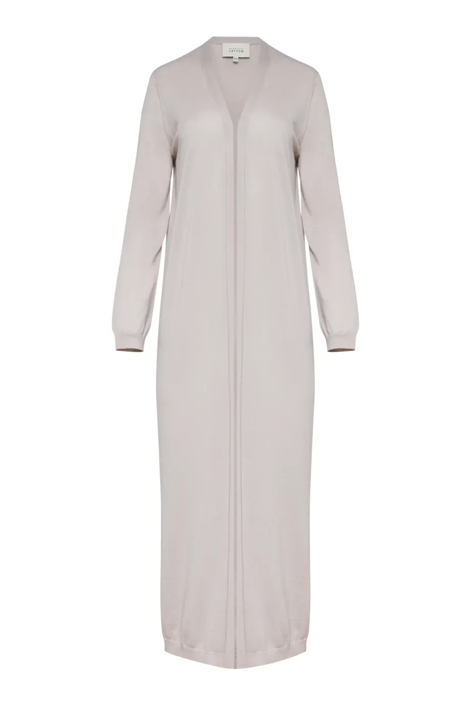 - Cardigan lung din lână, de culoare gri, cu mâneci lungi și design deschis (fără închidere)