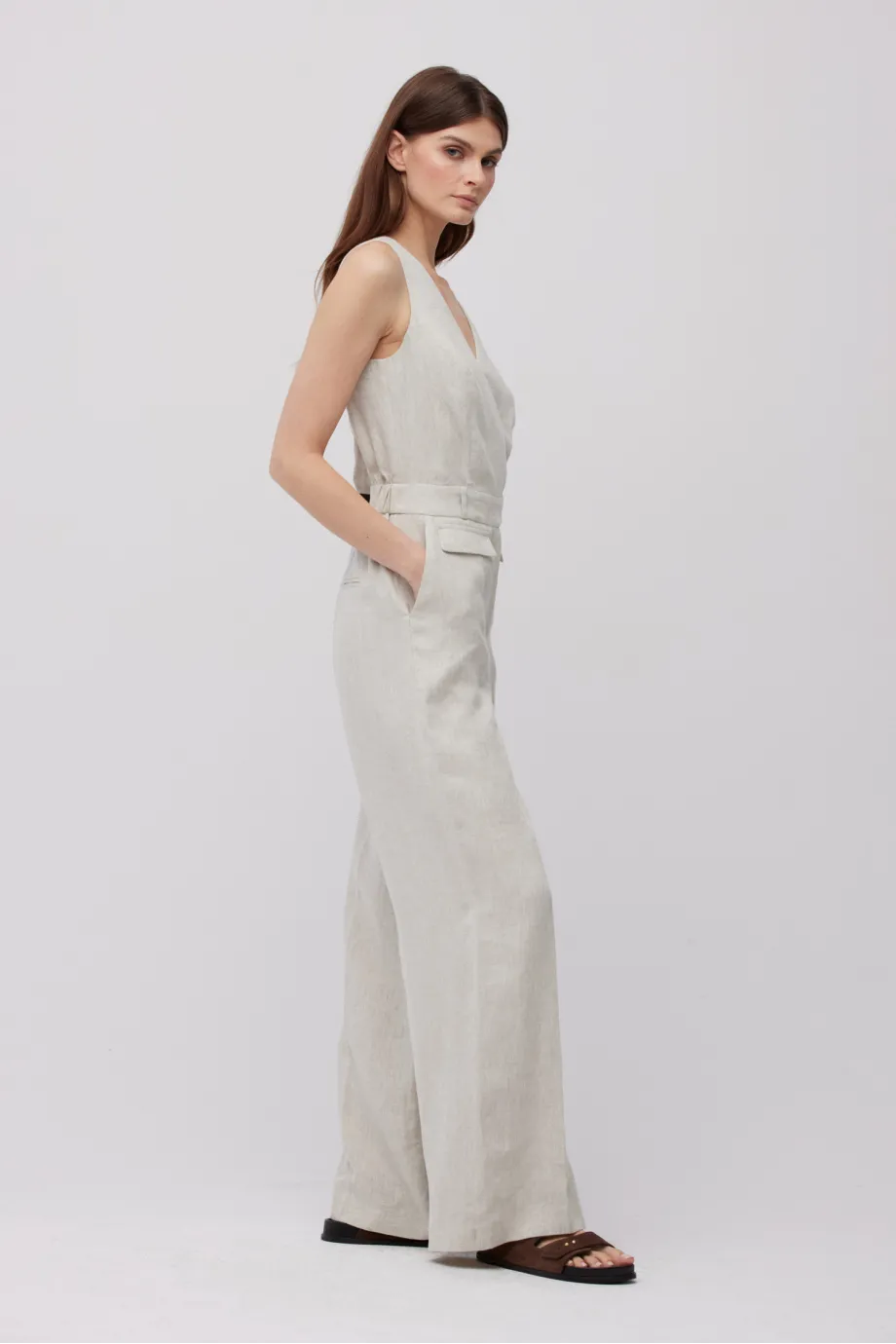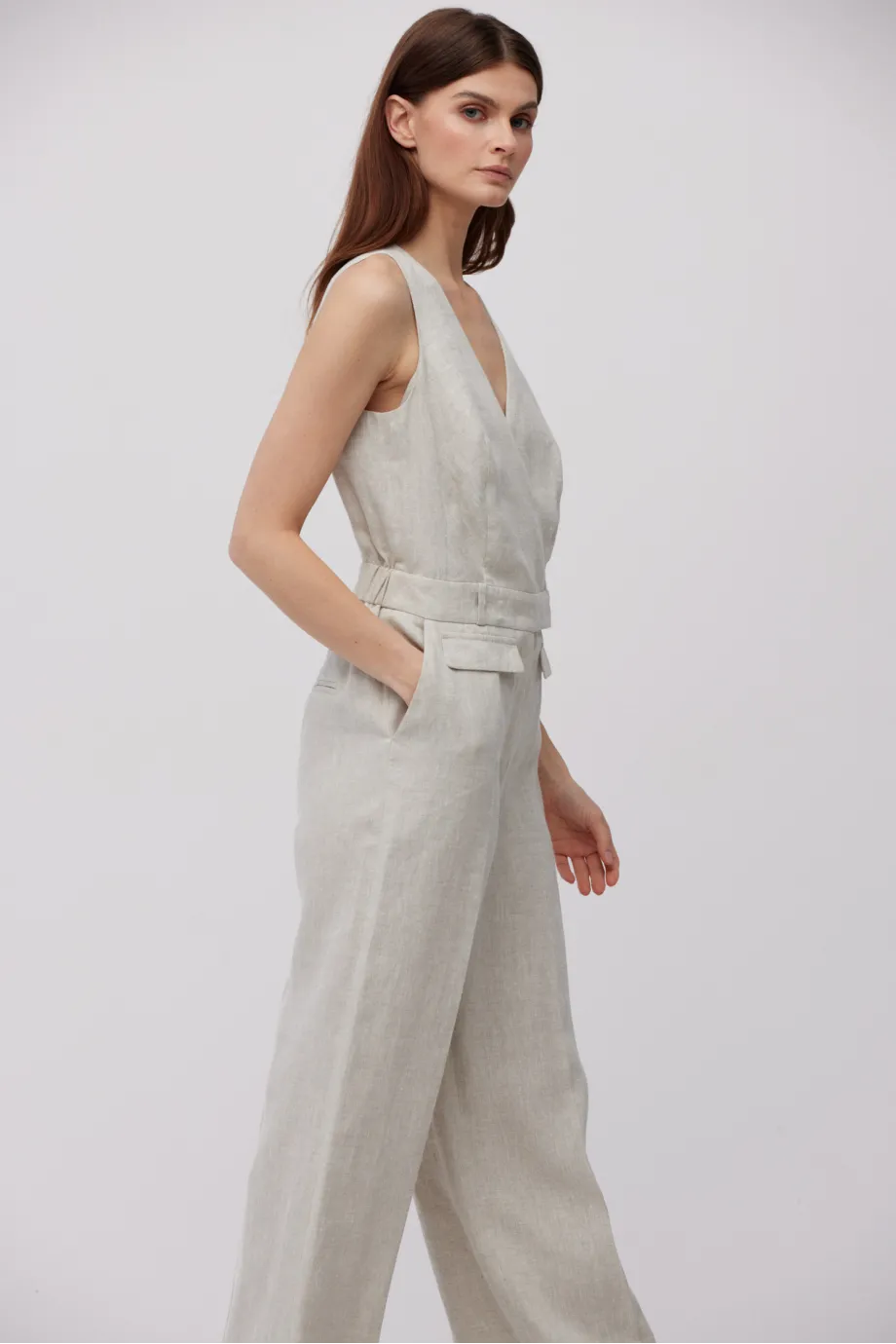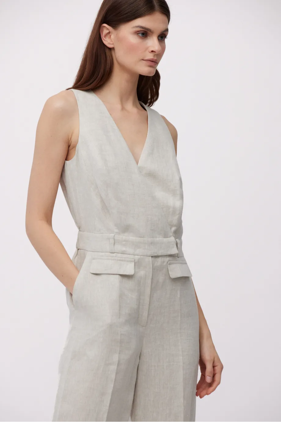 - Salopetă bej din in, cu decolteu în V