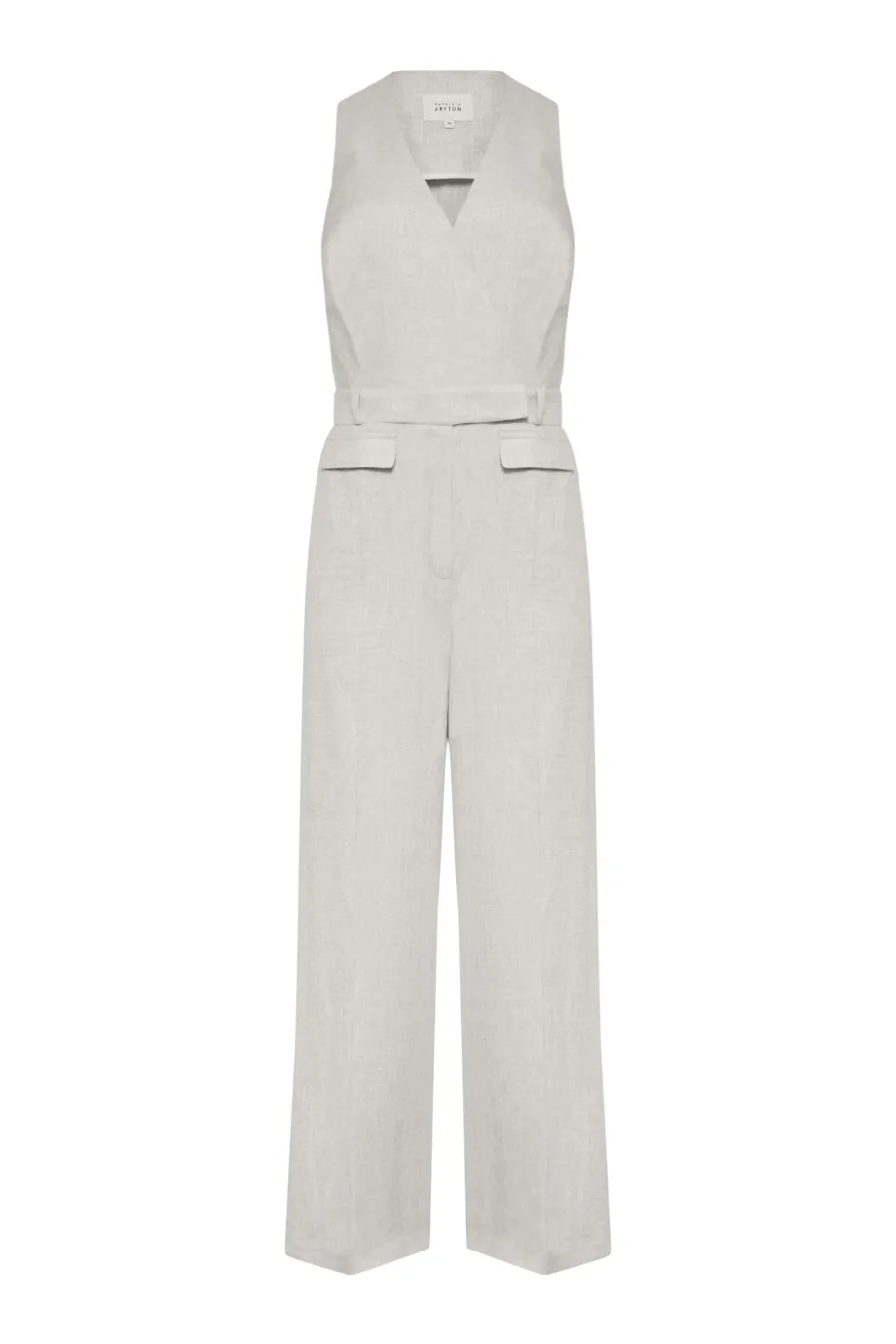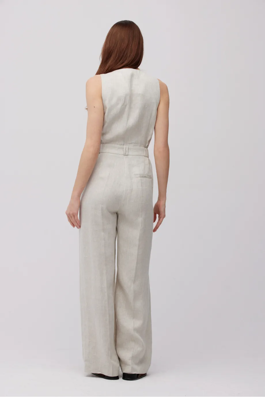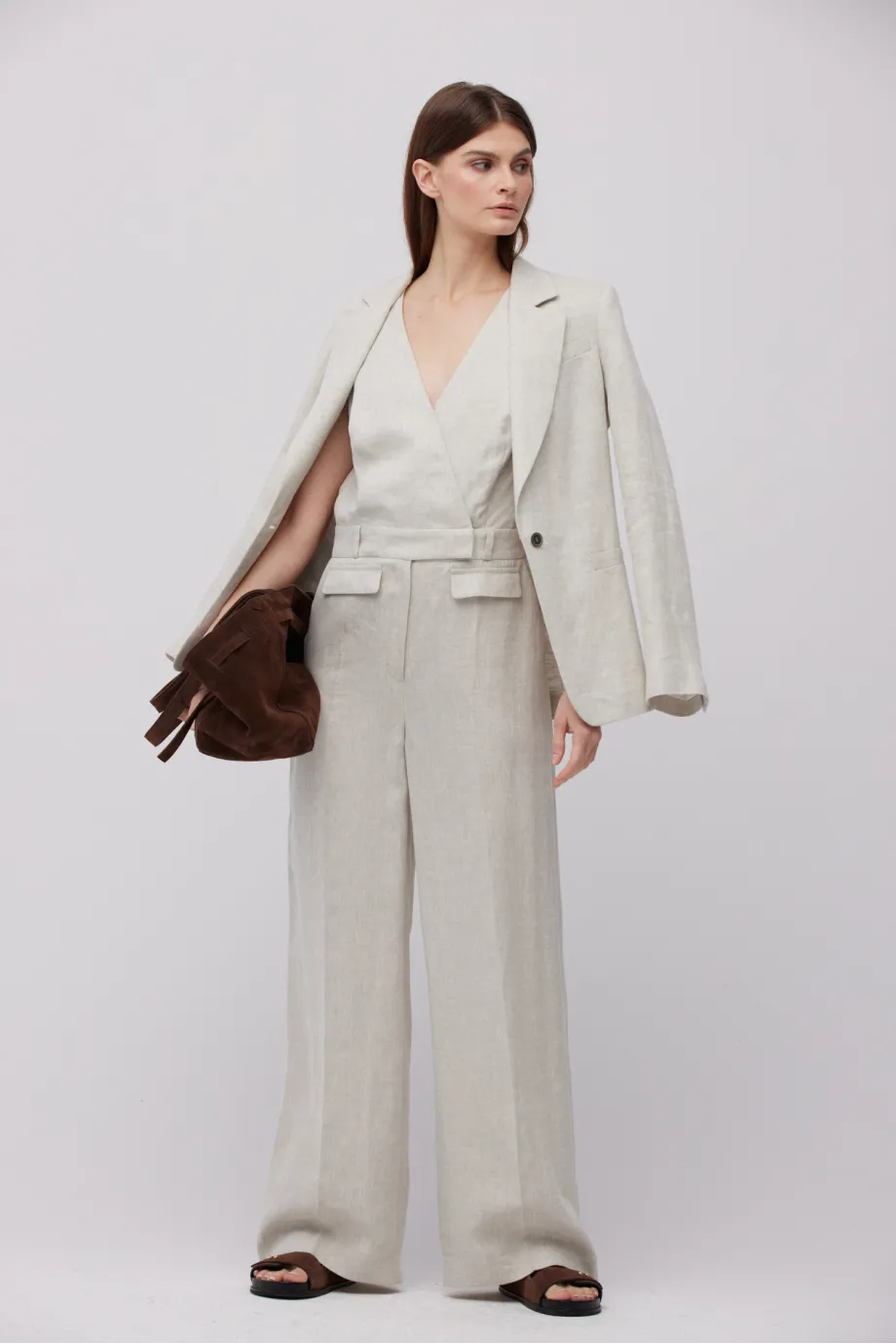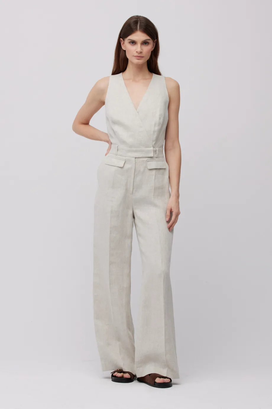 - Salopetă bej din in, cu decolteu în V