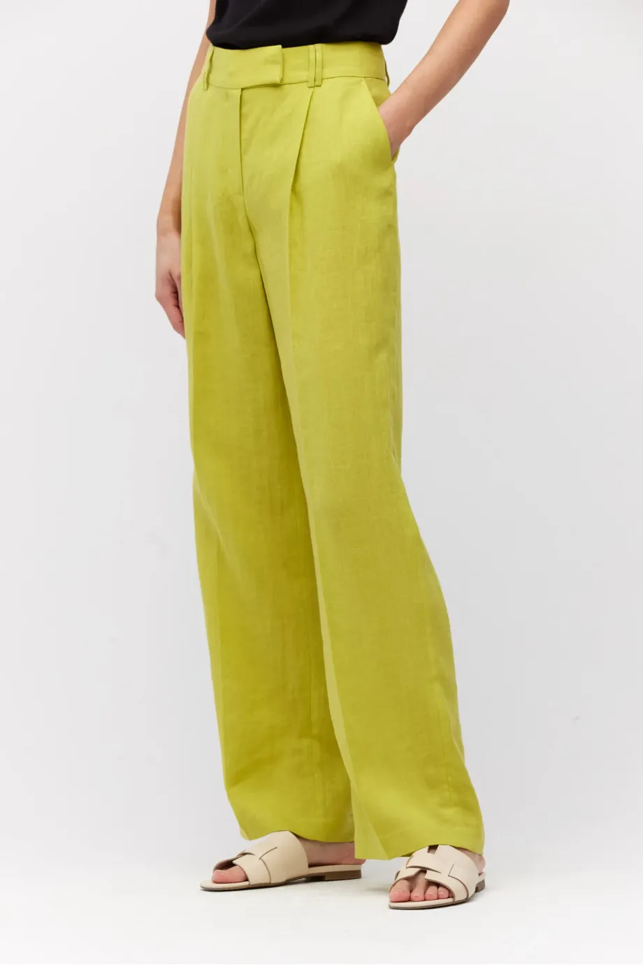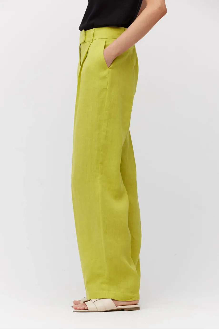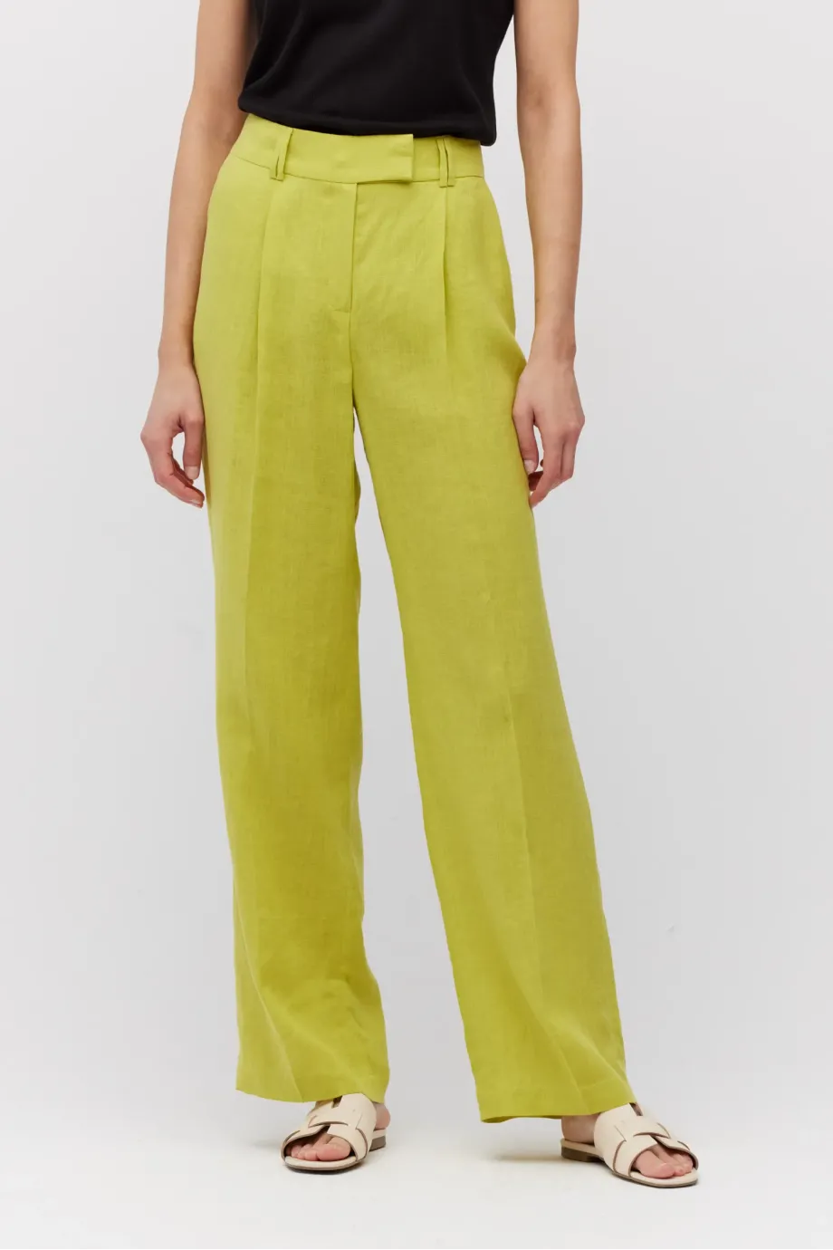 - Pantaloni largi din in, în nuanțe de lime, cu pliuri
