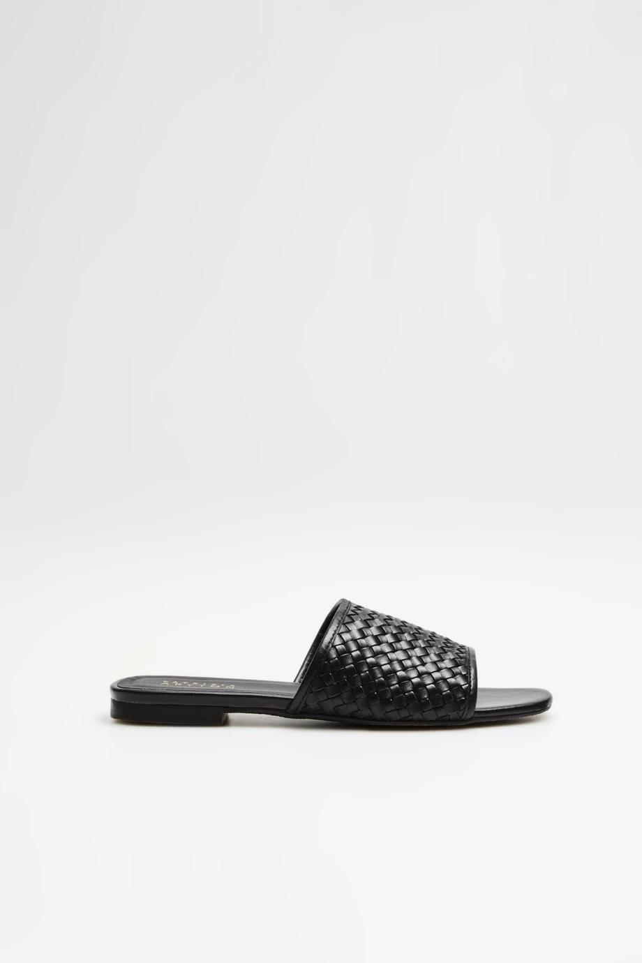 - Saboți plați negrii, pe talpă joasă, cu o bandă lată din piele împletită