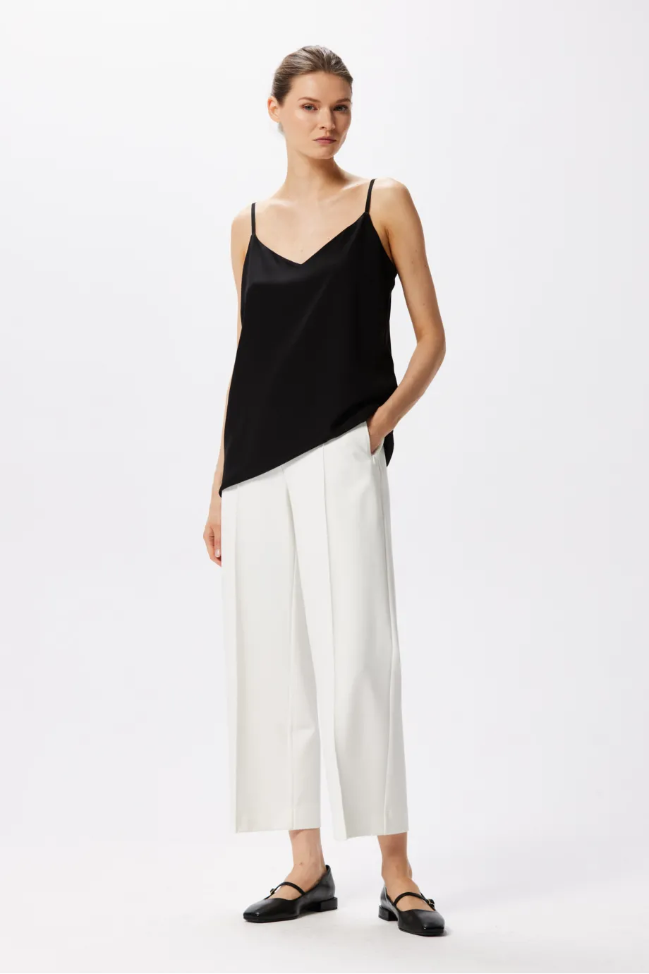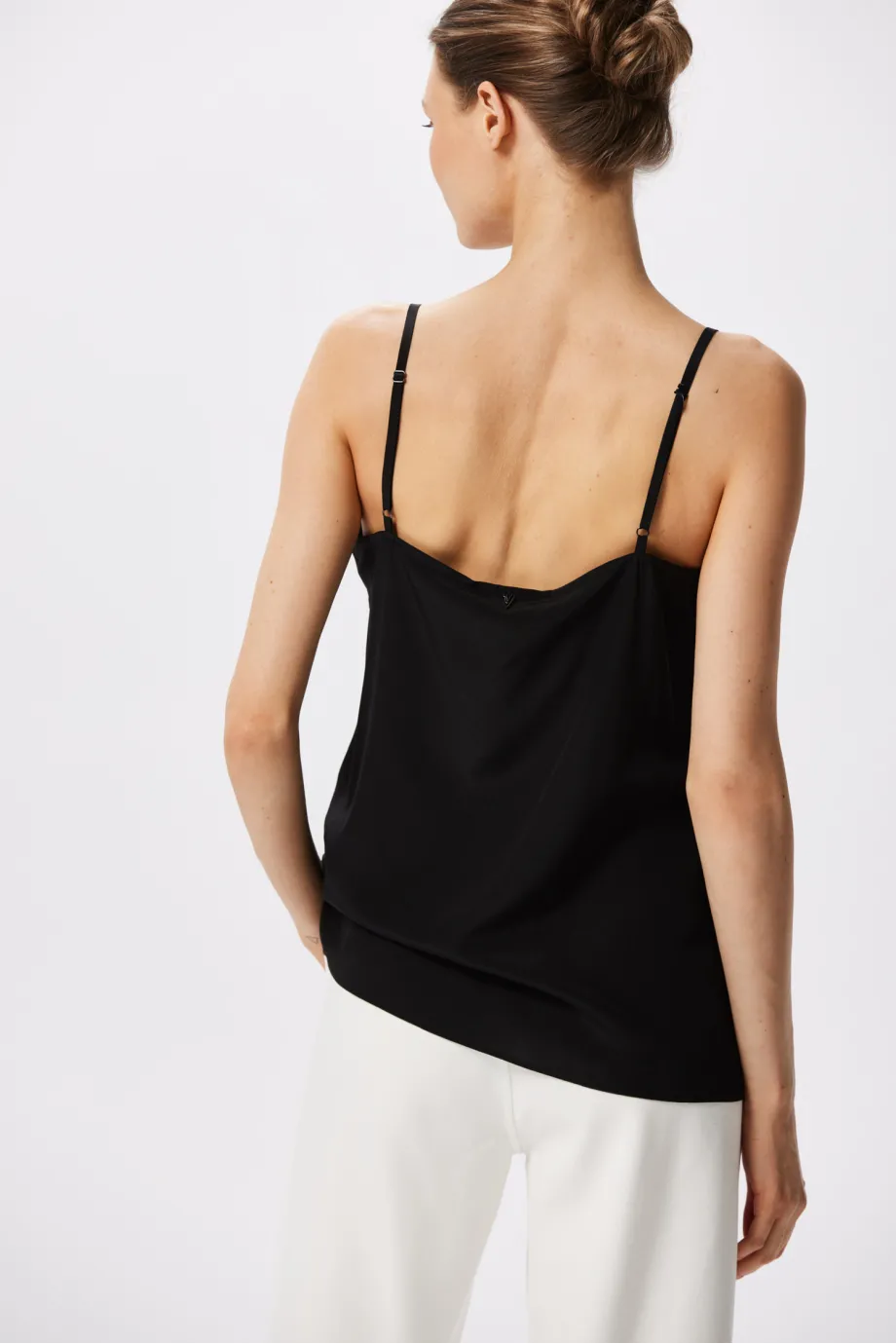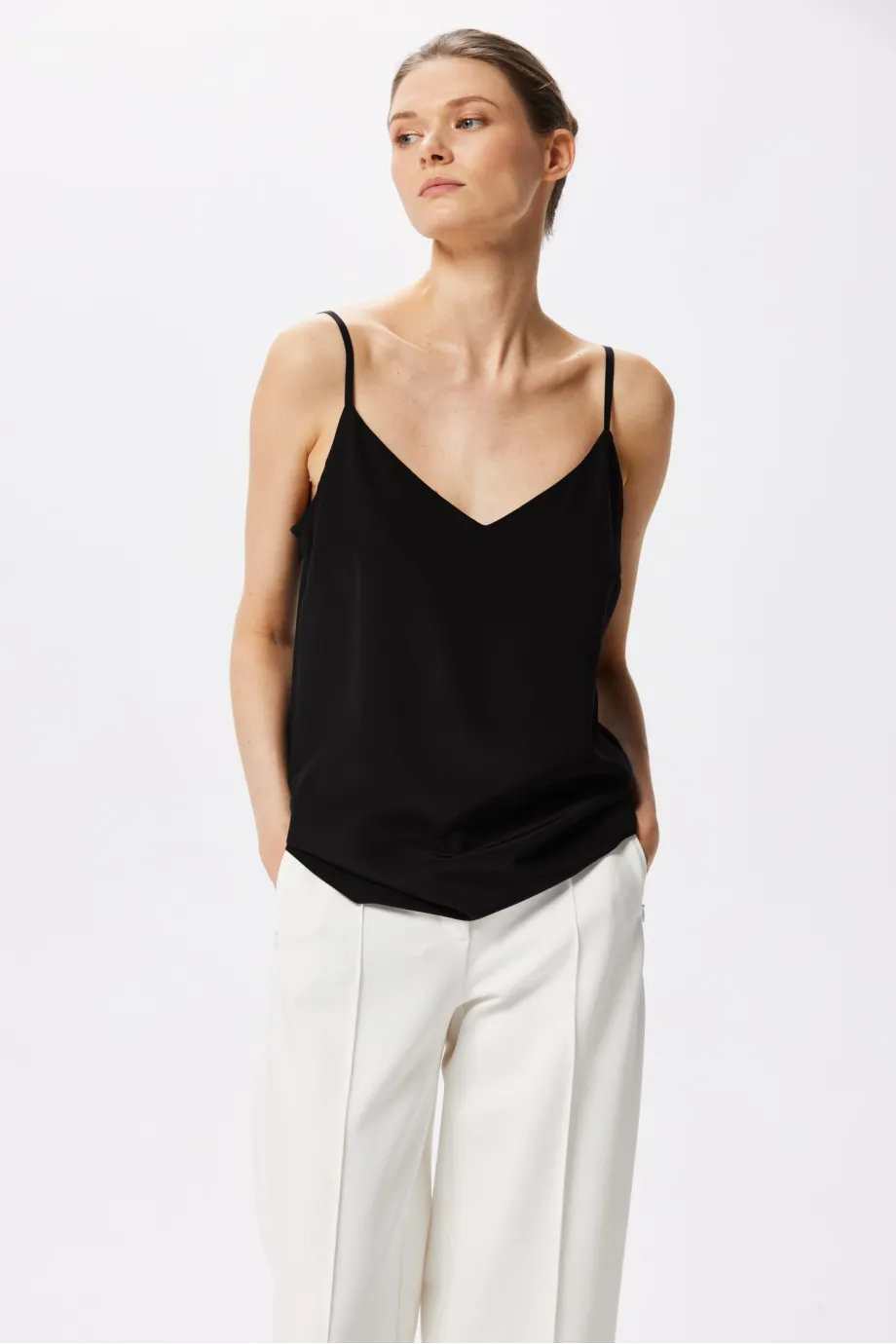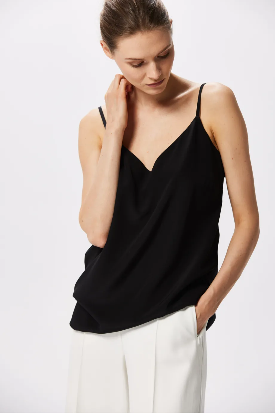 Topul cu bretele din mătase este produsul nostru semnătură, care apare în fiecare sezon într-o nouă culoare. De această dată, iconicul top cu decolteu în V este într-un negru profund. Se potrivește cu orice ținută, indiferent de stil. Un top din mătase neagră cu bretele este un must-have pentru orice iubitoare a luxului discret.