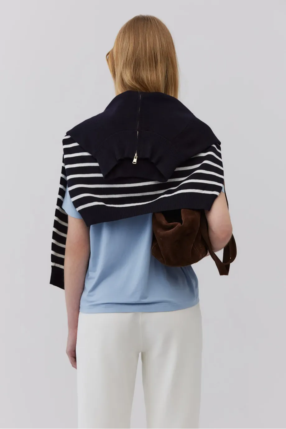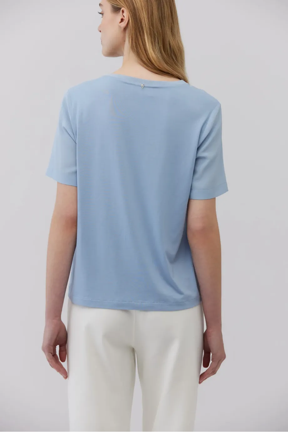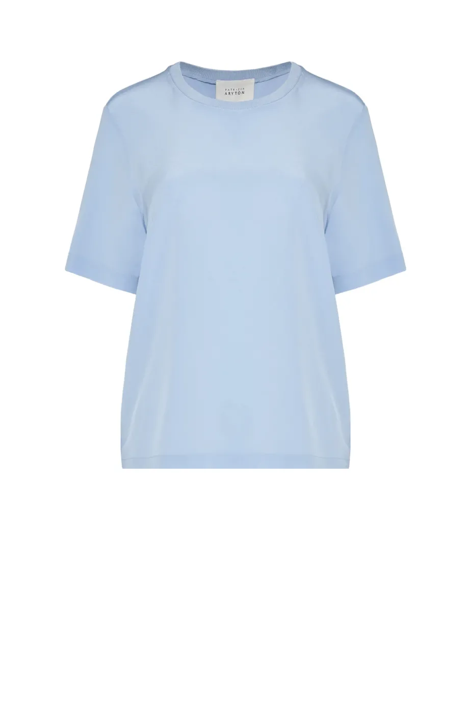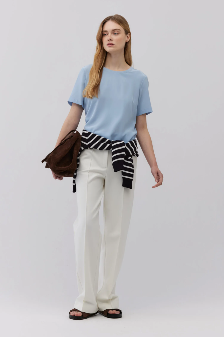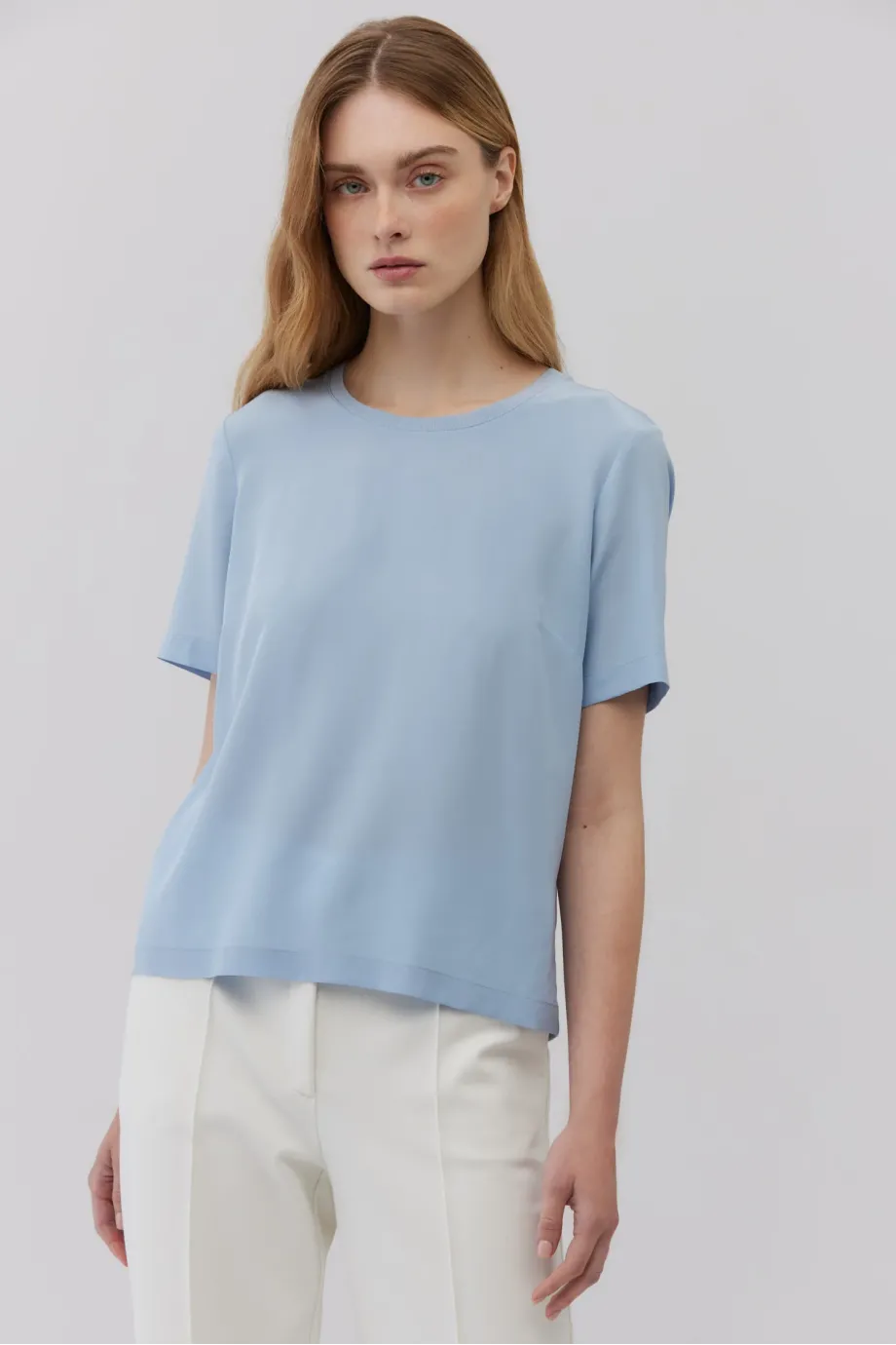 Tricou cu față de mătase și spate tricotat. Croială dreaptă, ușor pătrată. Decolteu rotund. Mâneci scurte.