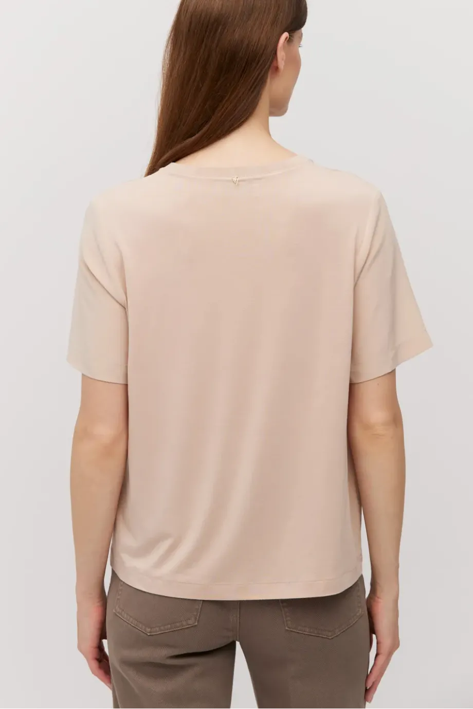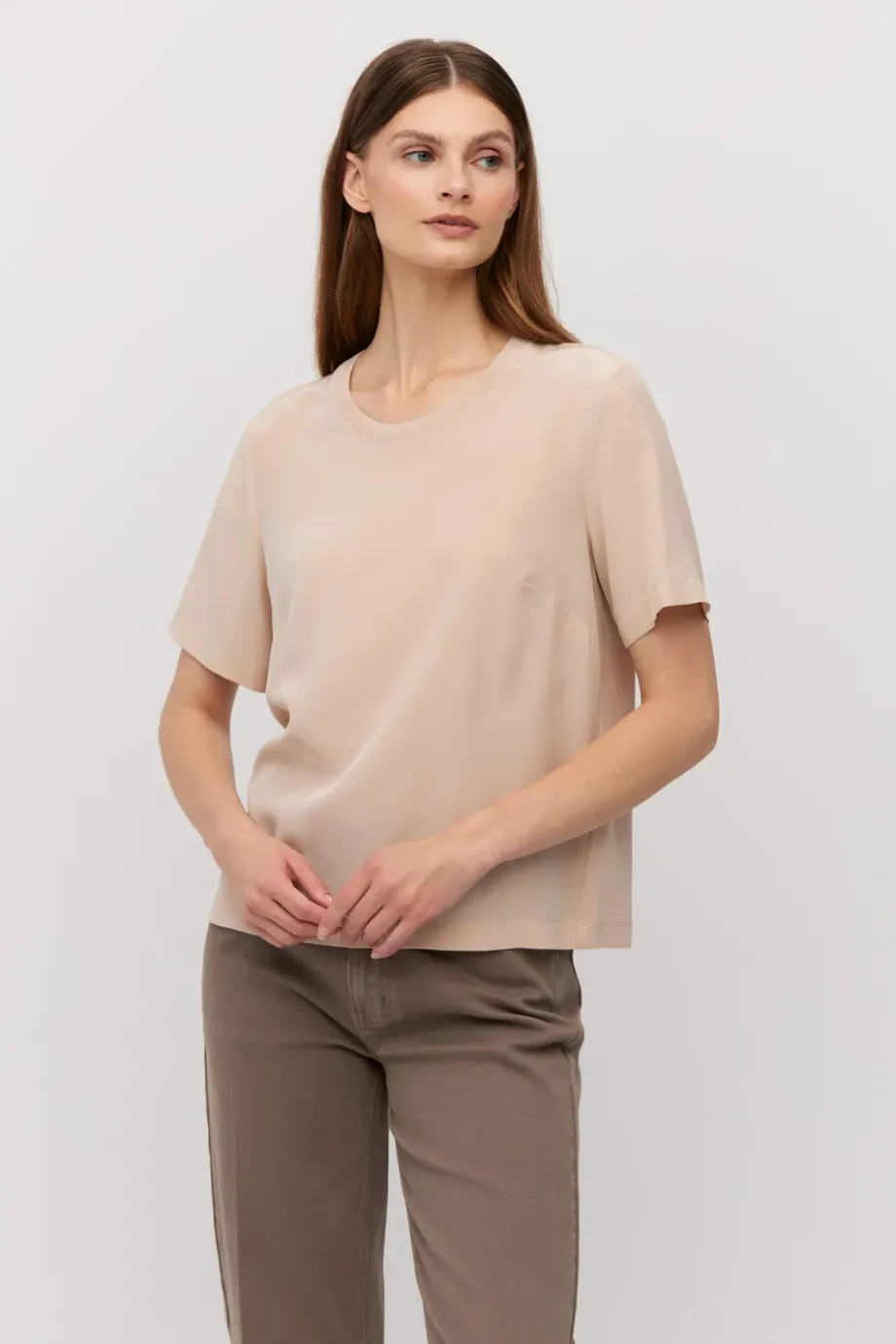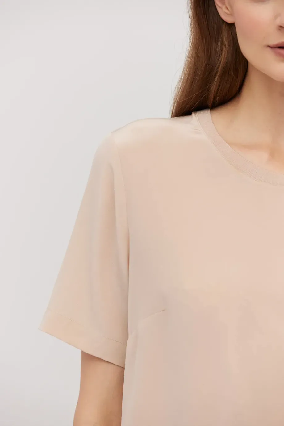 Acest tricou are parte din față din mătase și partea din spate tricotată. Croială dreaptă, ușor pătrată, cu decolteu rotund și mâneci scurte.