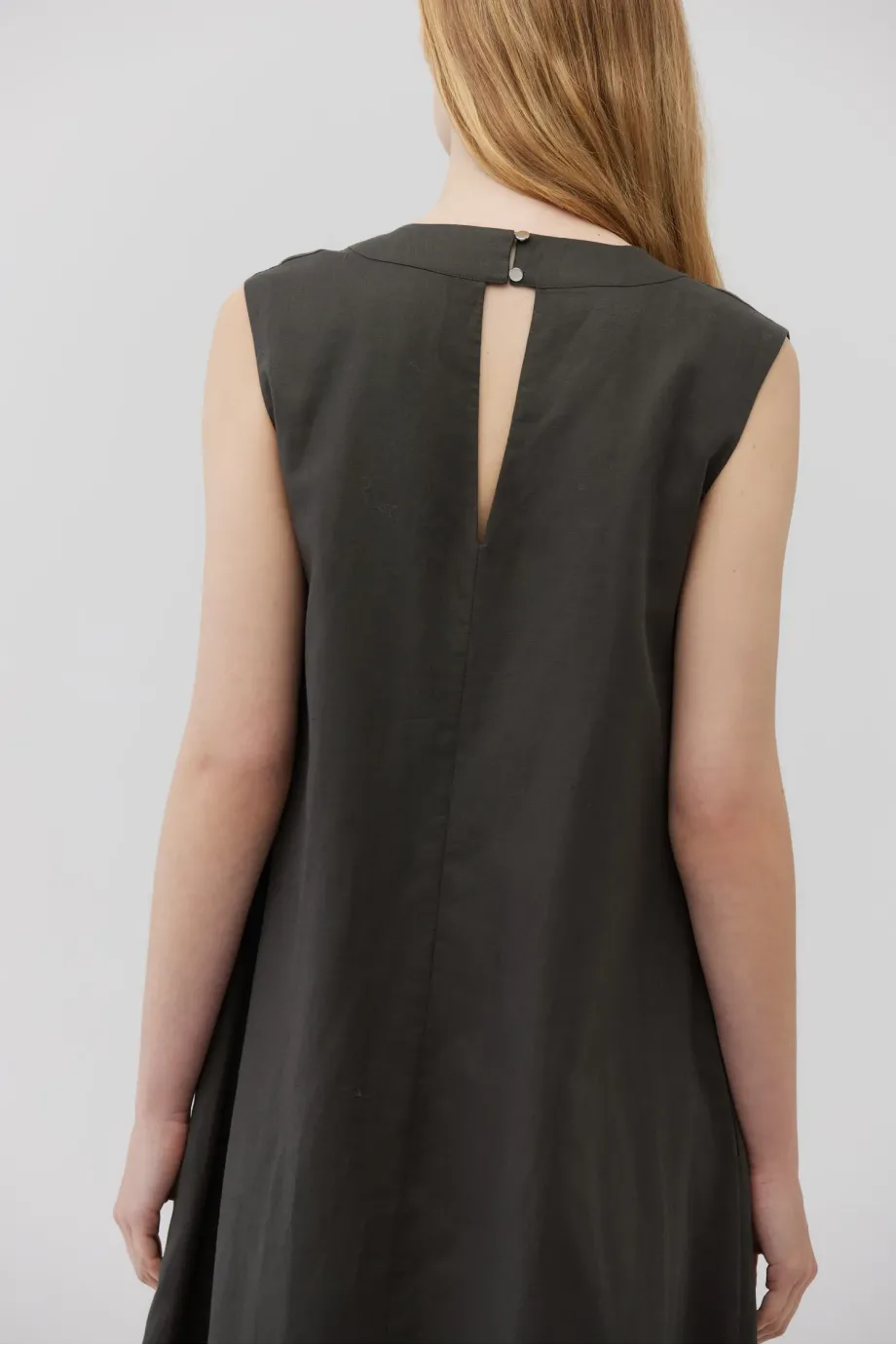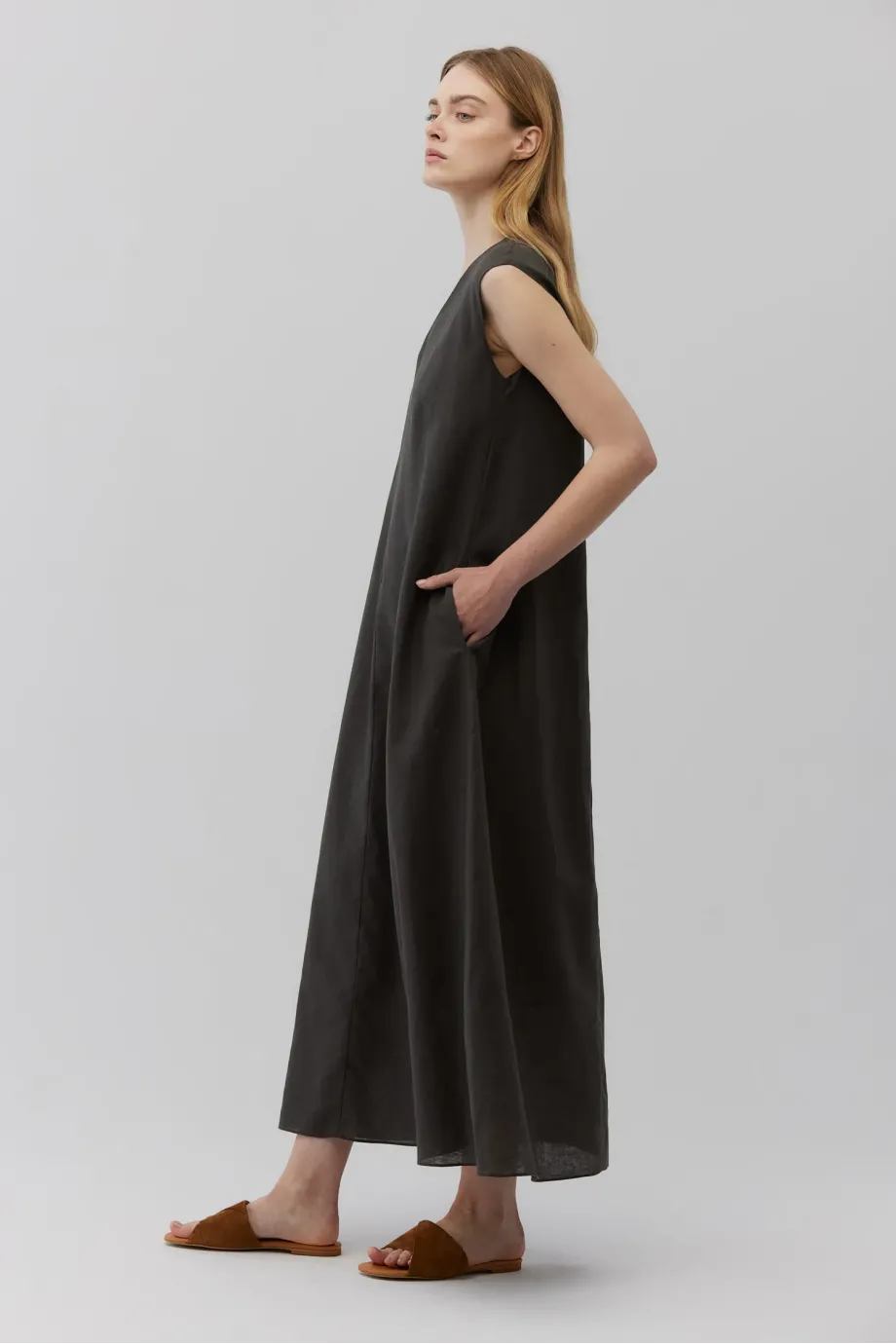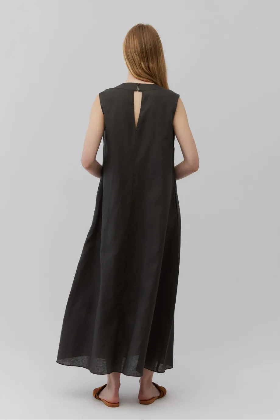 Rochie lungă fără mâneci. Croială în linie A. Decolteu în V în față și decupaj la spate. Închidere cu nasture la spate. Buzunare laterale cu cusătură. Țesătură din amestec de in și bumbac. Culoare verde militar.