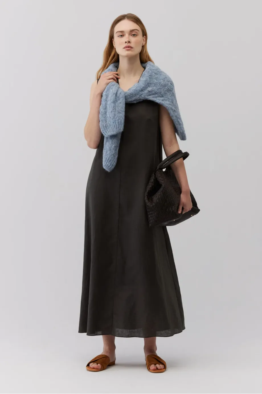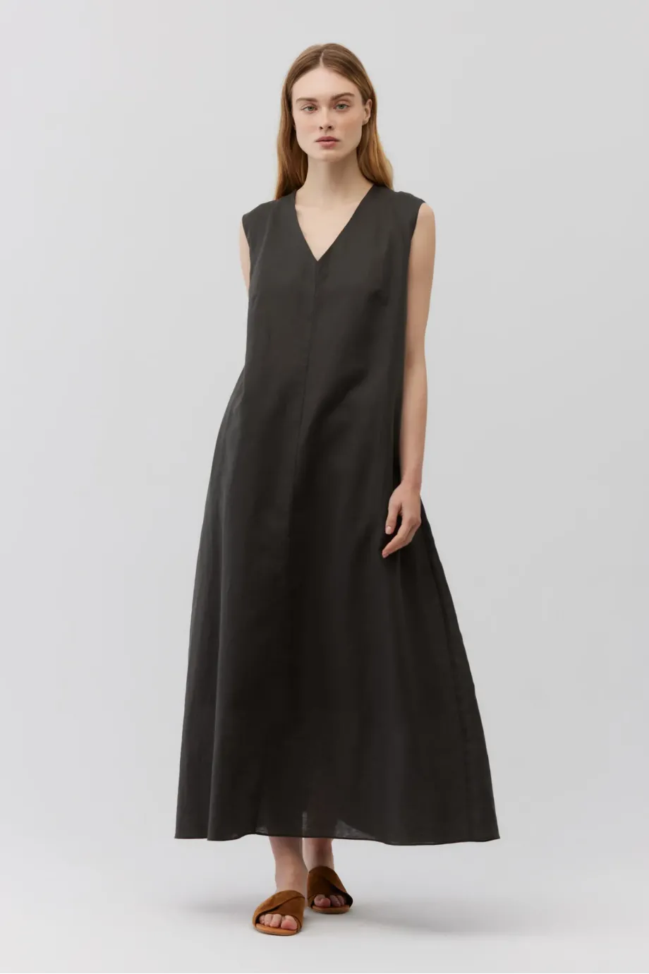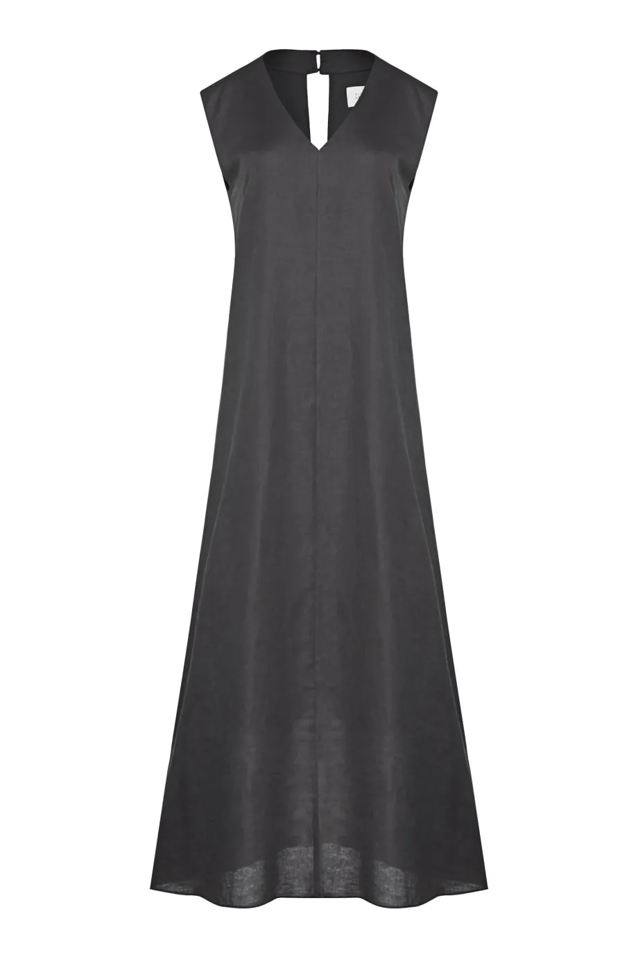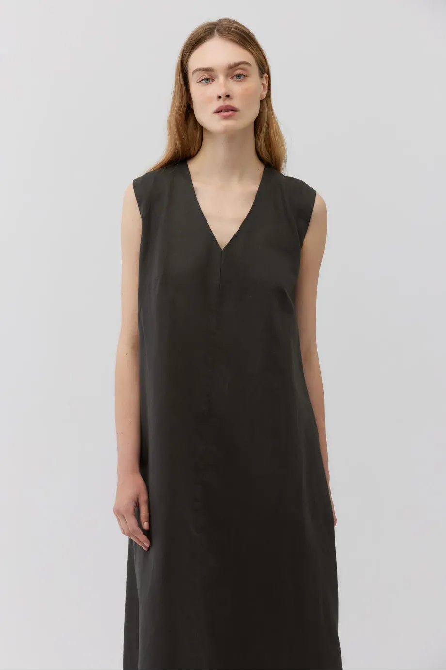 Rochie lungă fără mâneci. Croială în linie A. Decolteu în V în față și decupaj la spate. Închidere cu nasture la spate. Buzunare laterale cu cusătură. Țesătură din amestec de in și bumbac. Culoare verde militar.