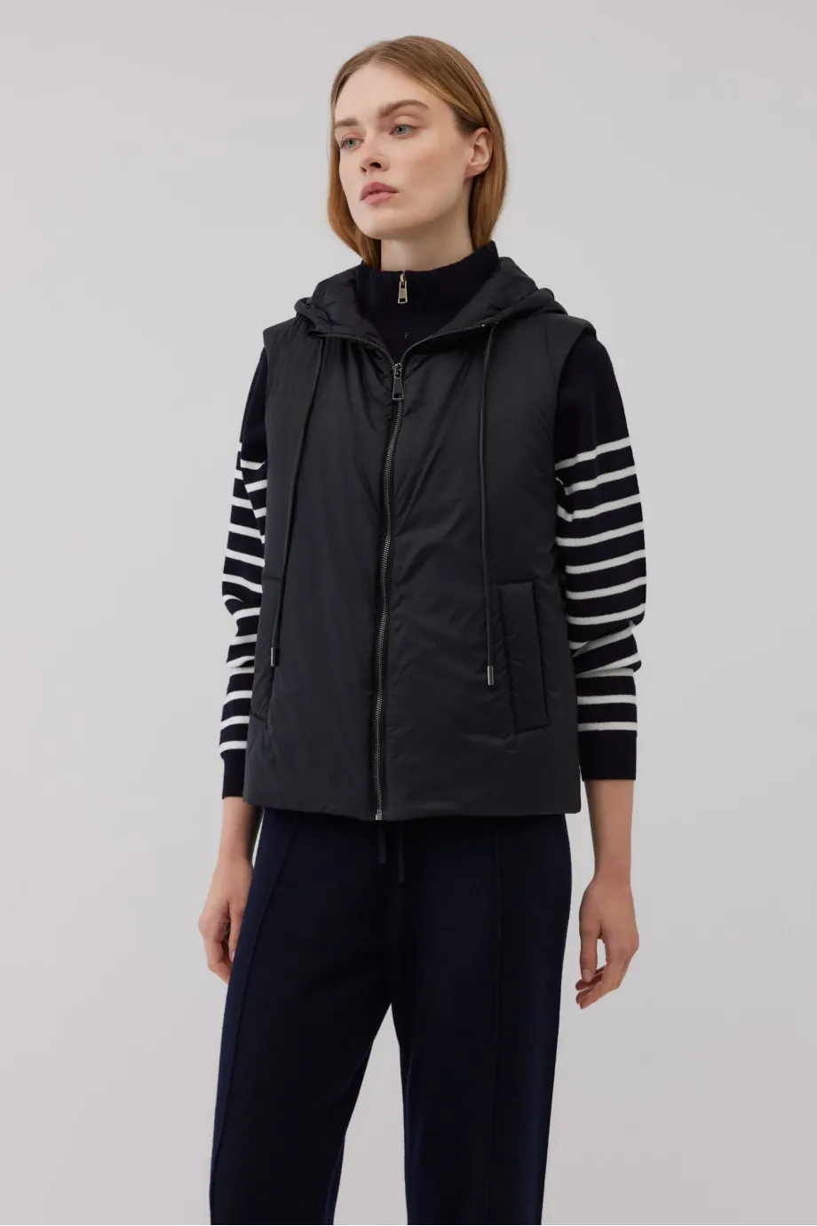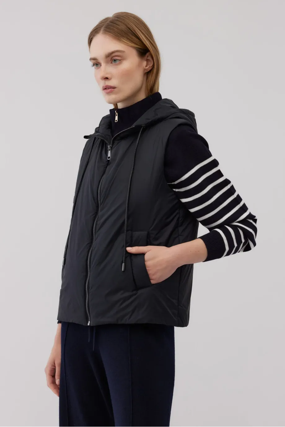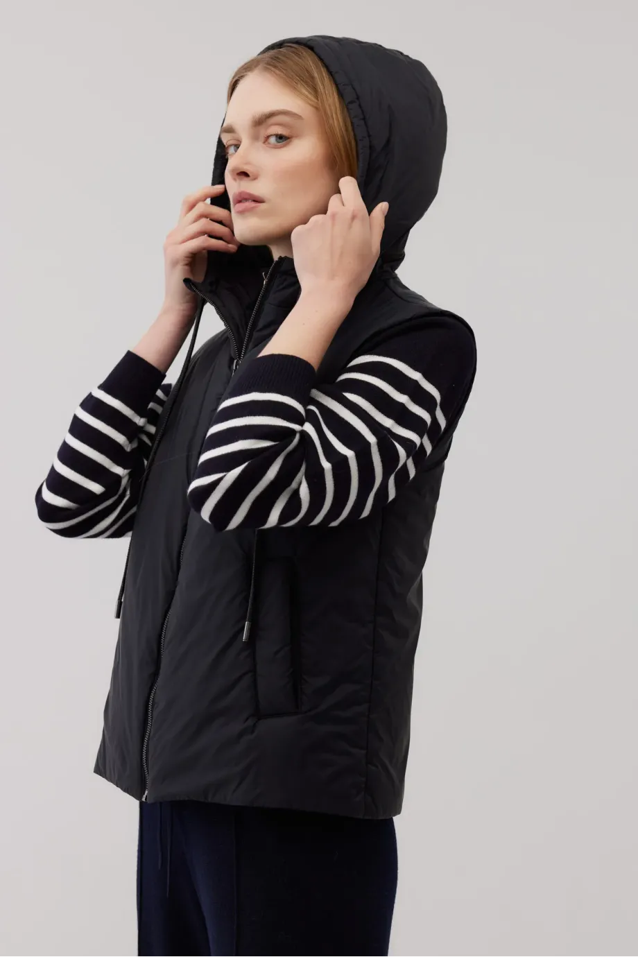 Vestă cu umplutură de lână de cămilă. Închidere cu fermoar. Buzunare laterale. Glugă reglabilă. Culoarea neagră. Disponibilă în două culori. Ideală pentru zilele mai răcoroase, purtată ca strat exterior sau ca izolație sub un palton.