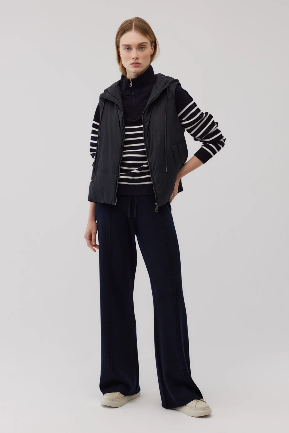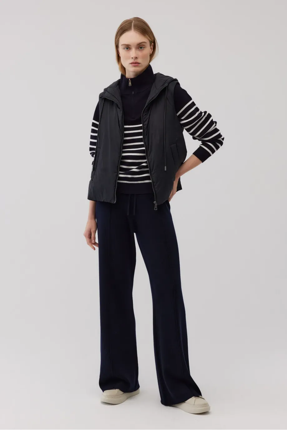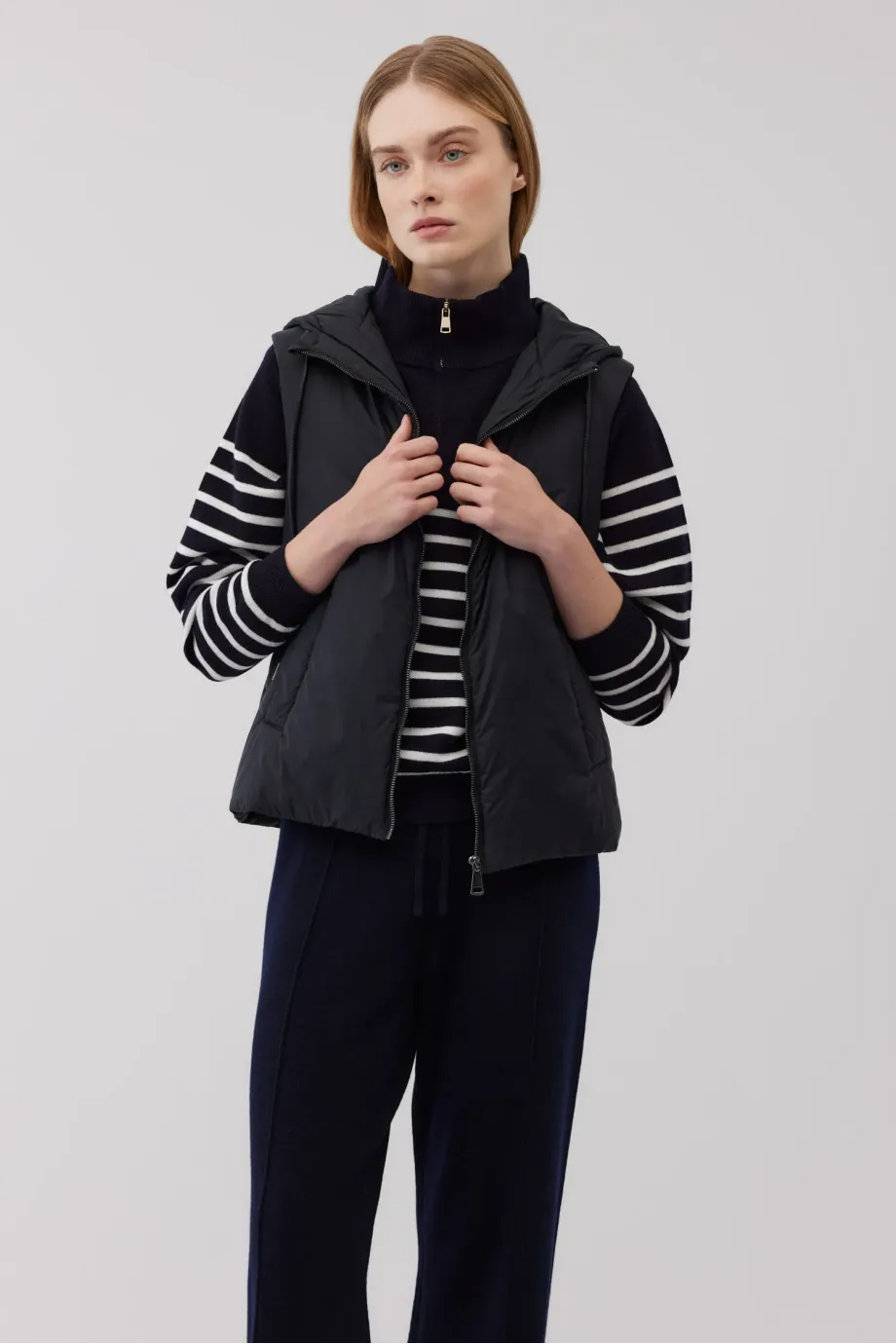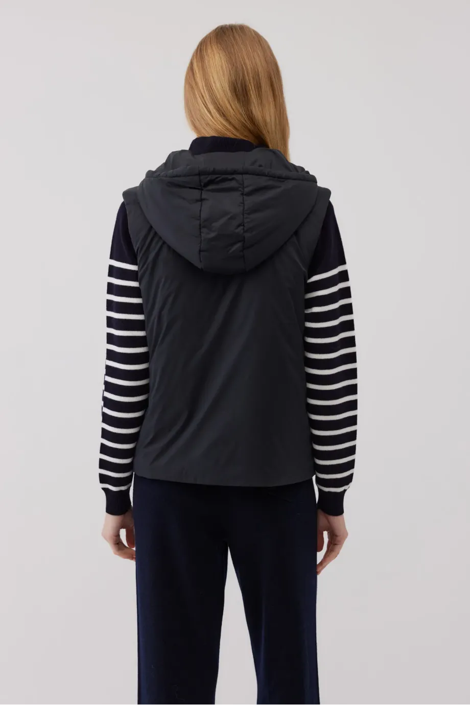 Vestă cu umplutură de lână de cămilă. Închidere cu fermoar. Buzunare laterale. Glugă reglabilă. Culoarea neagră. Disponibilă în două culori. Ideală pentru zilele mai răcoroase, purtată ca strat exterior sau ca izolație sub un palton.