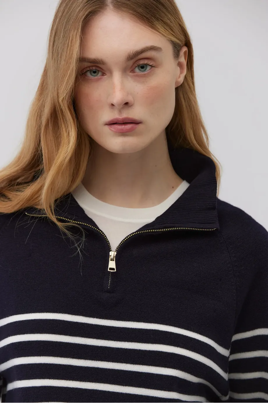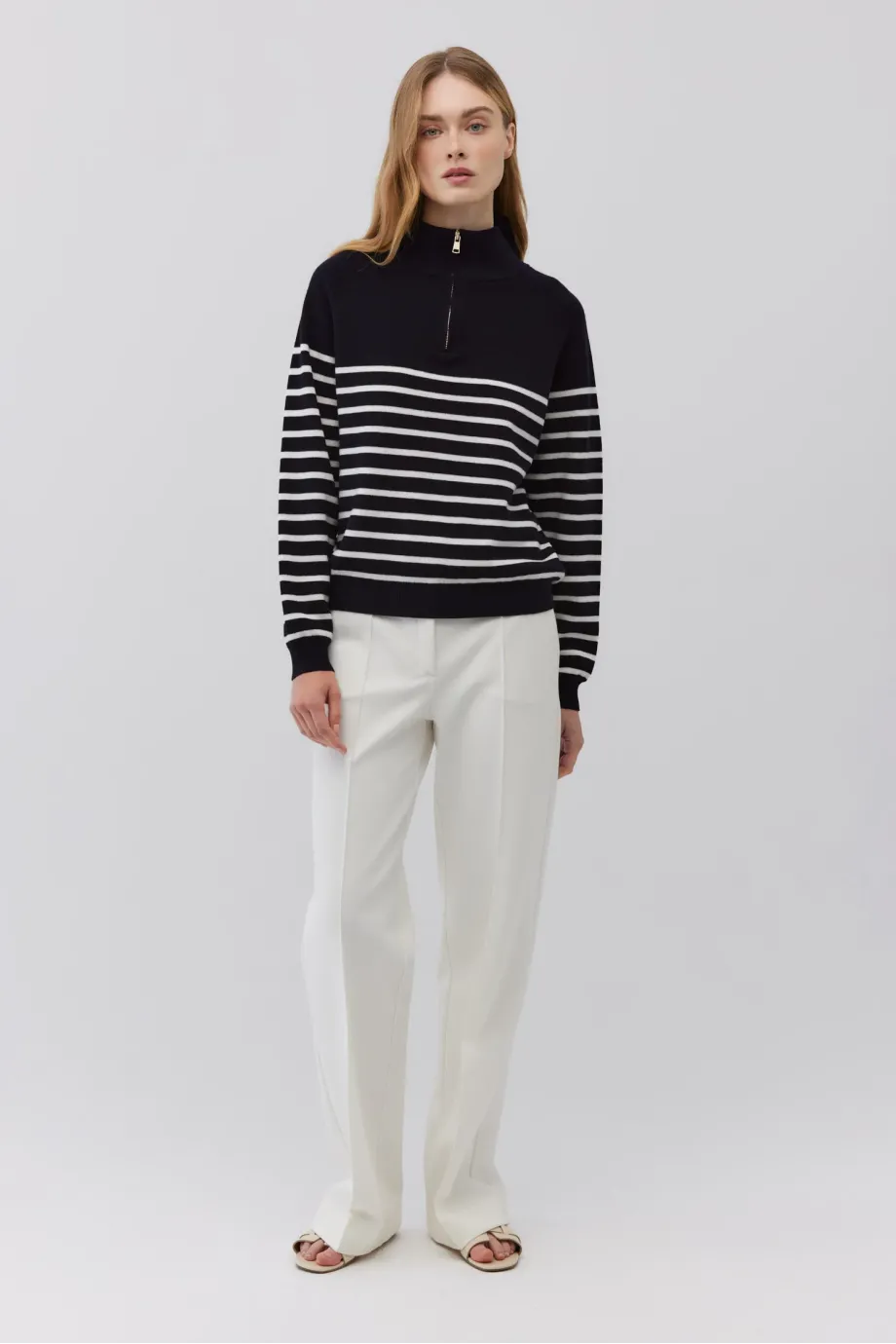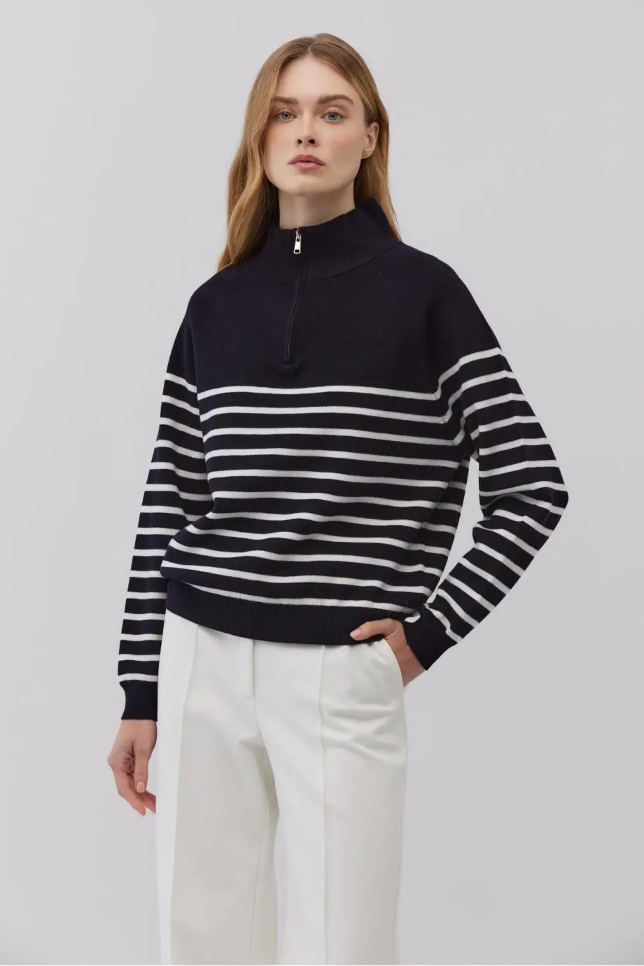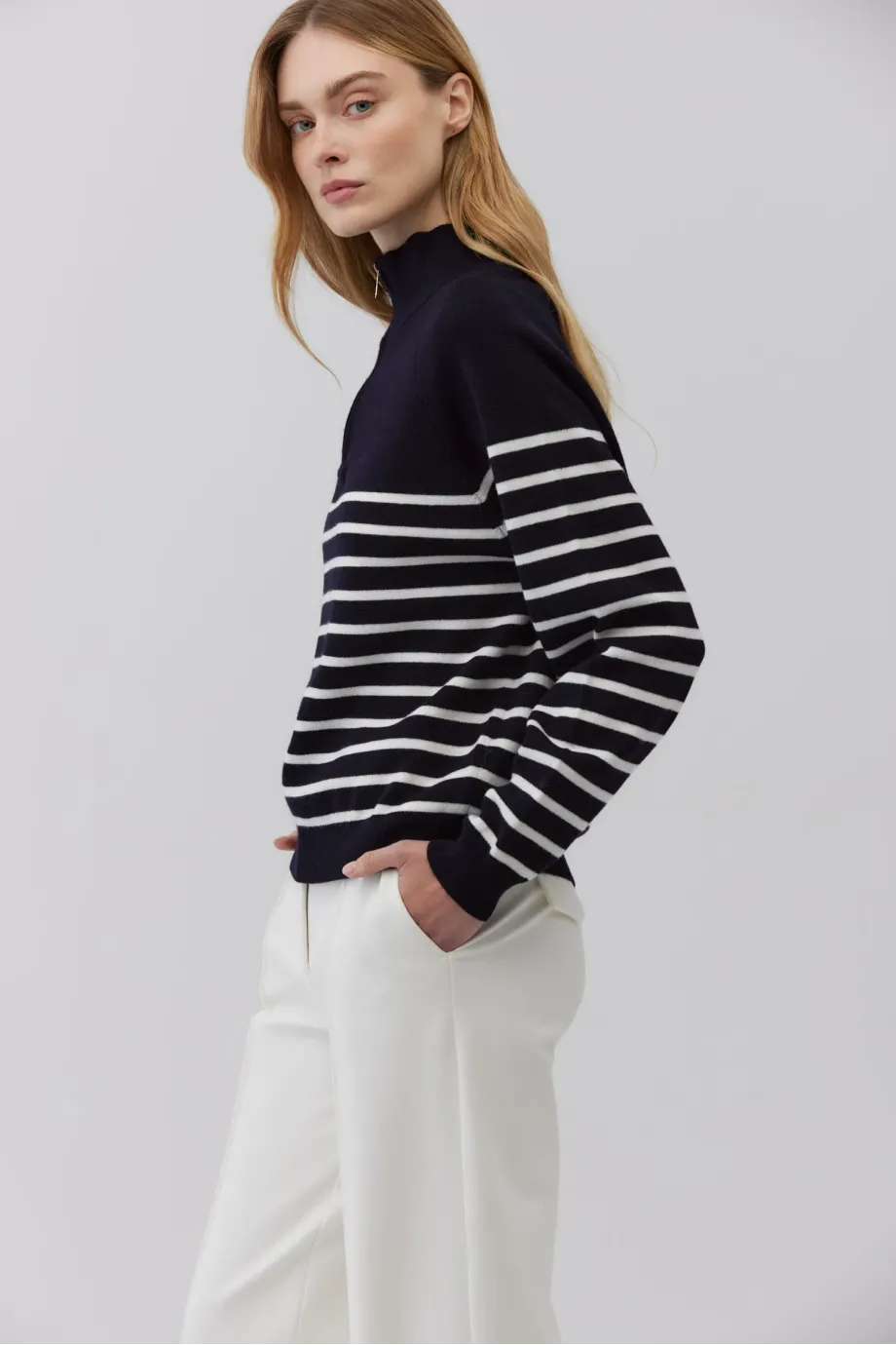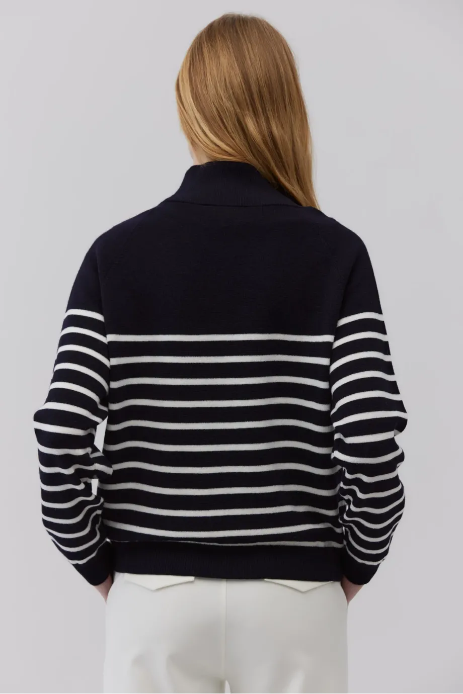 Pulover din lână merinos albastru royal închis cu dungi albe. Tricot gros, cu cusături îndoite. Croială lejeră, cu guler înalt și închidere cu fermoar. Mâneci lungi, terminate cu manșete rib.