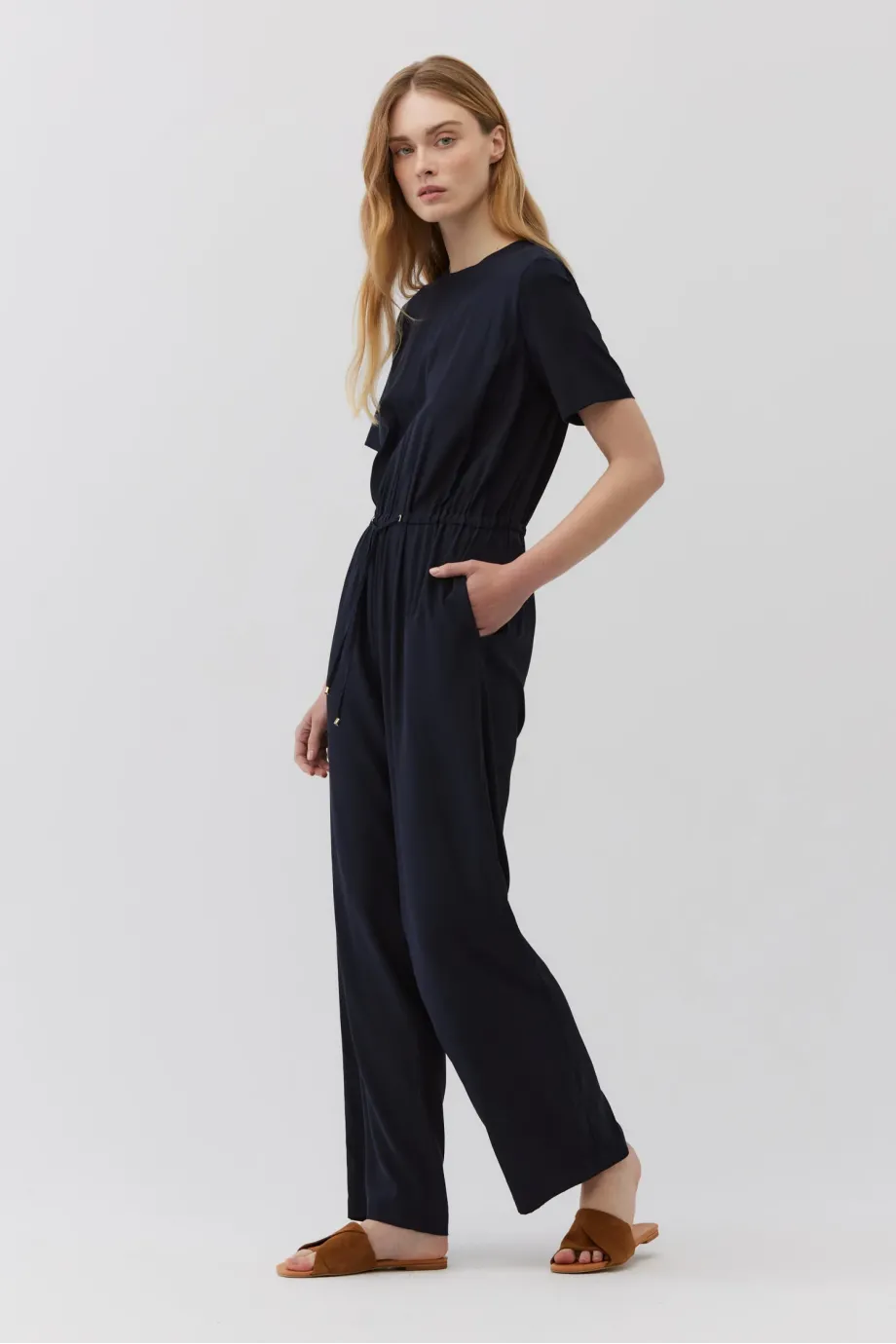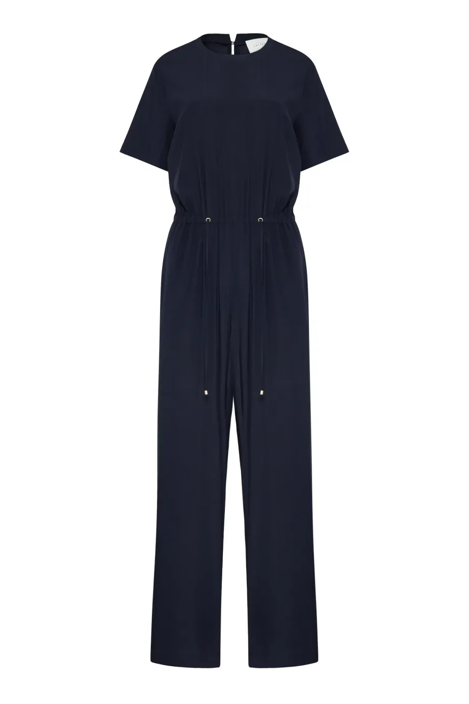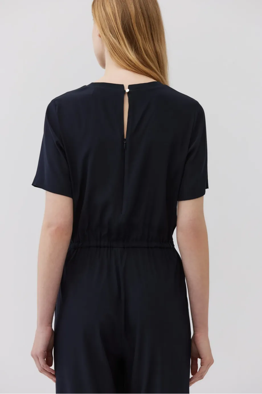 Salopetă albastru royal închis cu mâneci scurte. Croială dreaptă, lungă și lejeră. Talie elastică, reglabilă cu șnur. Decolteu rotund. Închidere la spate cu fermoar și nasture. Buzunare discrete, ascunse în cusăturile laterale. Confecționată din mătase.