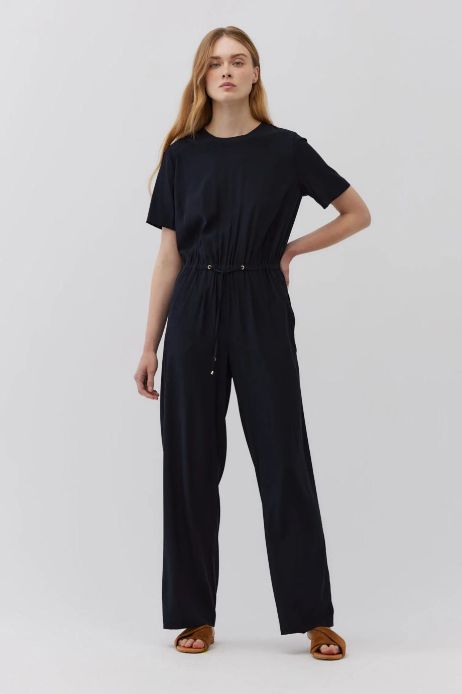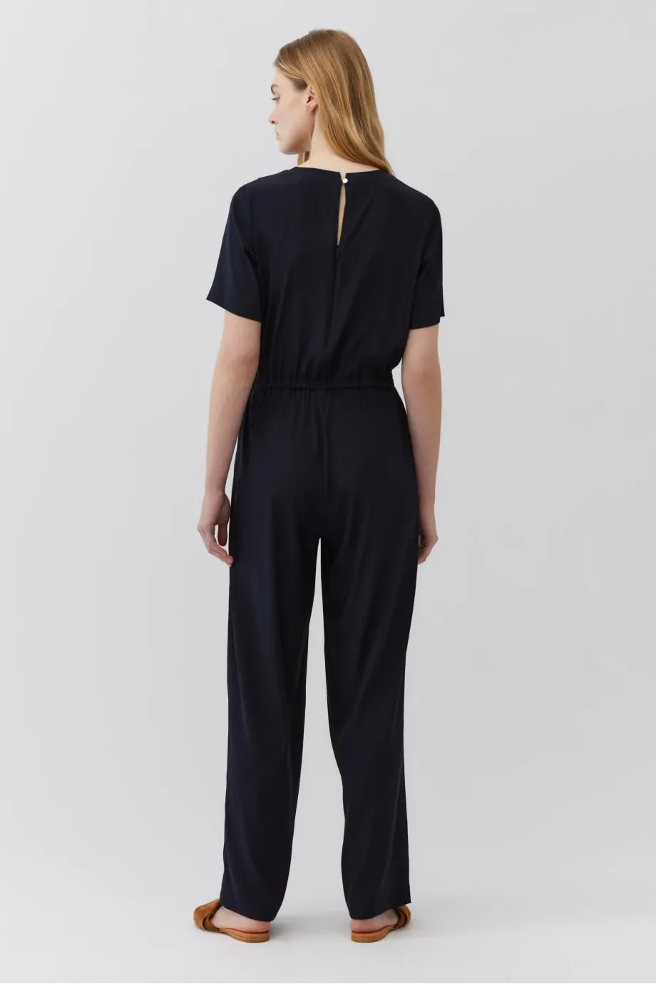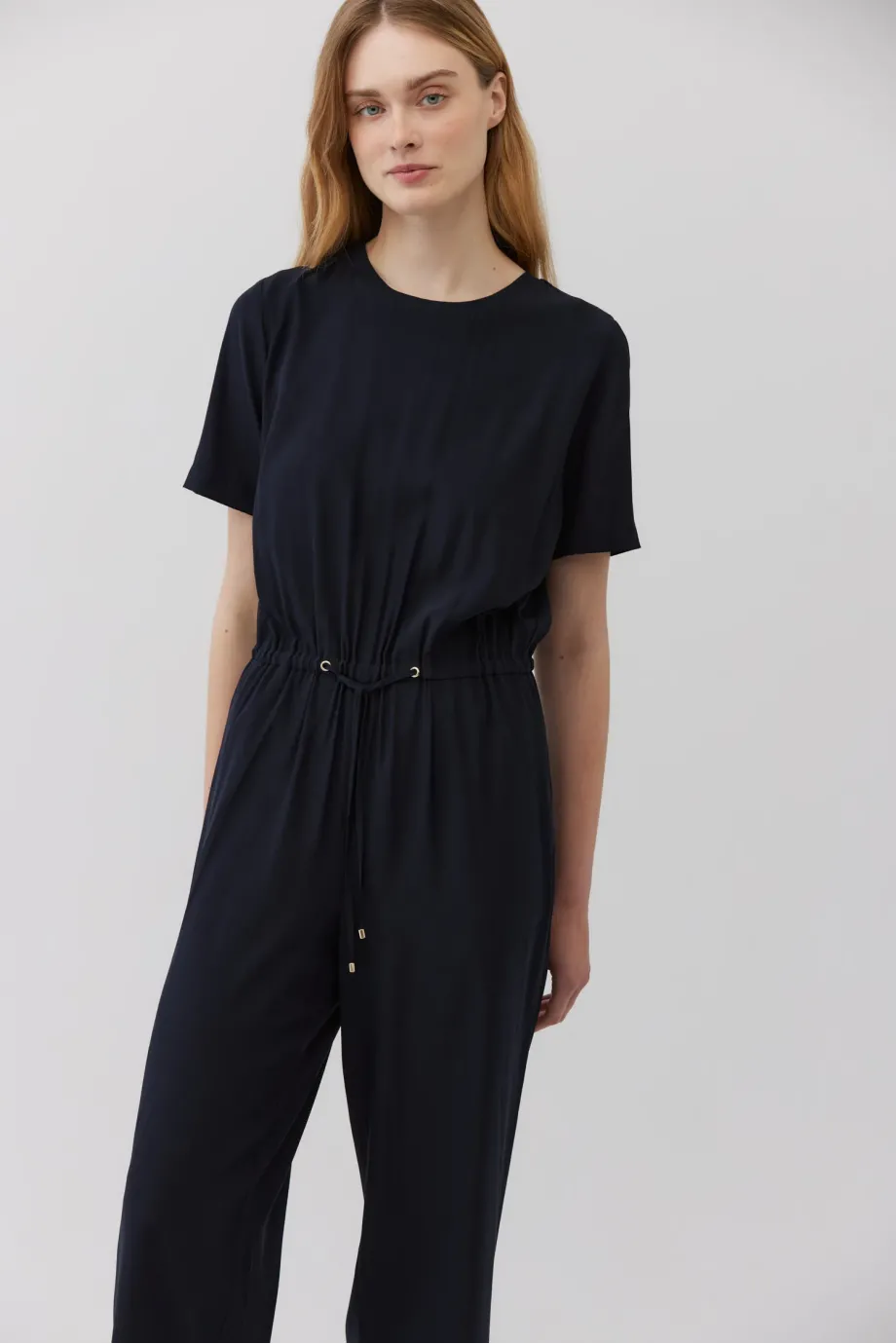 Salopetă albastru royal închis cu mâneci scurte. Croială dreaptă, lungă și lejeră. Talie elastică, reglabilă cu șnur. Decolteu rotund. Închidere la spate cu fermoar și nasture. Buzunare discrete, ascunse în cusăturile laterale. Confecționată din mătase.
