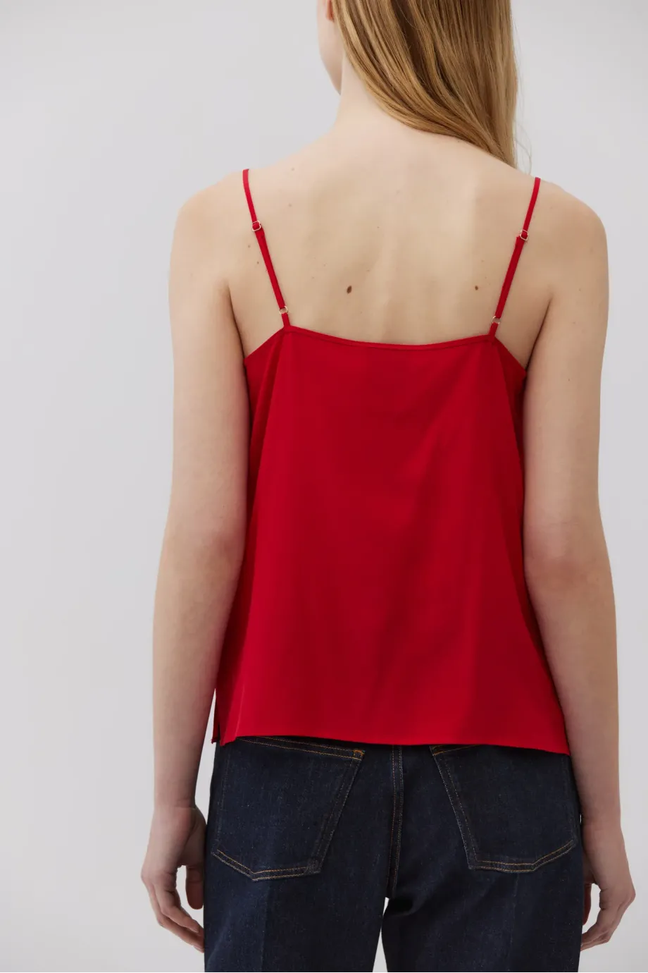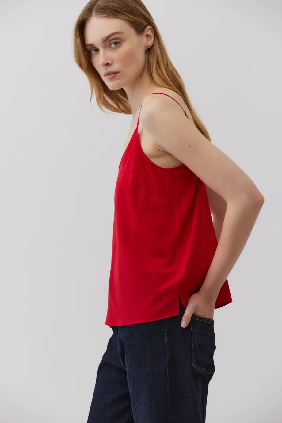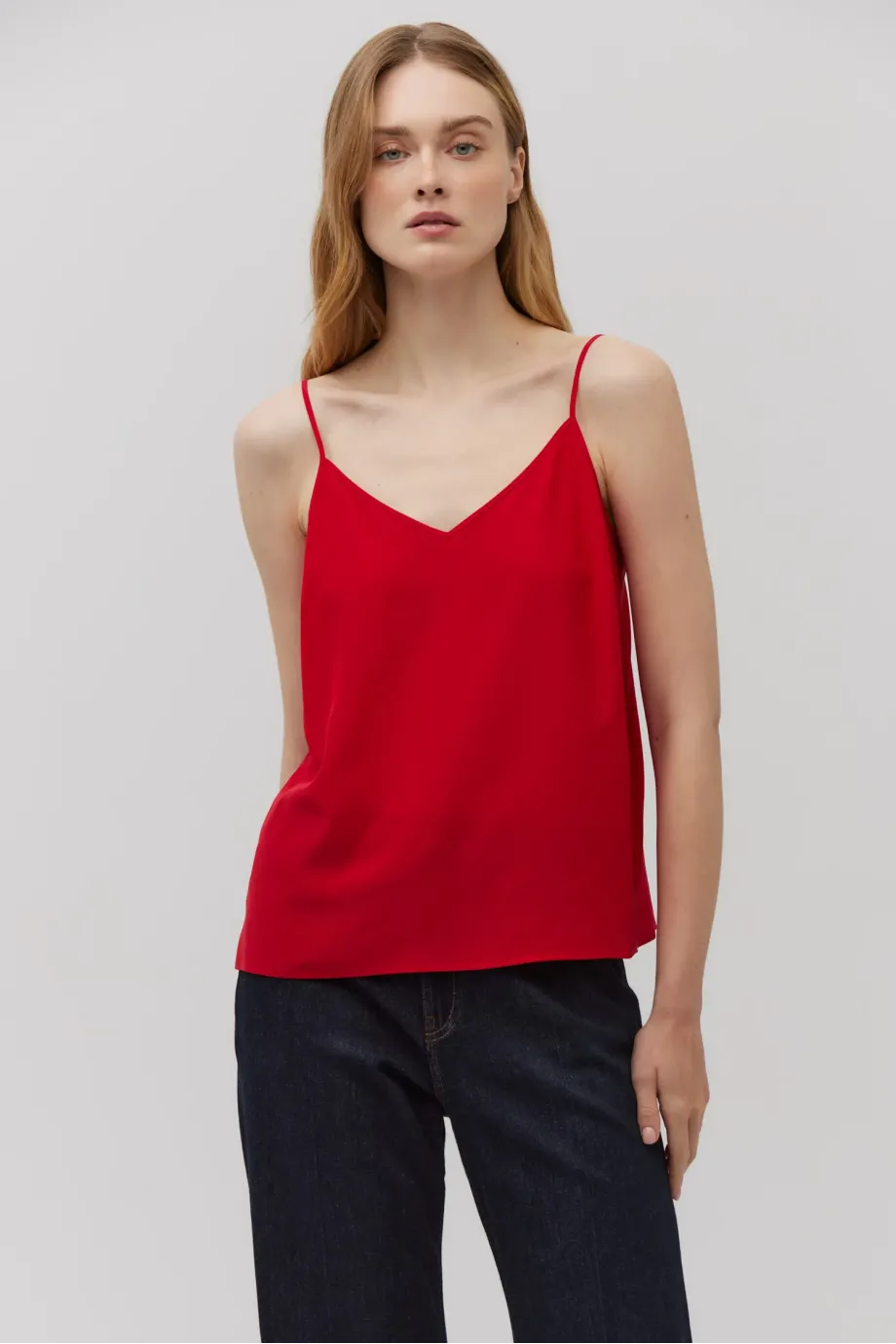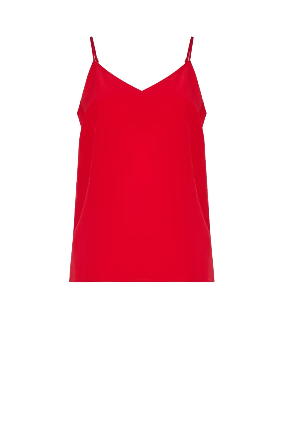 Top cu bretele subțiri și reglabile. Fabricat 100% din mătase — ușor și neted. Croi lejer, decolteu în V. Culoare: roșu intens.