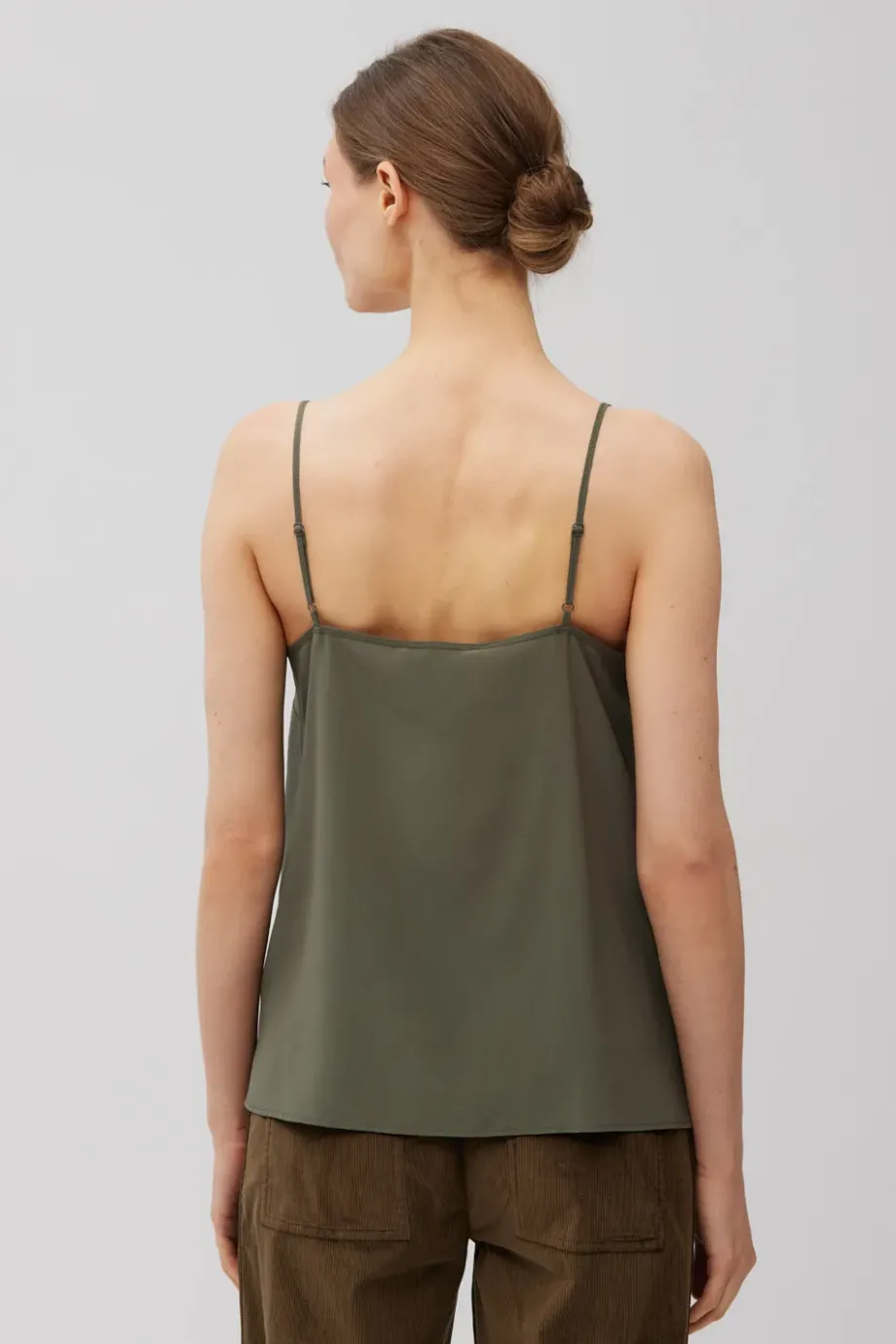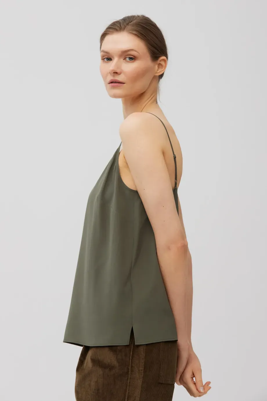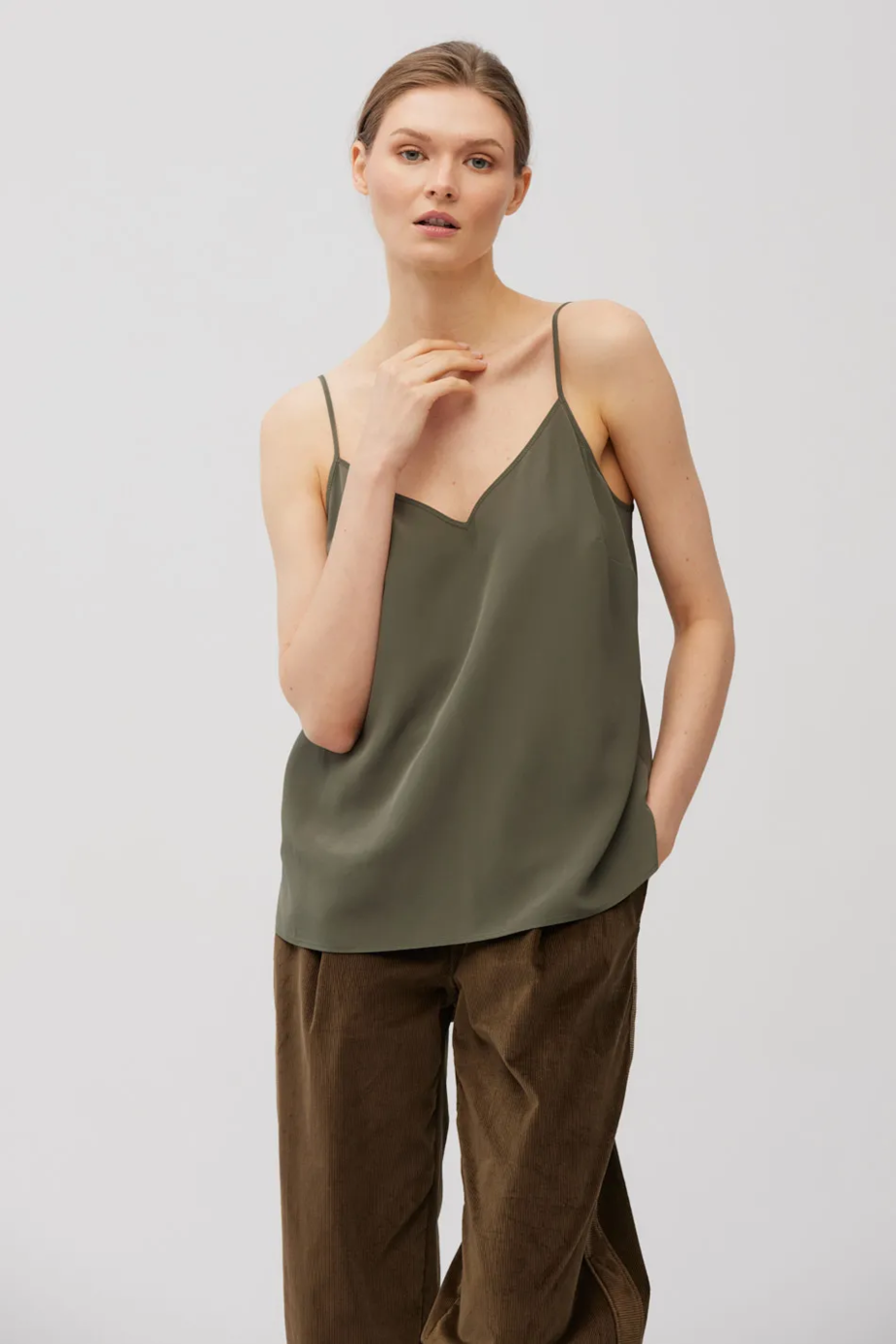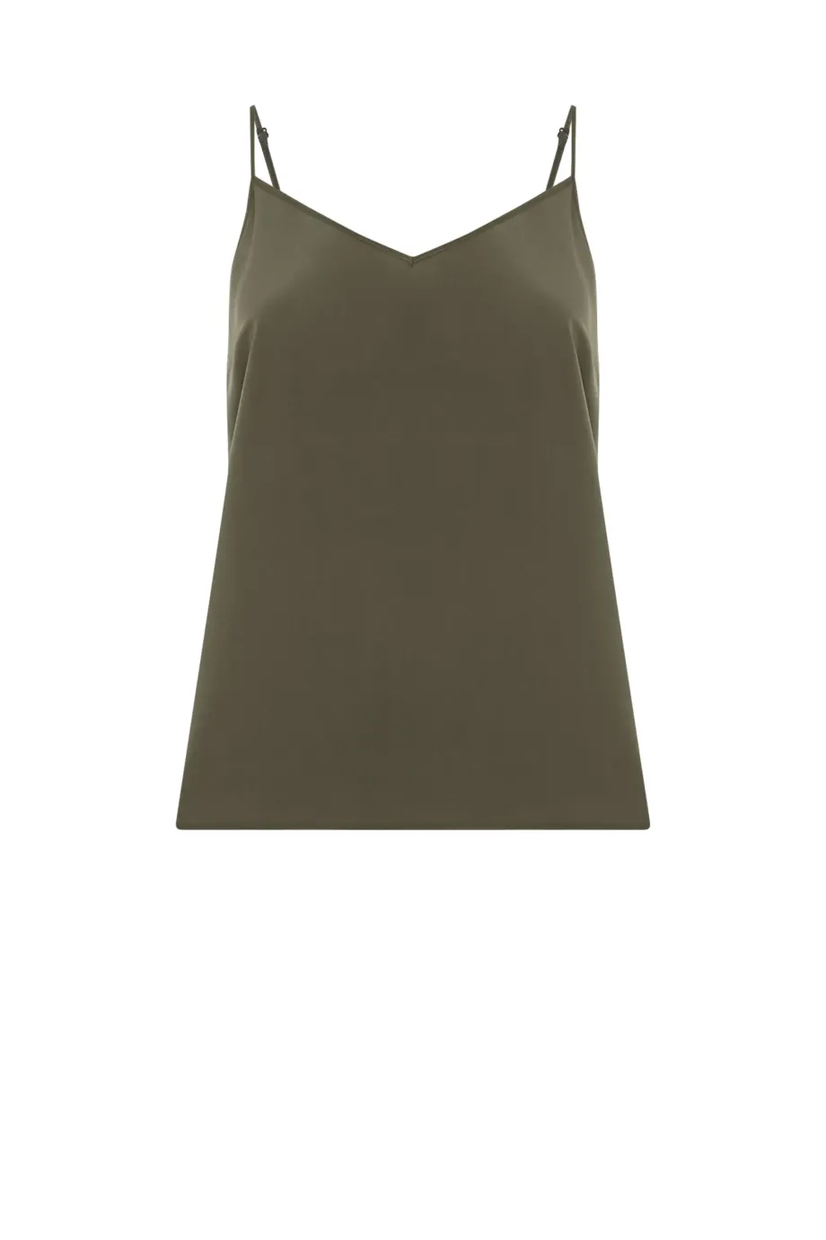 Top cu bretele subțiri și reglabile. Fabricat 100% din mătase — ușor și neted. Croi lejer, decolteu în V. Culoare: verde măslinie.