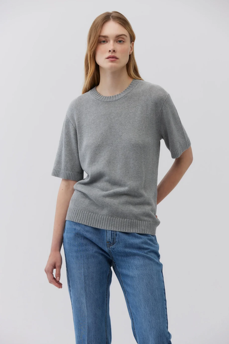 Tricou gri, cu mâneci scurte și gât rotund. Croi drept, lejer. Confecționat dintr-un amestec moale de lyocell, bumbac și in. Material tricotat uni, lejer. Disponibil în două culori.