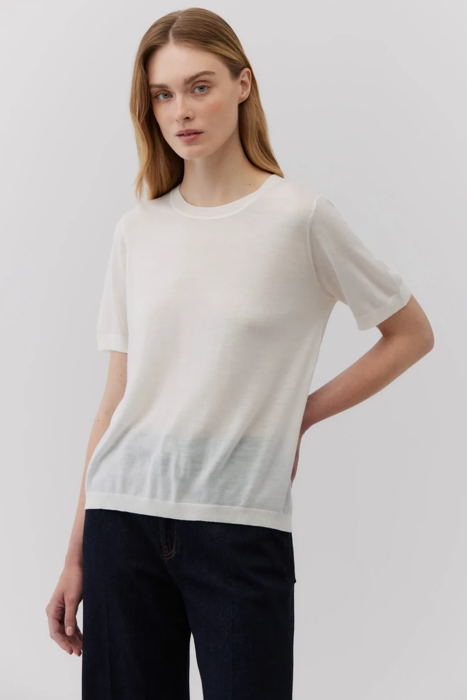 Tricou alb din lână merinos. Decolteu rotund. Mâneci scurte. Țesătură moale la atingere, subtil semitransparentă. Tricot fin, dens, single-jersey. Croi simplu, clasic. Disponibil în 2 culori.