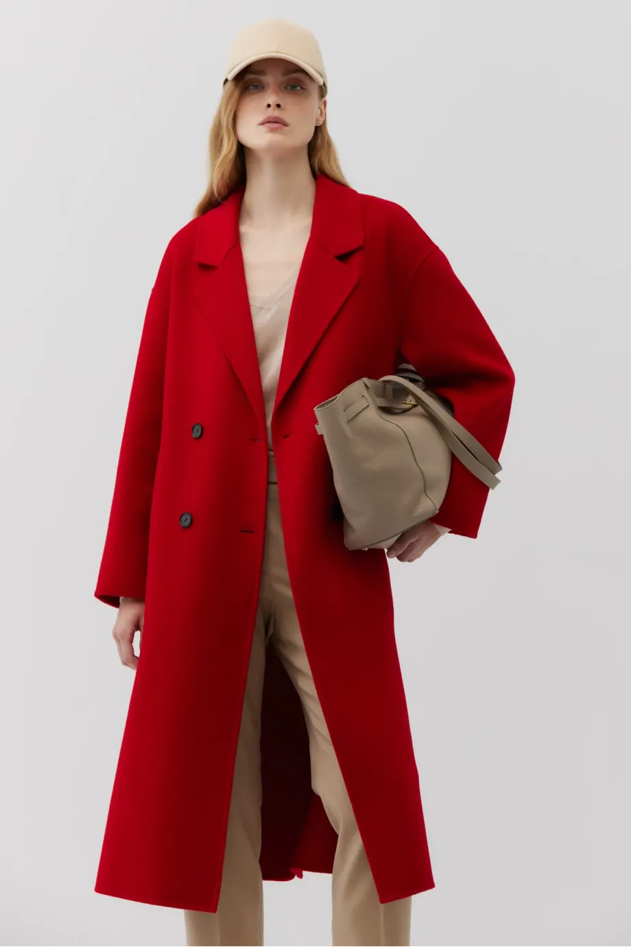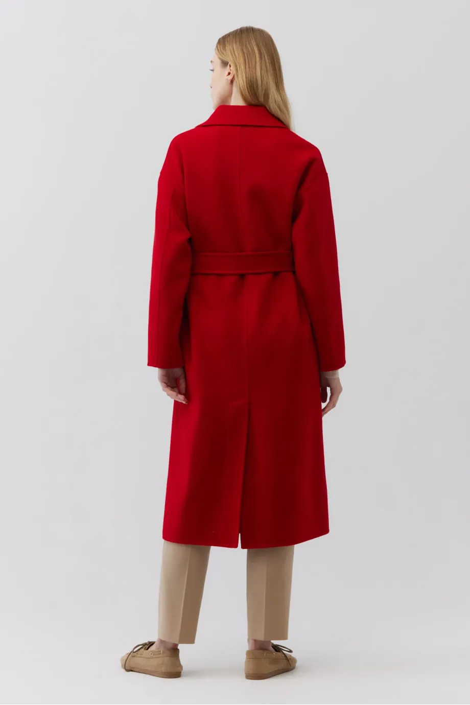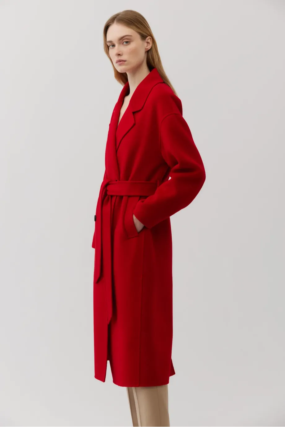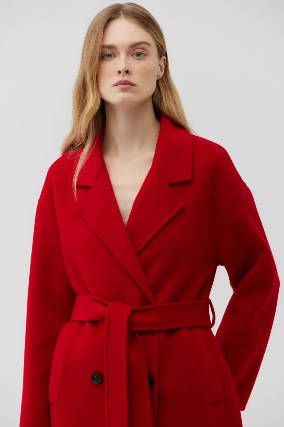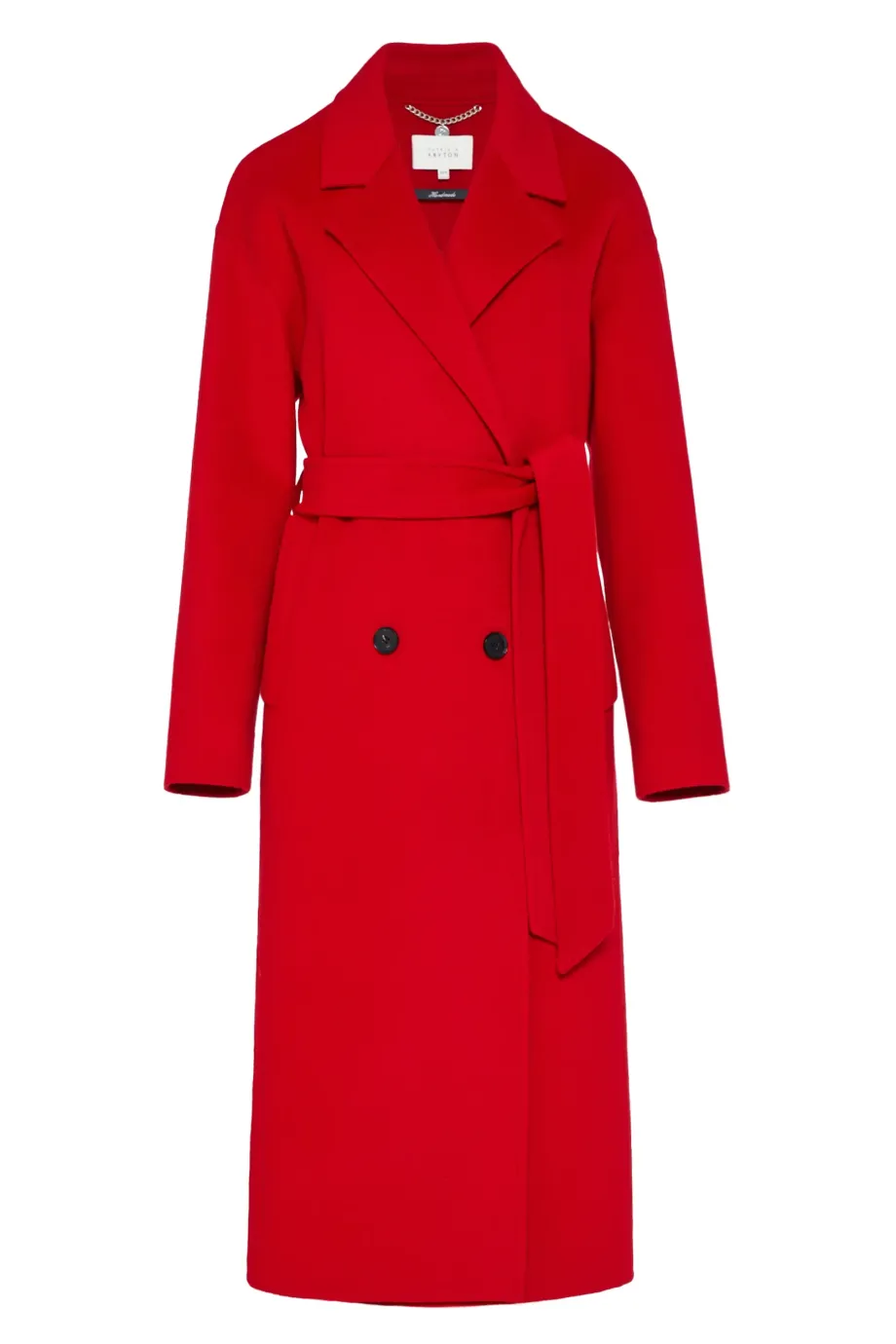 Palton cu doi nasturi, din țesătură double-face — amestec de lână și mătase. Lungime sub genunchi, cordon în talie, guler cu rever. Ușor și necăptușit. Fantă la spate. Culoare roșie.