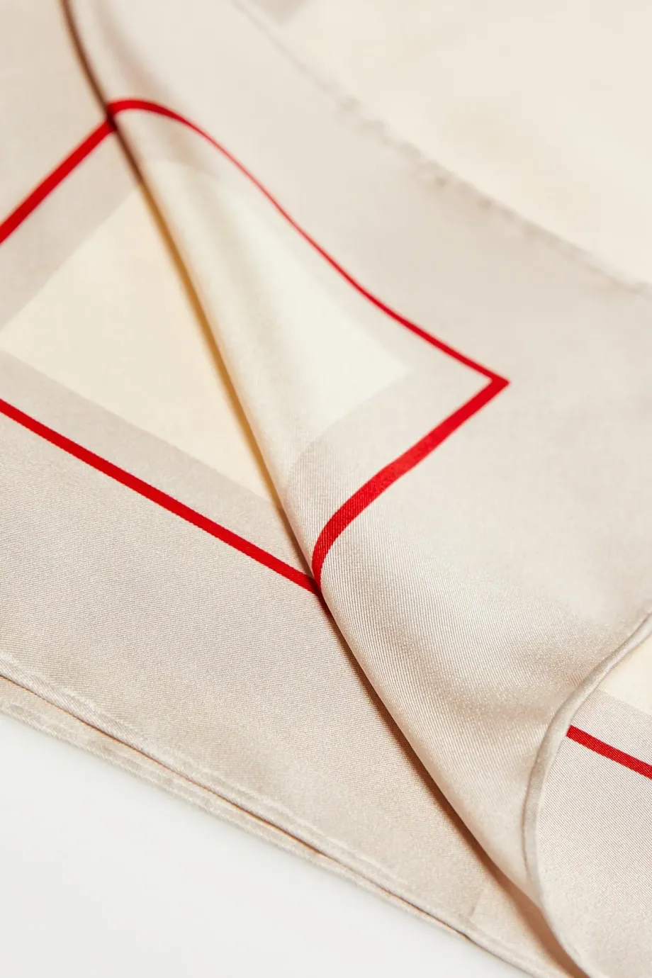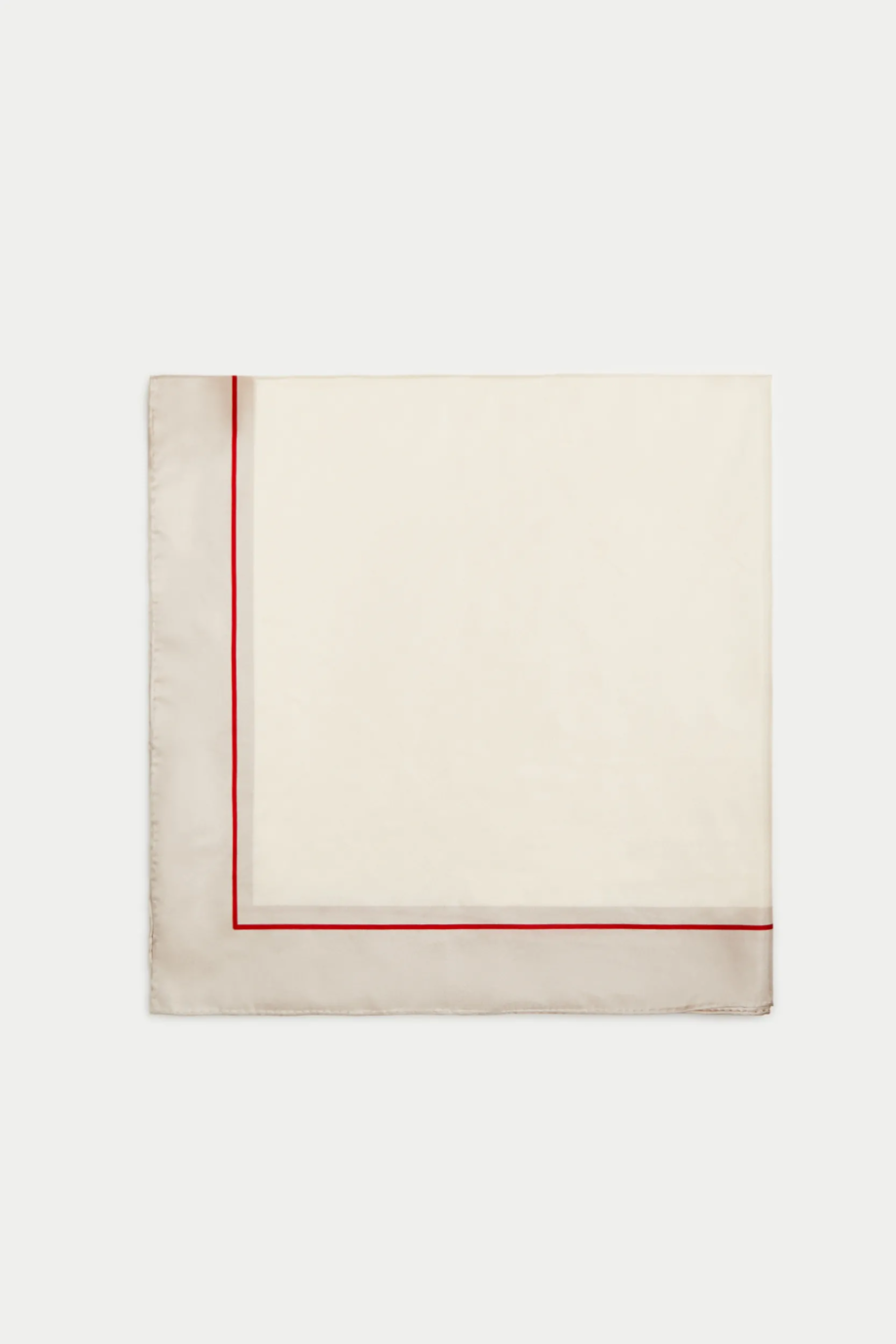 Eșarfă din mătase, într-o paletă minimalistă: nuanțe de bej cu un accent contrastant de roșu.