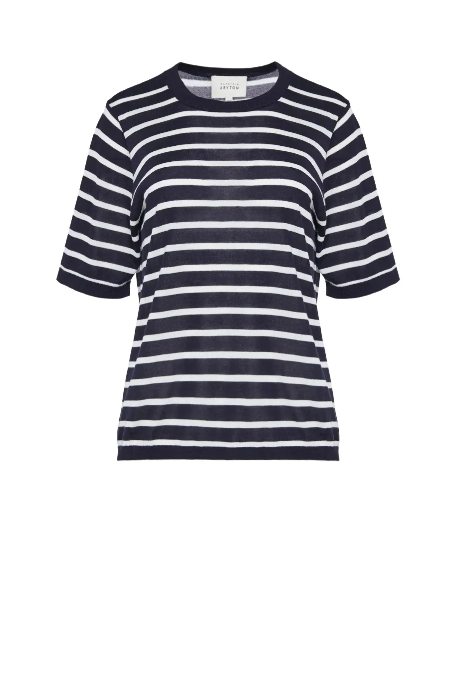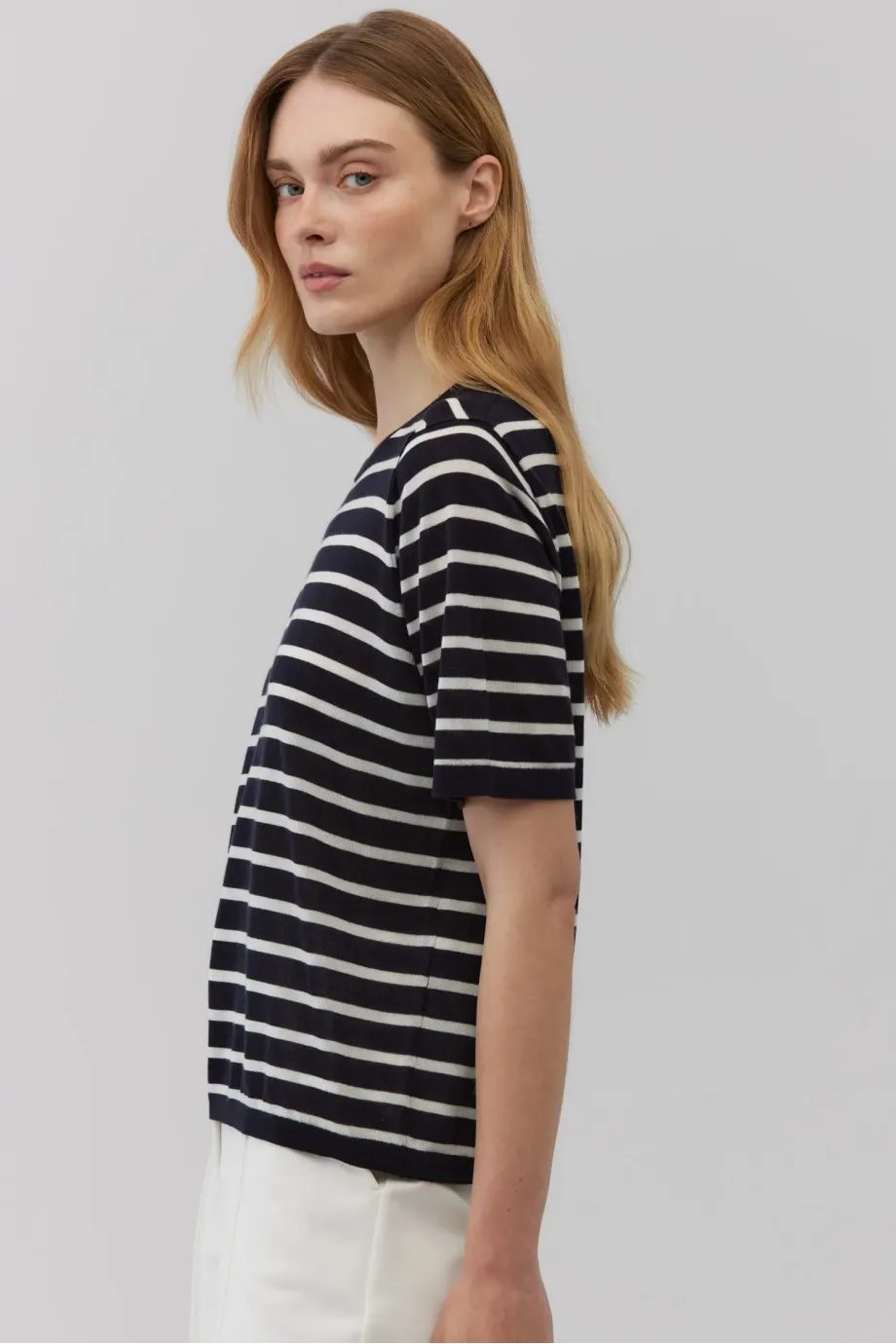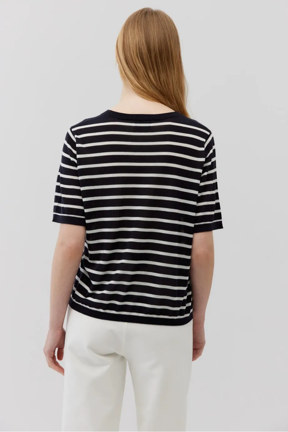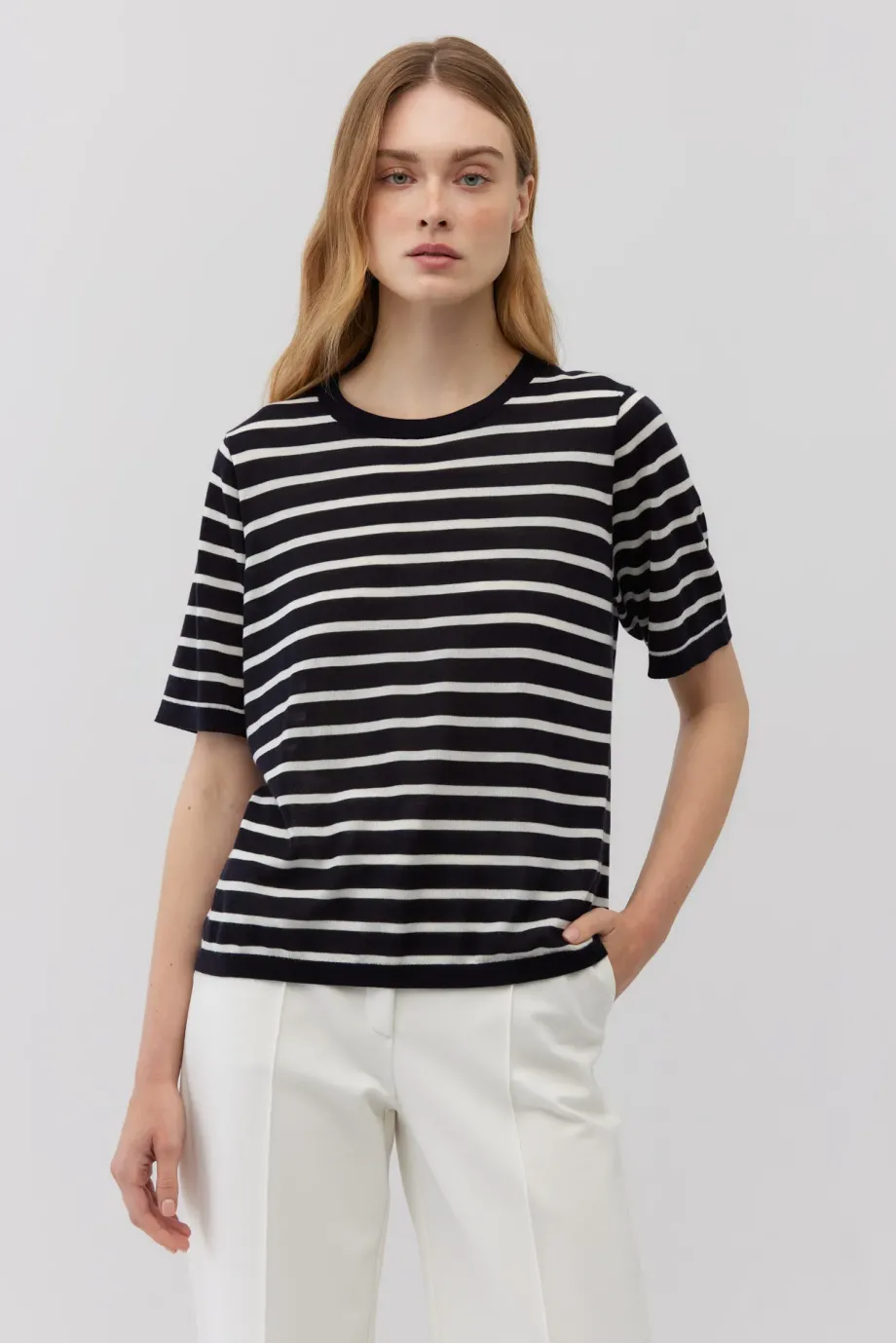 Tricou clasic cu cașmir. Croială dreaptă, ușor lejeră. Mâneci scurte, decolteu rotund. Dungi orizontale — alb pe albastru royal închis, stil marinăresc. Tricot moale, fin și dens, single-jersey.