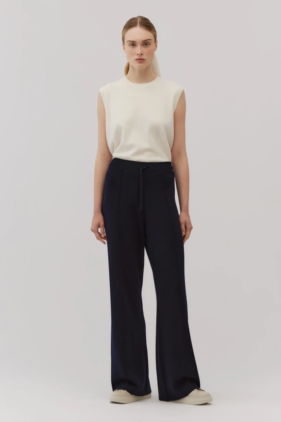 Pantaloni din lână merinos. Croiul pantalonului este largă. Culoare albastru royal închis. Tricot dens, tip full-Milano. Talie elastică, cu șnur reglabil.
