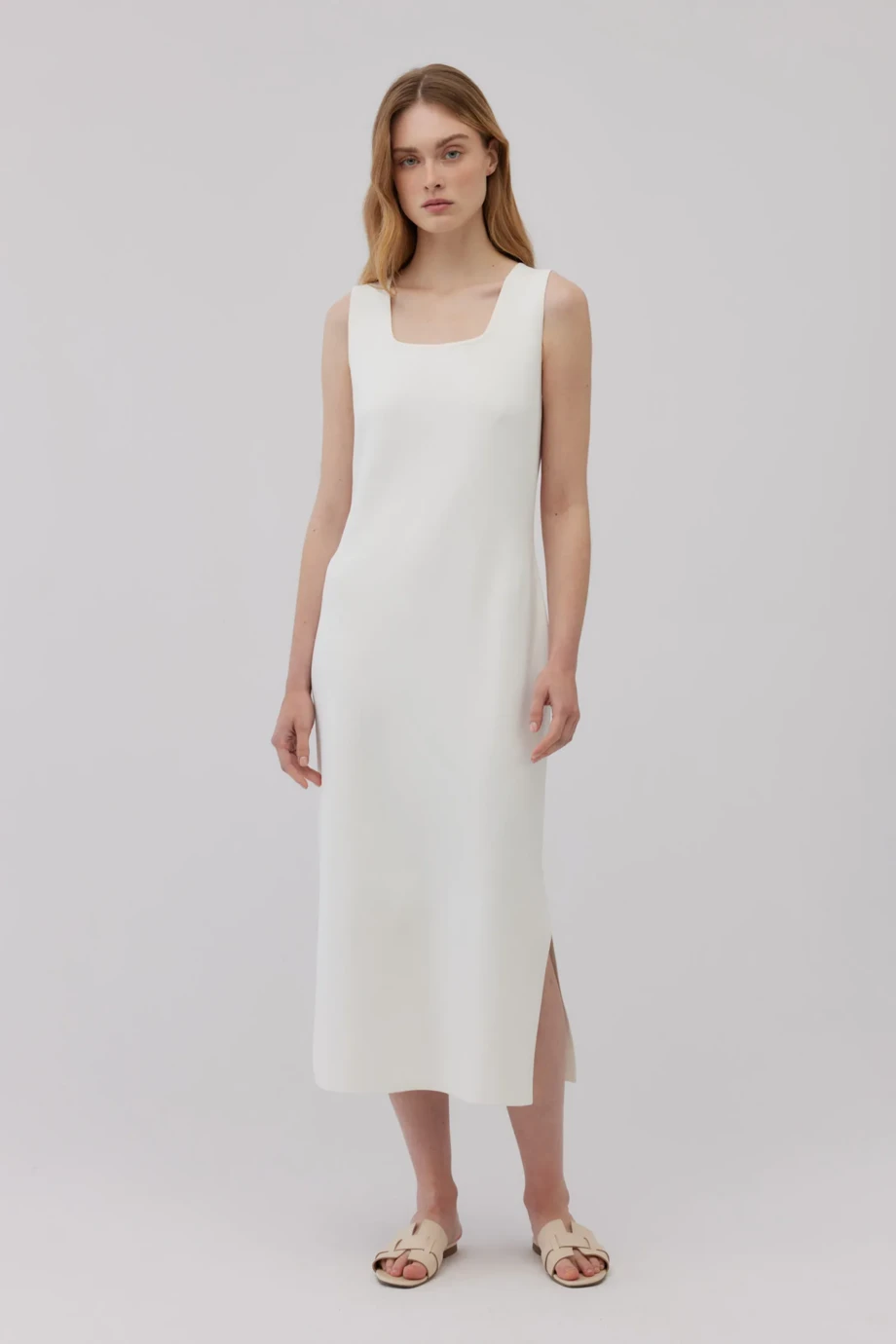 Rochie albă din tricot, cu splot dens full-needle. Decolteu pătrat și bretele late. Lungime midi. Croială dreaptă, ușor mulată, cu fantă laterală. Estetică minimalistă.