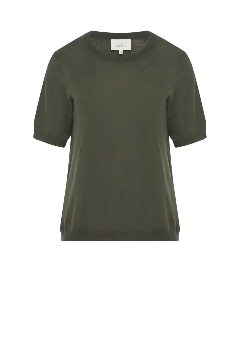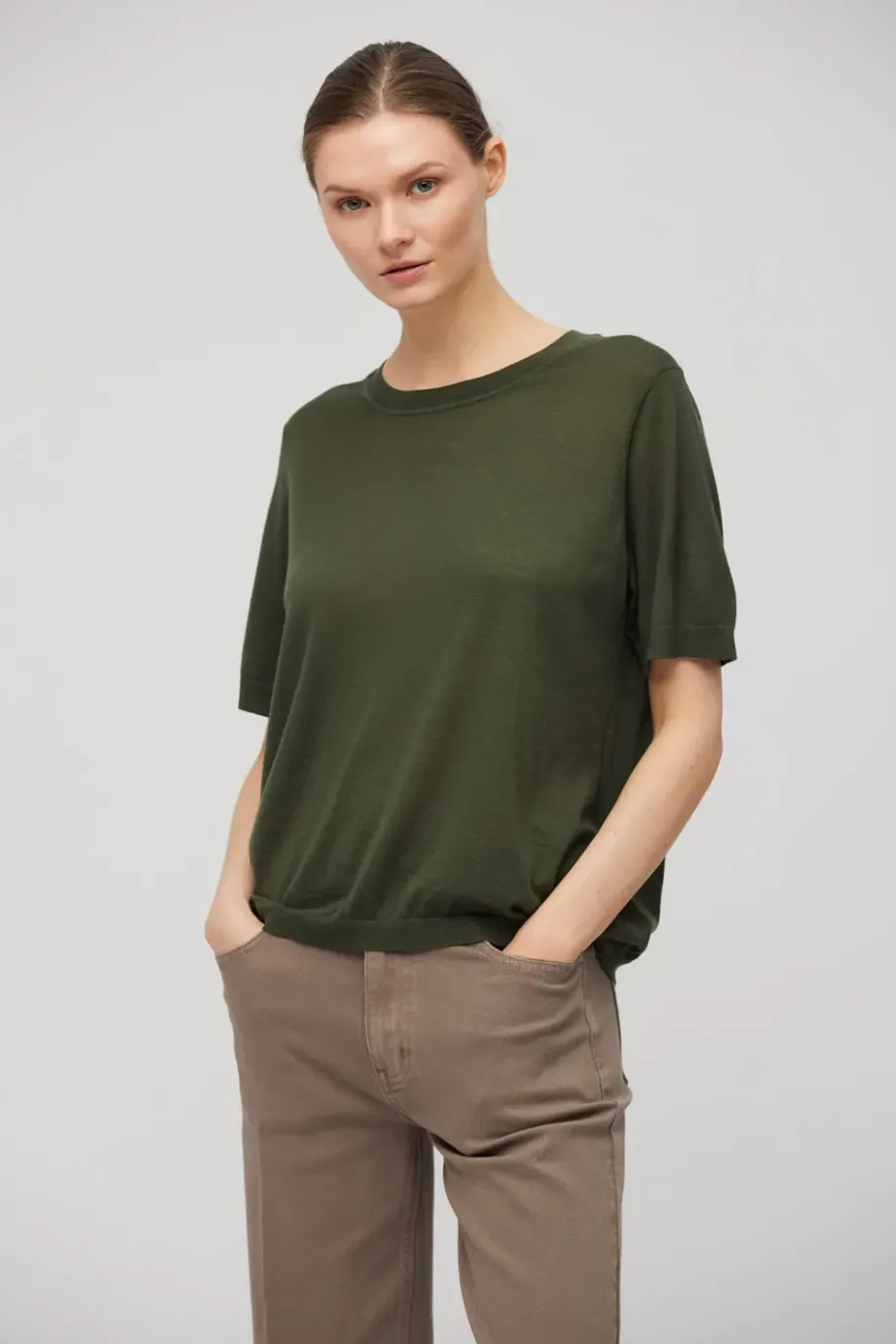 Tricou cu design simplu, cu mâneci scurte și decolteu rotund. Tricot fin și dens, tip jersey, confecționat pe mașină 18 GG. Culoare verde închis. Disponibil în două culori.